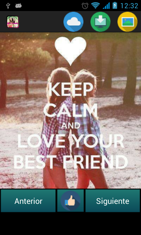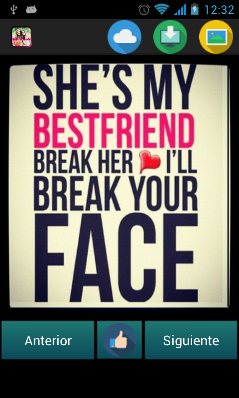 You want to surprise your best friend and do not know how? You would like to thank your friend something with a beautiful and original gesture? Then this app is what you're looking for, here you will find a selection of images and phrases about friendship. Images of all kinds, some are funny to make laugh whoever you want, and others are nice and emotional ideals to express your friendship for your best friend. Surprise whoever you want on his birthday, encourage them when they are sad or anything at any other time, always is good to praise the friendship to whoever you love. You can send the images that you like using WhatsApp, or social networks like Facebook or Twitter very easily with a button, plus you can save in the memory of your mobile phone. We are confident that this application will be very useful to make your friends feel special, and you do not have to think that words used, as there are many images with fine phrases about friendship. Also, the application takes up almost no memory on your mobile phone, has a very intuitive design easy to use and free.