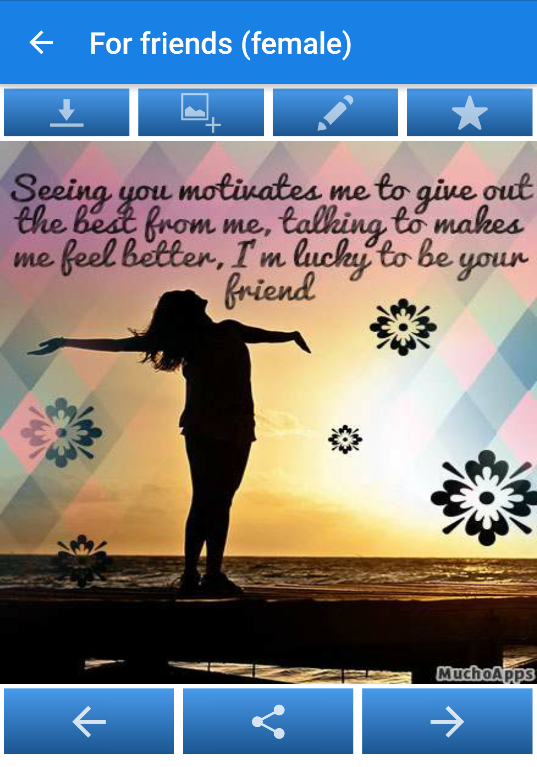 We hope you like this application. If that is the case, we would really appreciate it if you could rate it positively as this will help us to continue improving and encourage us to keep uploading more friend images and quotes.