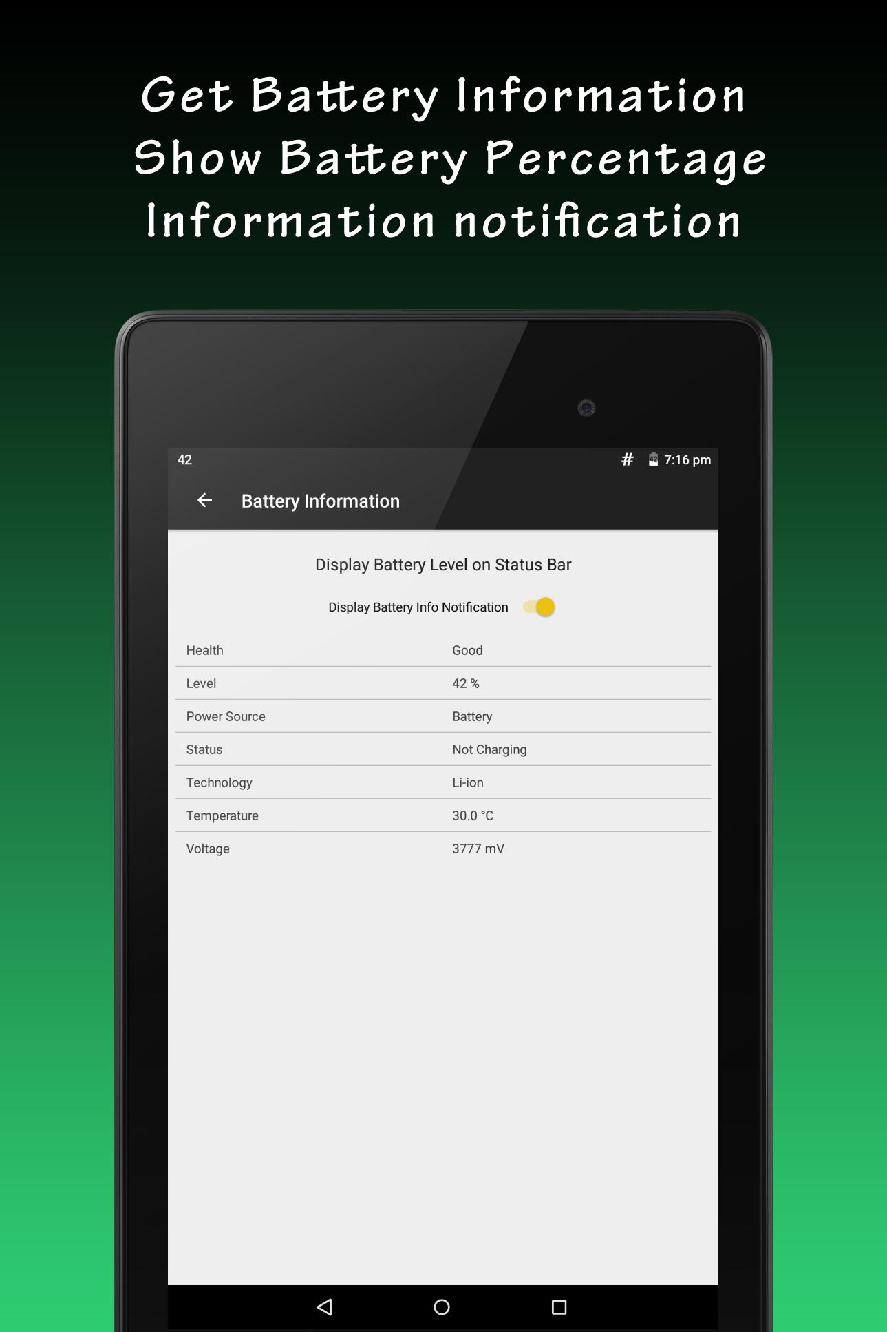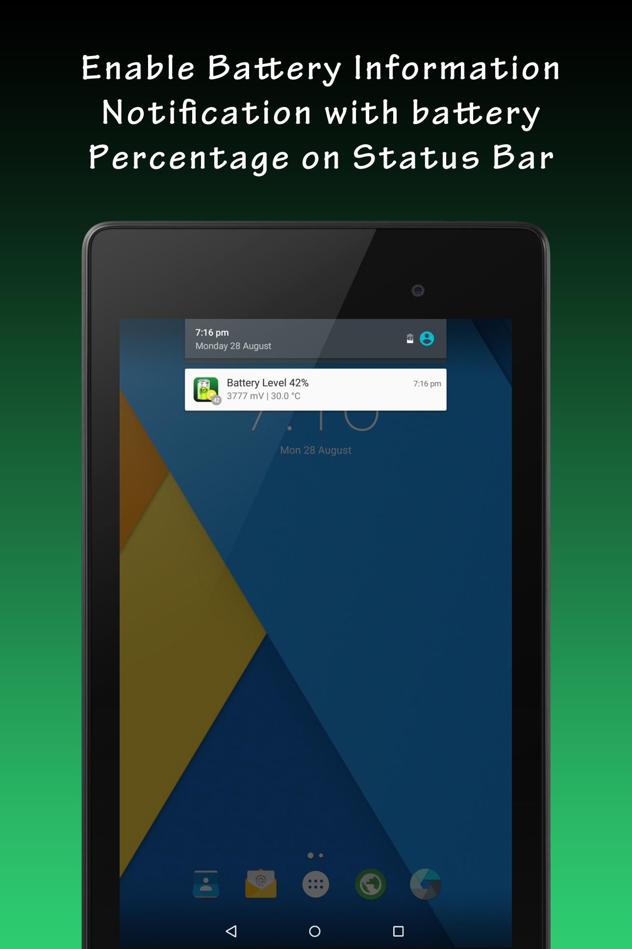 - Battery Information Notification showing temperature, level and percentage. (Battery Percent Value on Status Bar)