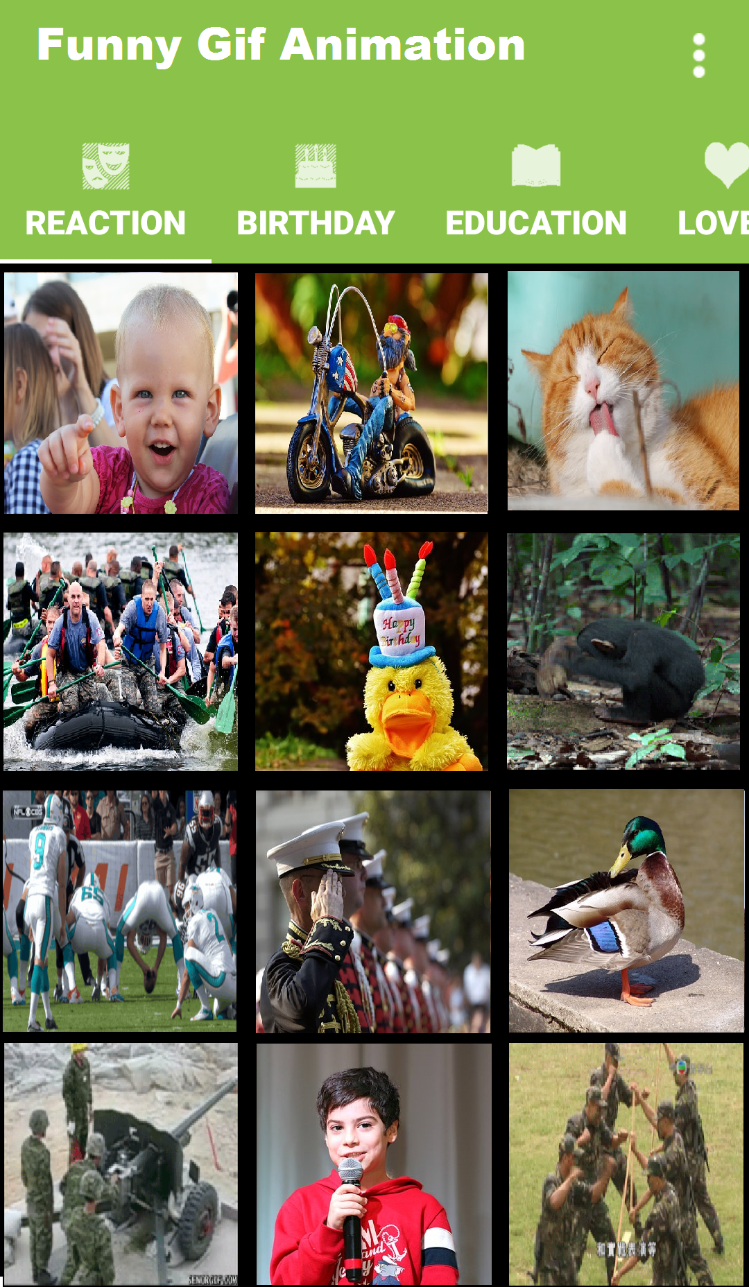 - Multiple GIF categories (Reaction, Birthday, military, politics Love, Education, Sports transport, animal and music).