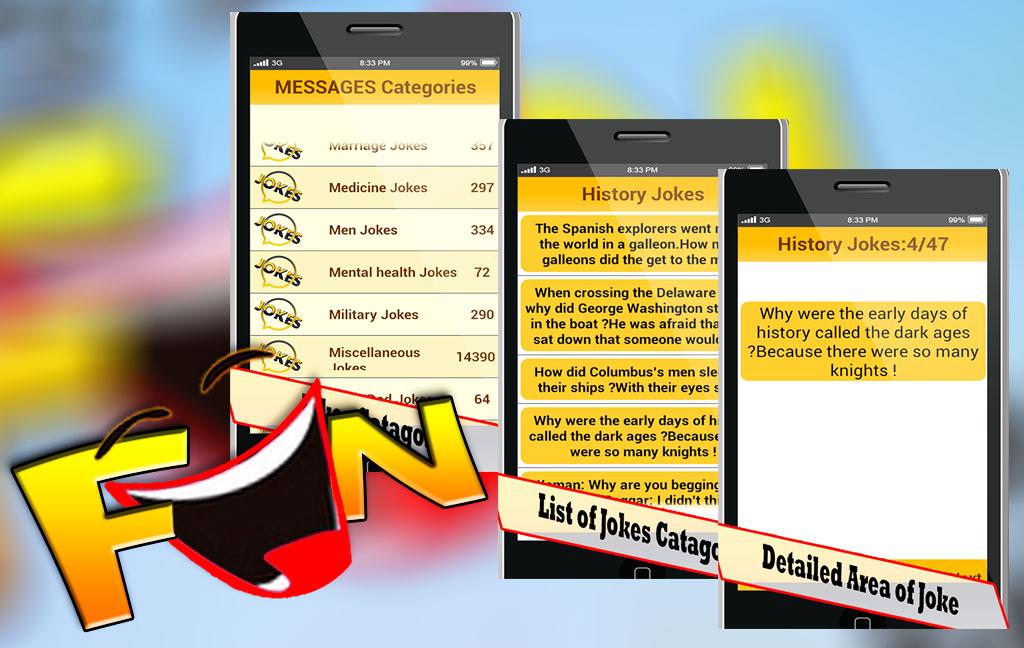 Funny and Joking SMS messages Collection for Android User, Have a lot of laugh with thousands of funny jokes, and add your own as well. We would like to give you a thousands of Free Funny Jokes in different categories. You can send jokes sms via SMS, text message etc. In this free app you would be able to find a funny joke messages to put in your Facebook status or send to the others. SMS Collection in different languages for the best..