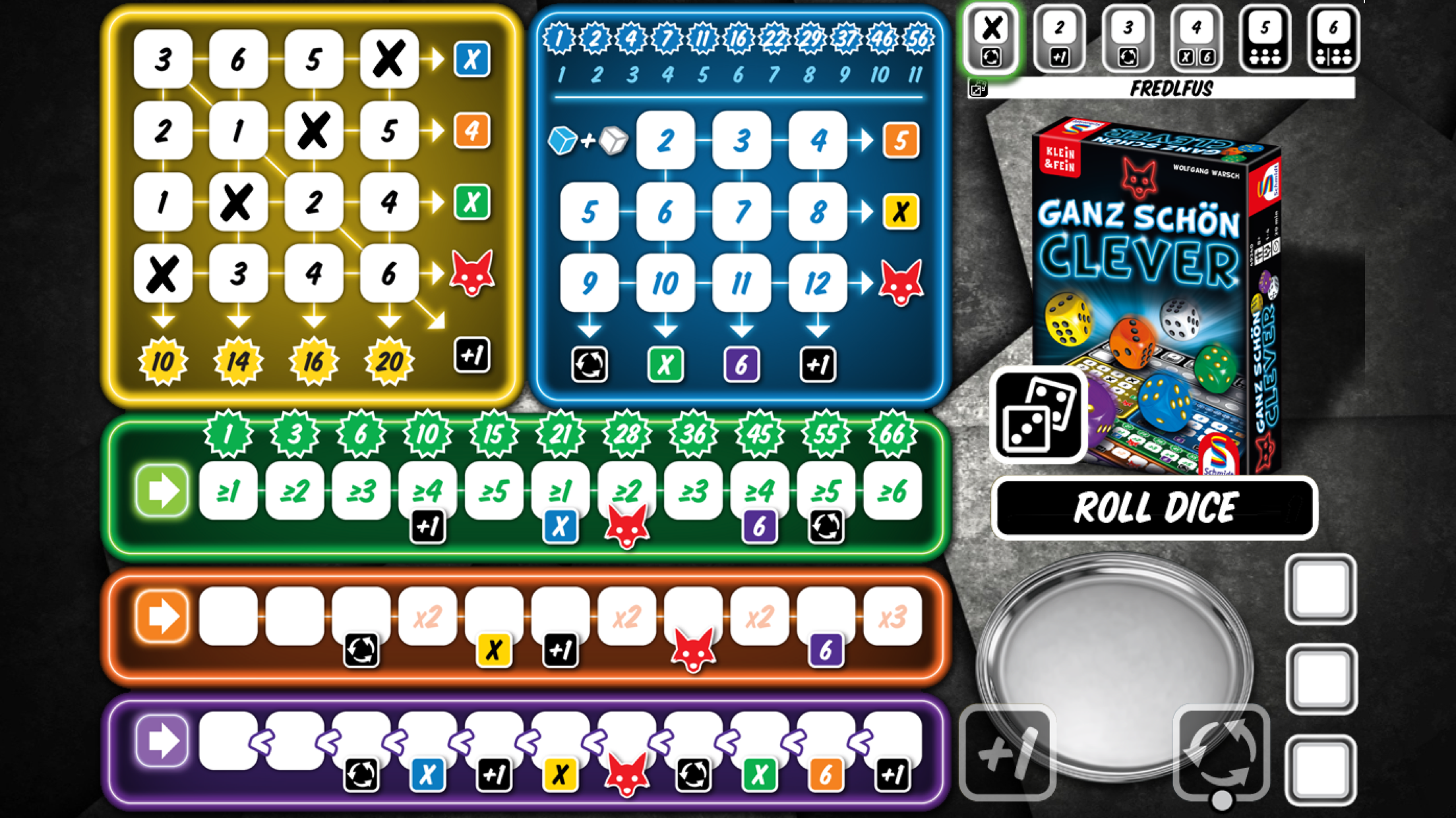"Ganz schön clever" is a fast but smart dice game for clever players of all ages. The dice want to be chosen quite clever here. Cause good choices can lead to tricky chain reactions to fill more than one field at a time. Each selected dice entered in the color-matched area which will provide victory points at the end of the game. But beware: who is too greedy and chooses the highest dice early, loses valuable moves. Collect achievements for special performances! Place in the highscore list! Hunt the highscore and compete against the worldwide community! The new hit from the "klein & fein" series. Nominated for Connoisseur's Game of the Year