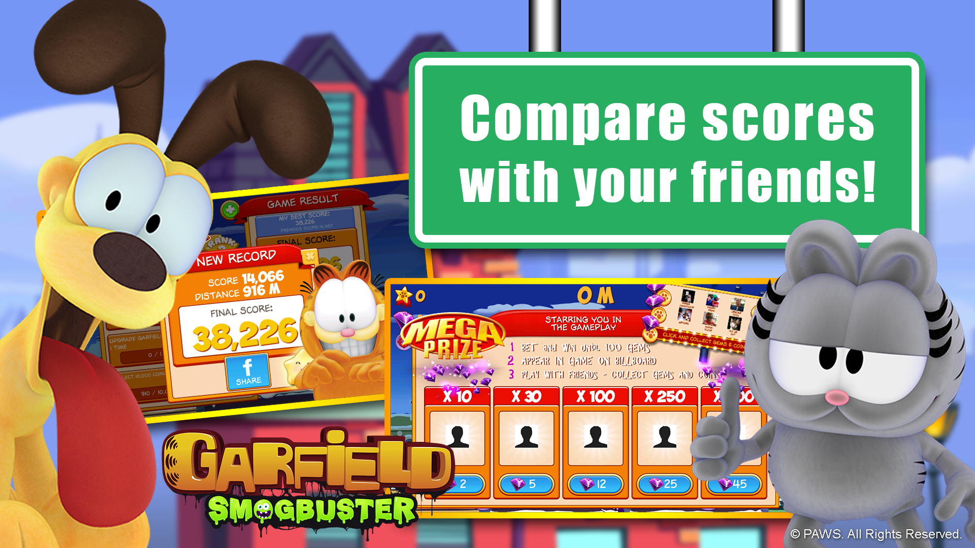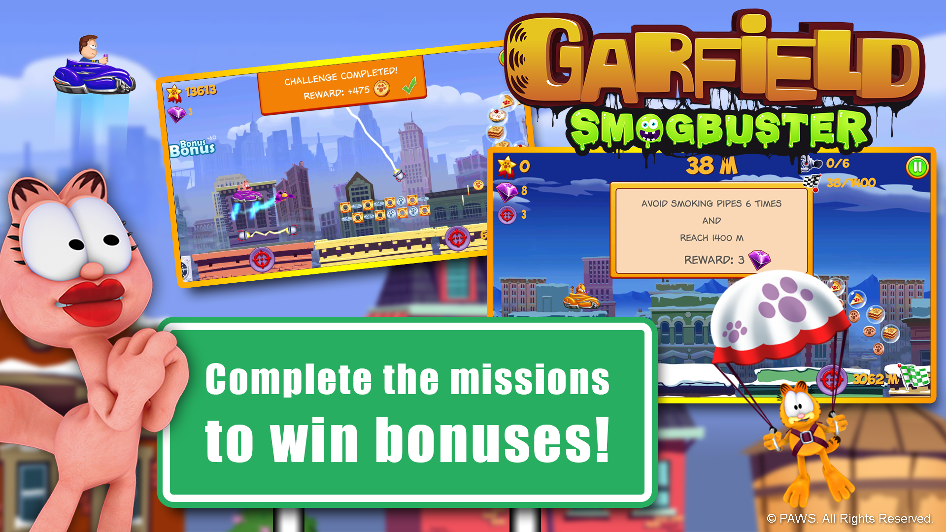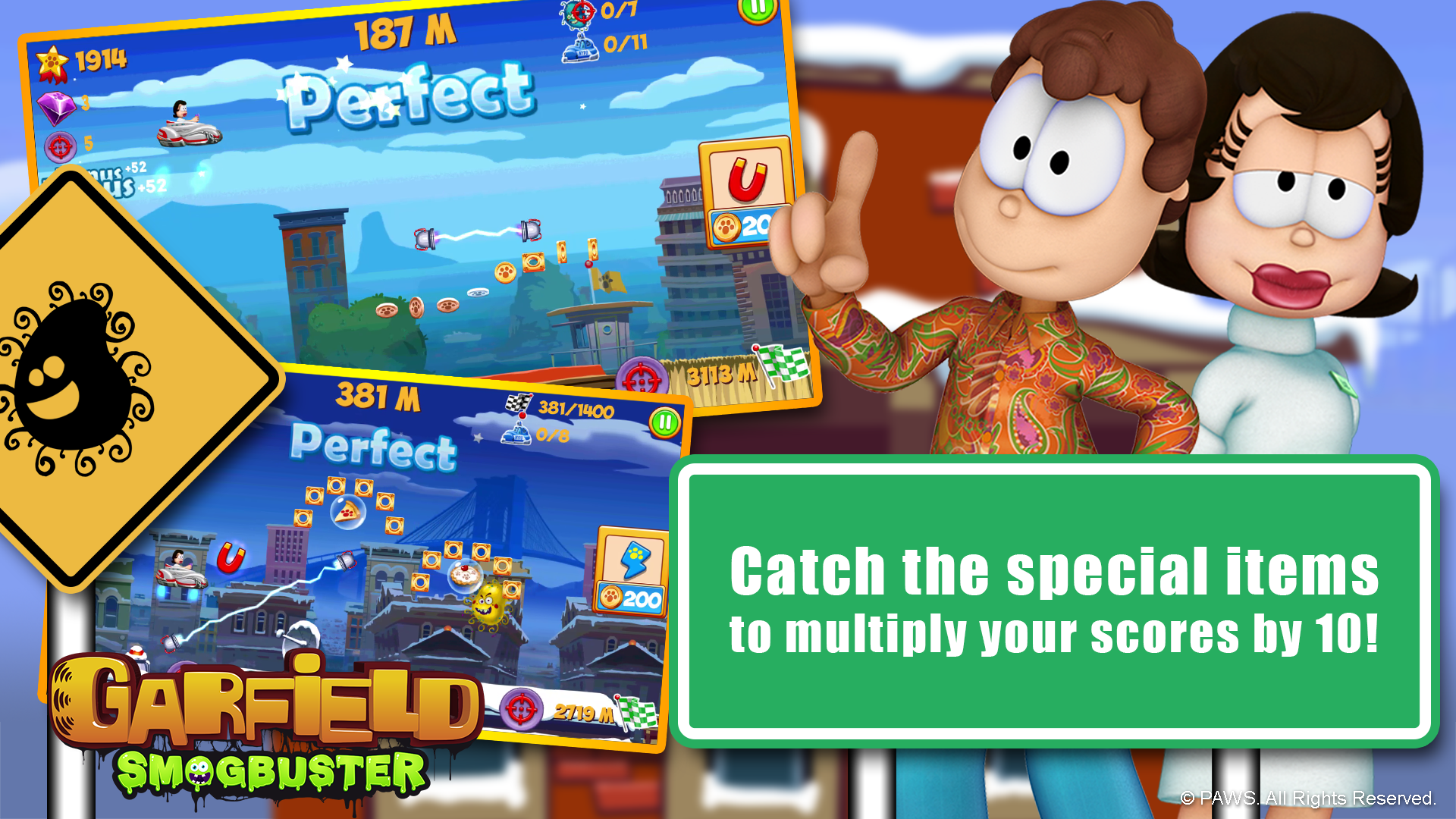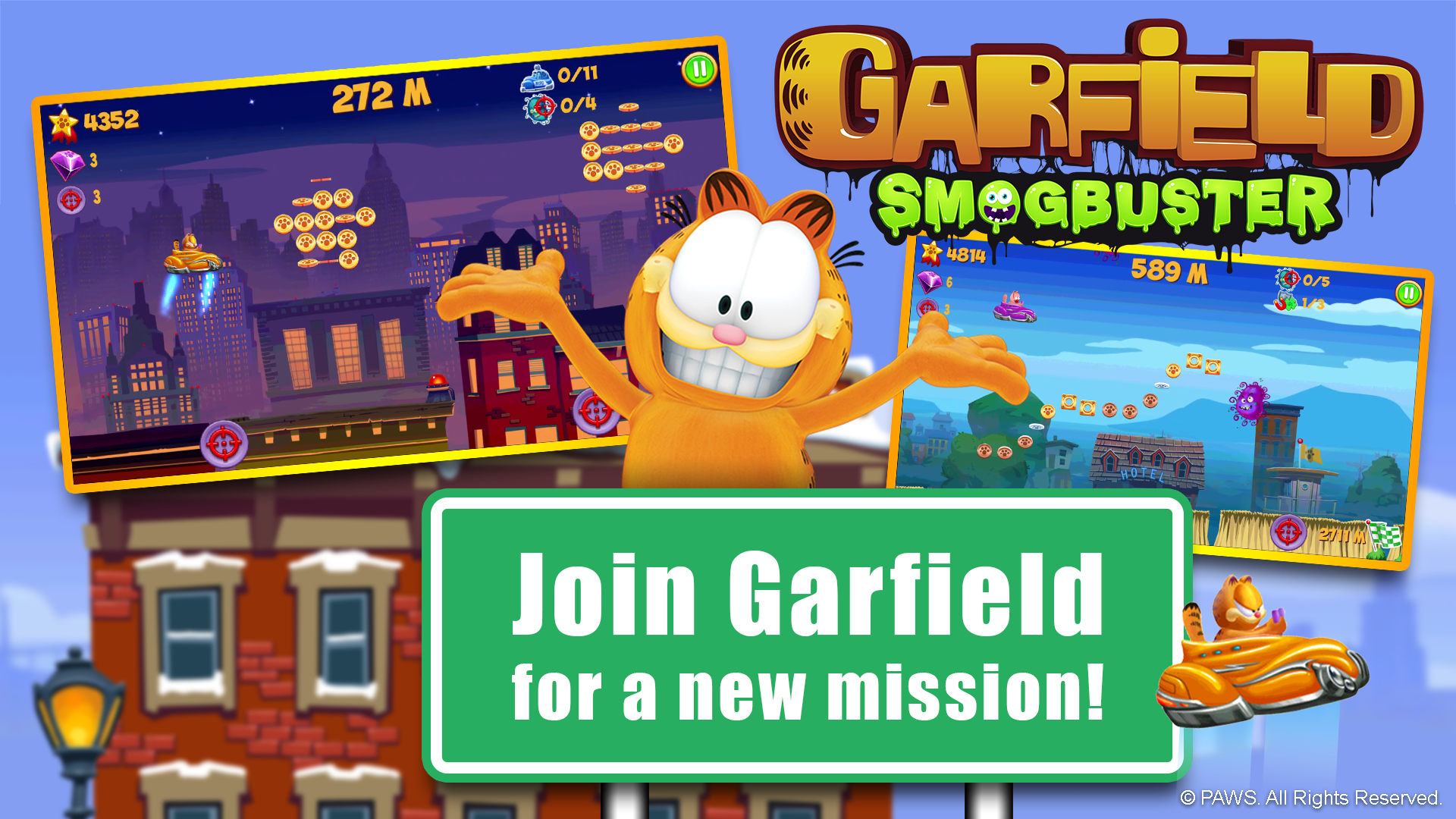 Pollution is ravaging New York! Take off with Garfield and his friends and set course for the different districts of the Big Apple. Disperse the clouds of pollution that are hovering over the city while dodging the buildings and enemies that cross your path. Use your best flying and shooting skills to fight enemies and get the highest possible score! - 8 PLAYABLE CHARACTERS: Garfield, John, Odie, Arlene, Harry, Squeak, Nermal and Liz! - Choose your favourite vehicle! - Avoid the obstacles and projectiles on your path! - Shoot enemies and collect bonus points! - Catch the special items to multiply your scores by 10! - Compare scores with your Facebook friends!