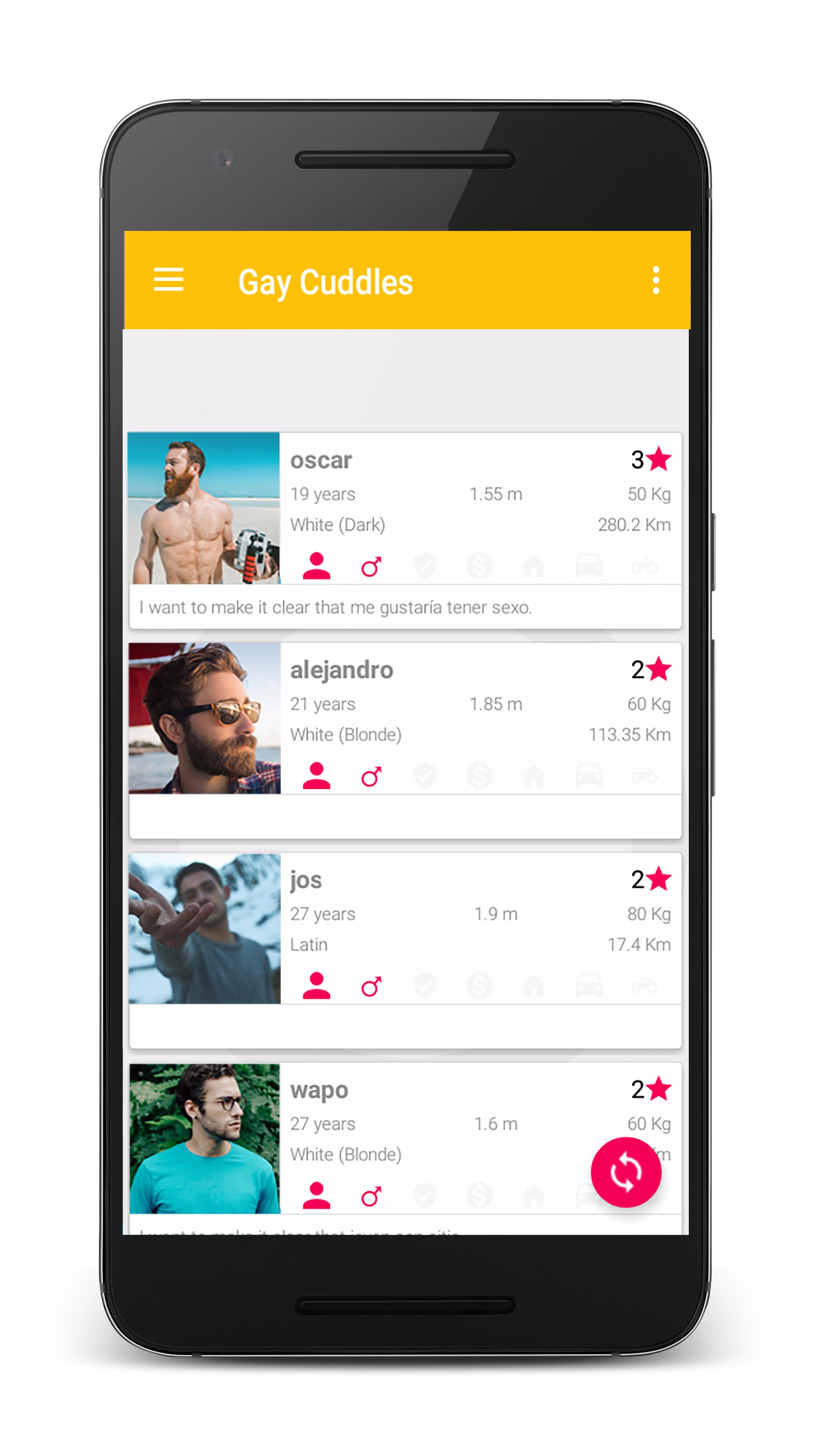 Why is so complicated or so expensive to find someone near from you? With this app you can discover people around you for free and quickly. With a very simple design this app let you get new friends and have fun. Talk with people from your country with the incorporated chat. Send messages privately indefinitely without restrictions. Simply enjoy using our app while you find new friends. Chat and meet sexy, attractive and interesting guys for free. The newly redesigned Gay Cuddles is now faster and hotter than ever: • See up to 700 guys on our location-based grid • Browse cleaner profiles with bigger photos • Chat and share private photos • Filter your search to find just the right match • Report guys quicker Gay Cuddles has someone for everyone: queers, discreets, anonymous, twinks, geeks, daddies, leathers, military, rugged, bears, otters, guys next door, colleges, muscles, bisexuals, trans. No matter what you’re looking for: relationship, friends, play, dates, love… you can find it here! So whether you’re a versatile twink looking for a queer geek or a discreet leather daddy looking for a date with an otter, the perfect match is waiting for you on Gay Cuddles. What are you waiting for? We celebrate diversity and welcome all gay, bi and transgender (LGBTQ) people to join the party. Allow Cupid to work.