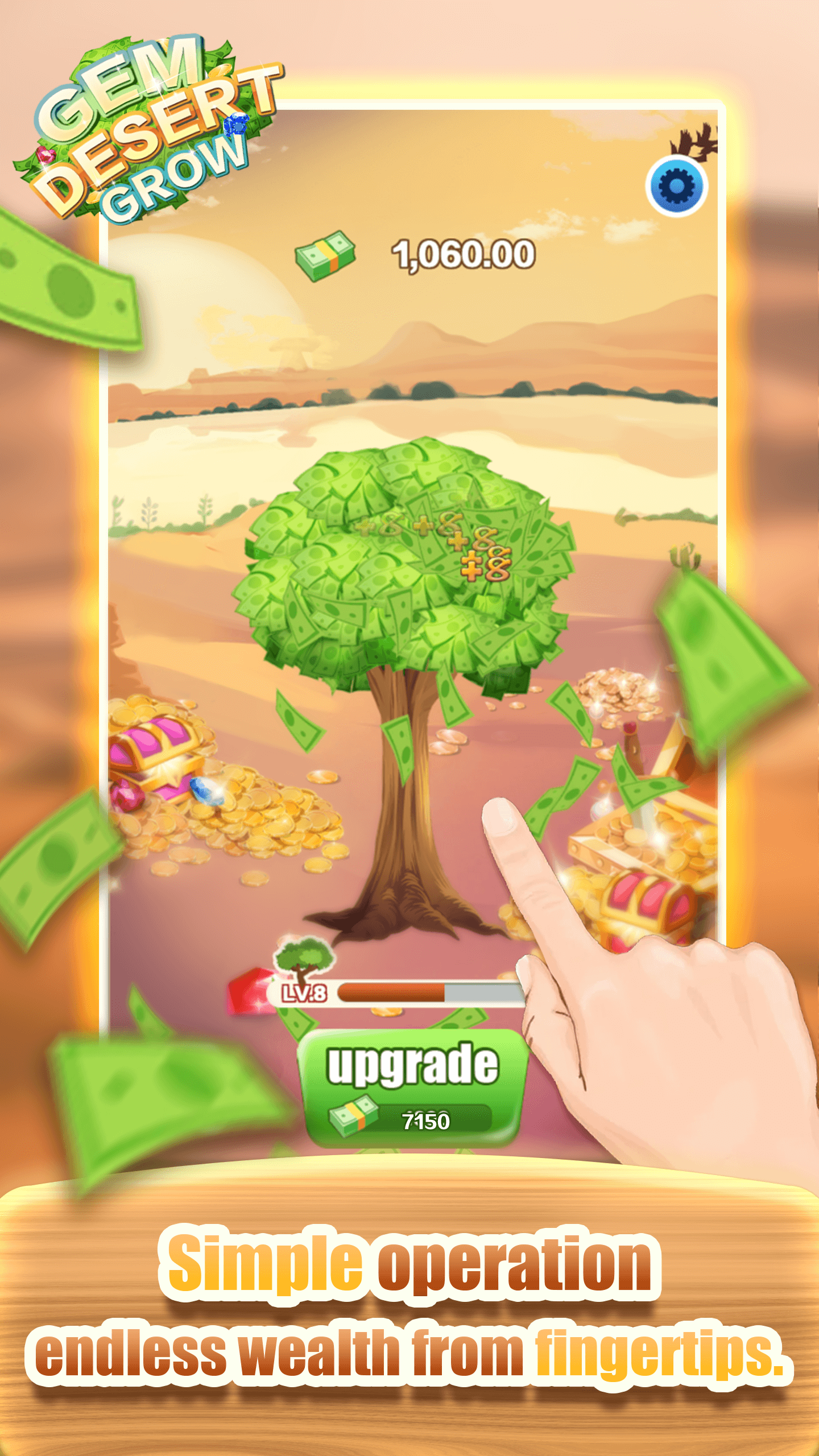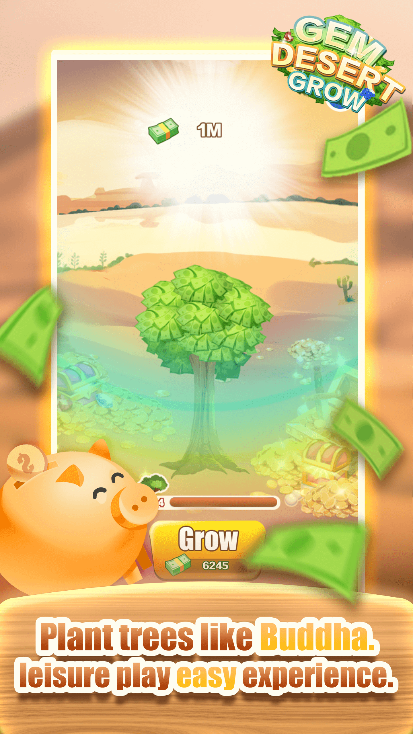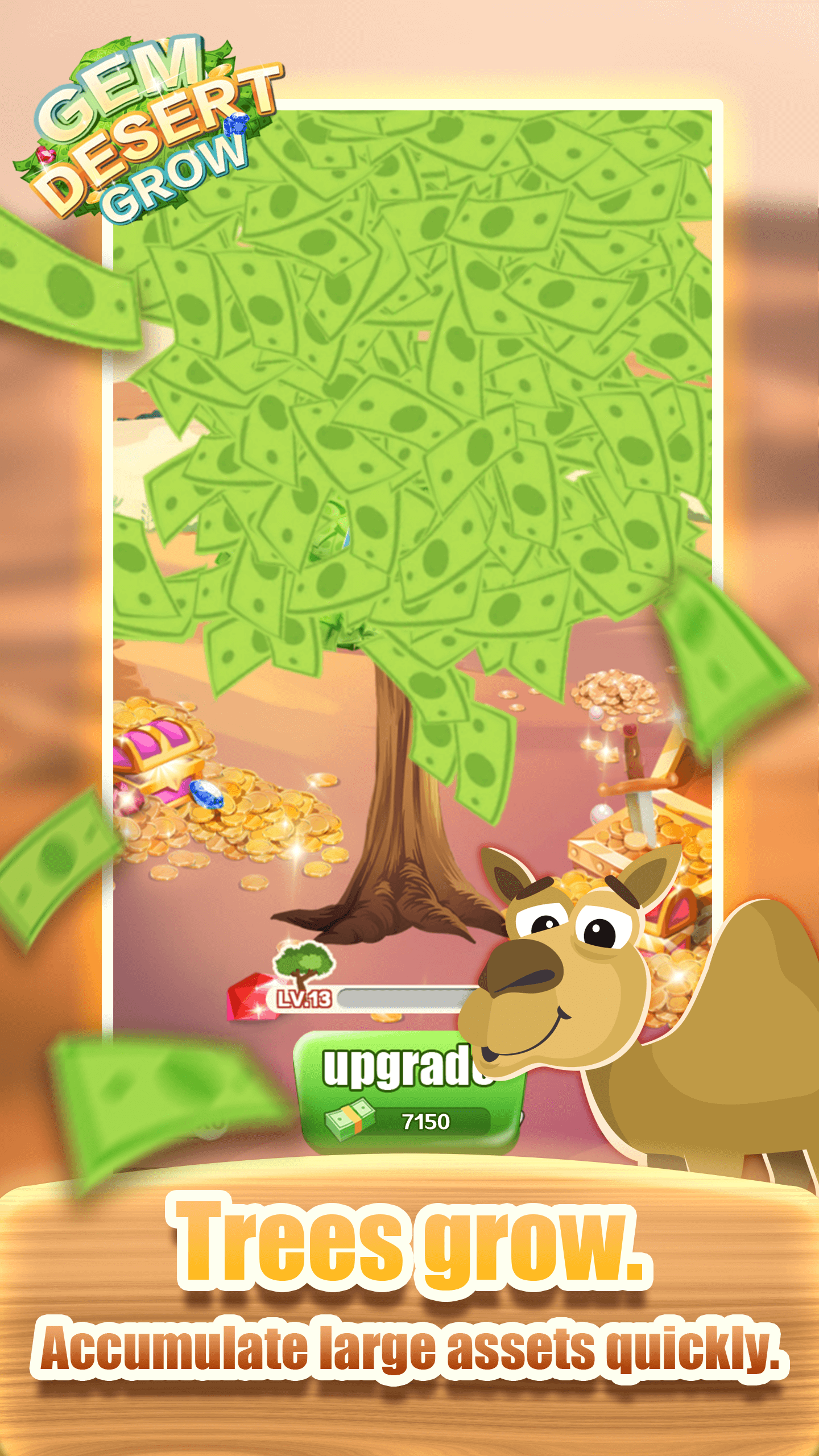 Gem Desert Grow is a casual game with the goal of growing trees and accumulating wealth. Simple operation, just click on the tree, you can get resources. With enough resources, trees can grow, and they will surprise you! Let your tree grow fast and bring life and wealth to this desert!