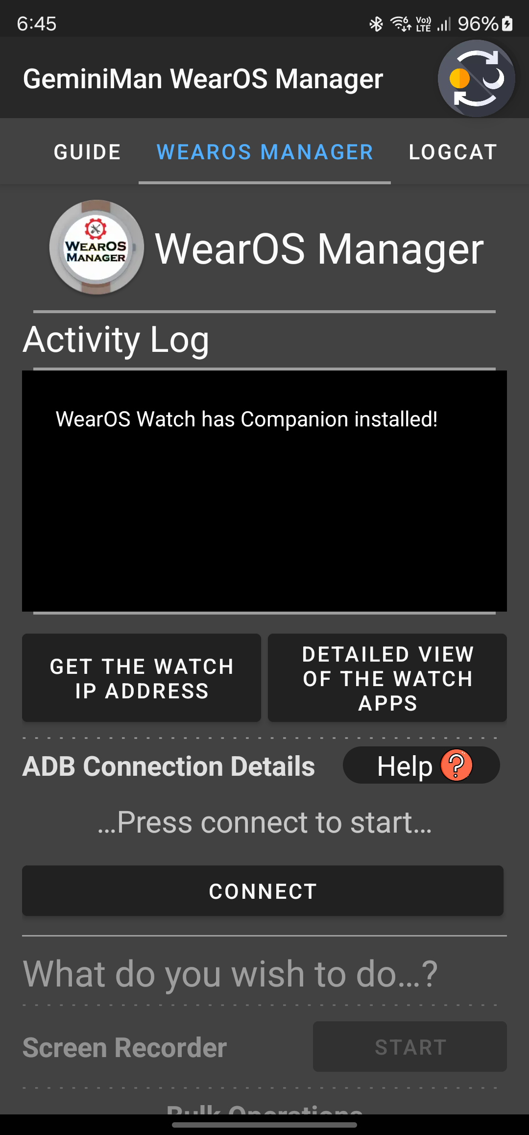 Version 5.5.0: - Greatly Enhanced the Screen Recording Ability, you will less likely have blank videos... - Updated YouTube Library to fix the issue in Guide where views show Error 404, Video not allowed to play Embed... - Added logic Warm Up, it wakes up watch companion from sleep, useful to ensure smooth adb connection... * You can always reach me if you need help! ** Your support for this project is highly appreciated. *** Please report any issues you find. I'll try to fix them all!