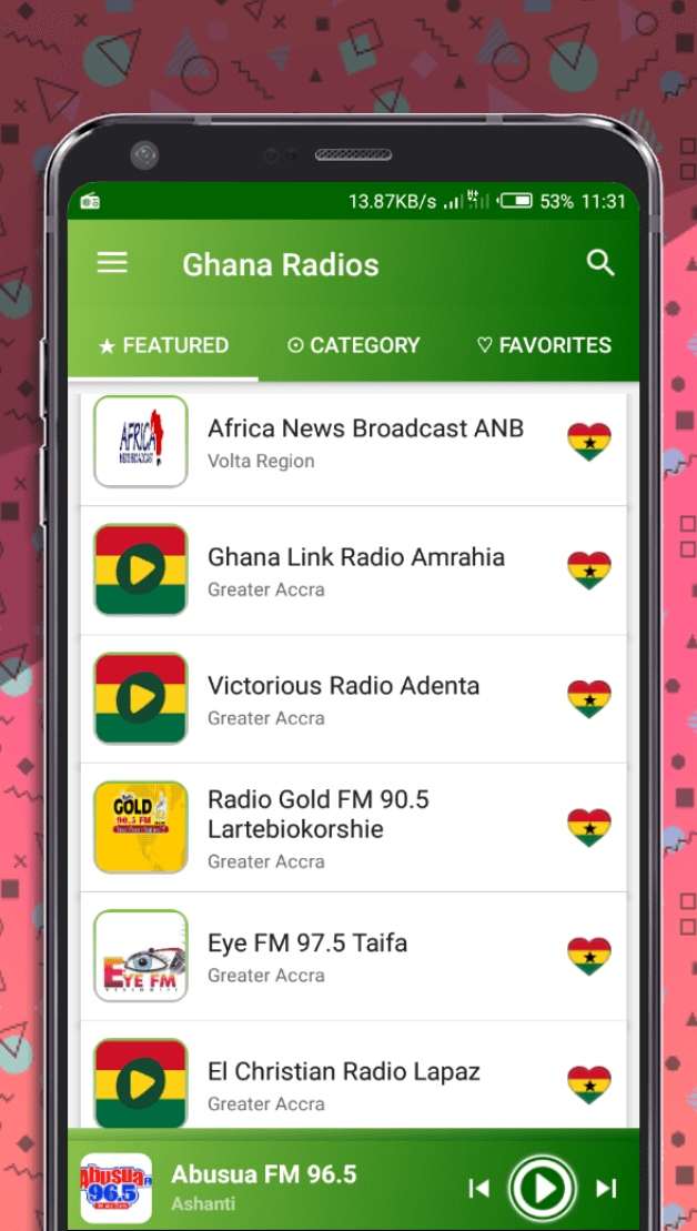 Tuning into Ghana radio stations made easy with Ghana Radios Stations FM AM Online Radio streaming App Now you can enjoy your favorite radio programmes in superior audio quality! Get informed and inspired! Discover all the best rated AM, FM and internet radio stations from all corners of Ghana, and listen to the station that fits your tastes including those that feature non-stop Ghana Music, 24/7 Ghana News, Ghana Movies, Ghana Church Live Stream, 24/7 Ghana Gospel Music, Live Sports news & commentary, Ghana Radio Talk Shows, Ghana Highlife Music, Azonto music, Kpangolo Music, Hiplife music, Akan music, Ewe Music, and many more. Over 300 radio stations from all the regions in Ghana and also Ghanaian radio stations in US, Canada, France, UK, Jamaica and interesting location around the world. Golden Star 89.3 FM Agona Swedru IMC Radio Trust FM Achimota Native Radio (NTEnT) Papalaw Radio Tema Grey Radio Tema The Original Word Radio Brainz FM Buduburam WIGCS Radio Buduburam WIGCS Xtra Radio Buduburam Ofa Radio Delight 99.3 FM NK Radio Nkawkaw Obuoba FM 91.7 Nkawkaw Gospelcity Online Radio Nkawkaw Obaatanpa Radio Xgee Radio Blanka Radio Raycin Radio Bujanyz Radio, Kasoa Touch Radio, Cape Coast Omega GE radio Kojo Andoh Radio Kastle 90.3 FM Fante One Radio ATL 100.5 FM Agyaanom Radio Y97.9FM Voxxgh Radio Unity 88.7 FM, Takoradi Sek Tadi Catholic Radio Sam's Radio Gh Mighty Jesus Radio Lyke Radio Faith Winners Radio Connect 97.1 FM Y102.5FM, Kumasi Wontumi Radio 101.3 FM WalkMuxic Radio, Kumasi Time 96.9 FM Spirit 88.3 FM Smartgospels Radio Silver 98.3 FM Sankofa Radio Radio Village Pure 95.7 FM Prophet Francis Kwateng Radio Oyerepa FM Otec 102.9 FM Opemsuo 104.7 FM Oliv GH Radio Ndwompa Radio Kyidomonline Radio Kessben 93.3 FM Jordan Radio Hello 101.5 FM GNGMA Radio Ghana Life Radio GH Radio1 GH Afric Radio 1 Gate Of Liberty Radio Fox 97.9 FM Ezra 94.1 FM Crusaders Radio Christ Radio Online Asanteman Radio Apostle Abel Radio Angel FM 96.1 Ananse Radio Akoma 87.9 FM Adepa Radio Abusua FM 96.5 1Figure Radio Yonkopa 89.1 FM Y107.9 FM XliveAfrica TCA Radio Sunny 88.7 FM Sunlight Radio Starr FM 103.5, Accra Spirit 100.0 FM Regies Radio Rainbow Radio 87.7 FM Radio XYZ 93.1 FM Radio Univers 105.7 FM Radio GIJ 97.7 FM Radio Ghana Radio Angelus Raanod Radio Power 97.9 FM Accra Peace FM 104.3 PDJ Radio PAB-MC GH Radio Onua FM 95.1 Oman FM 107.1 Okordie Krom Radio Okay FM 101.7 ODK Radio Neat FM 100.9 Musiga Radio Memrenie Radio Max FM 89.7 LoversGh Radio Live FM 91.9 Lens Radio Kingdom FM 107.7 Kente Radio Kasapa FM 102.5 Arena of Faith Radio Jet Radio Ghana Happy FM 98.9 Guide Radio FM 91.5 Groove 101 Goodies Radio Globeserve FM Glive Radio Ghana Waves Radio Ghana Today Radio Ghana Music Radio GBC Ghana Online Enews Radio 3FM 92.7 Accra24 Alive Ghana News Angel FM 102.9 Apple 68 FM Dahlin Radio D FM Class FM 91.3 City Of Shiloh Radio Citi FM 97.3 Bujanyz Radio Bosco Radio Ghana Blessed Adonai Radio Benzi Radio ASSPA Radio Aseda Radio Asaase FM 99.5 Connect with us on Facebook & Twitter: @GhanaRadioStations