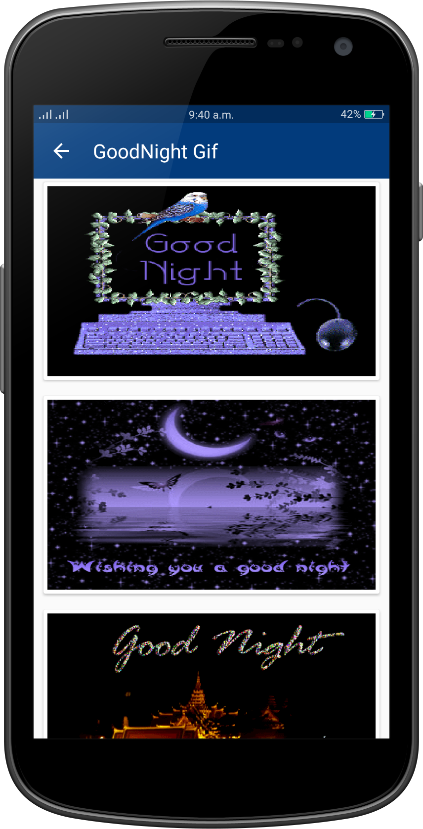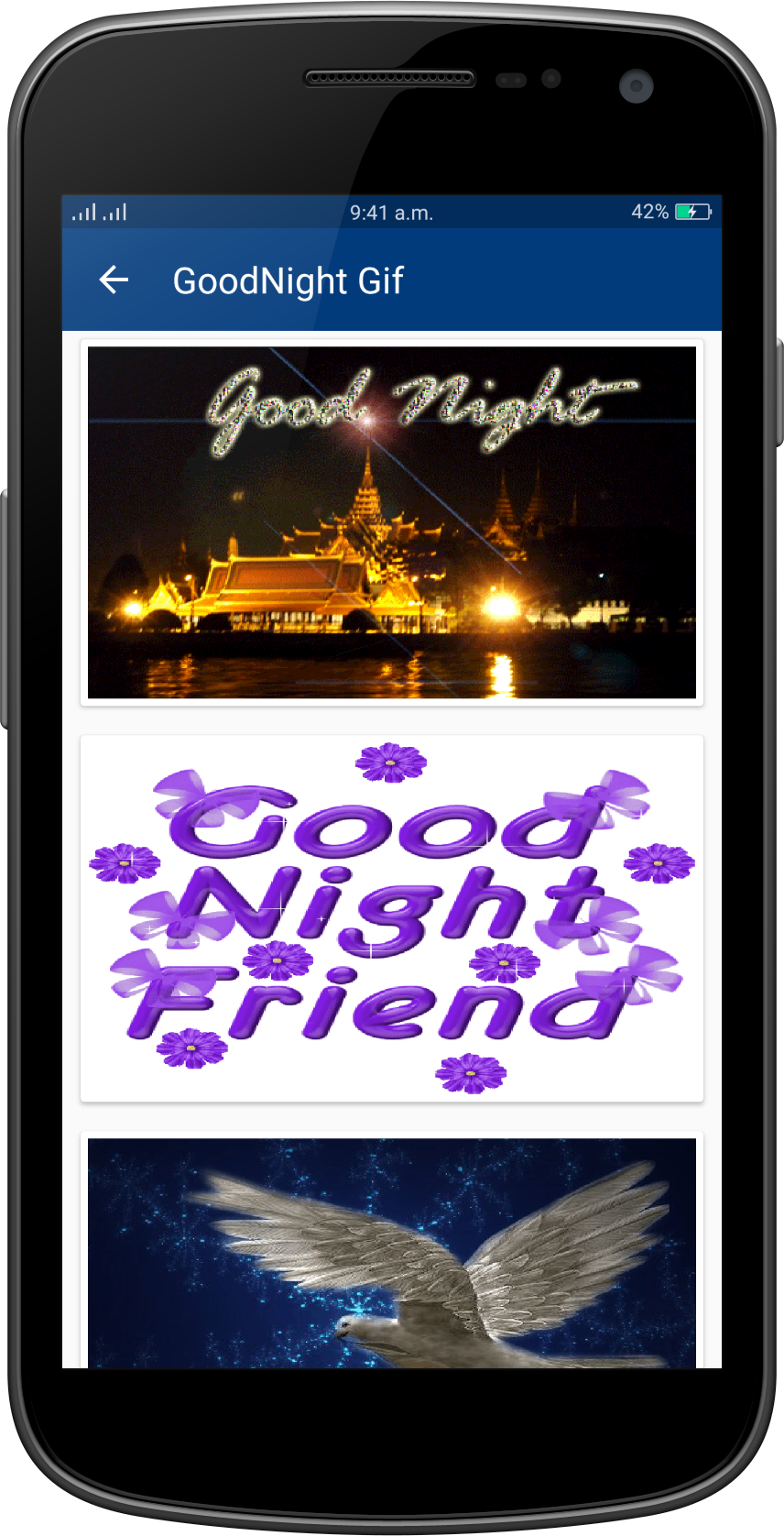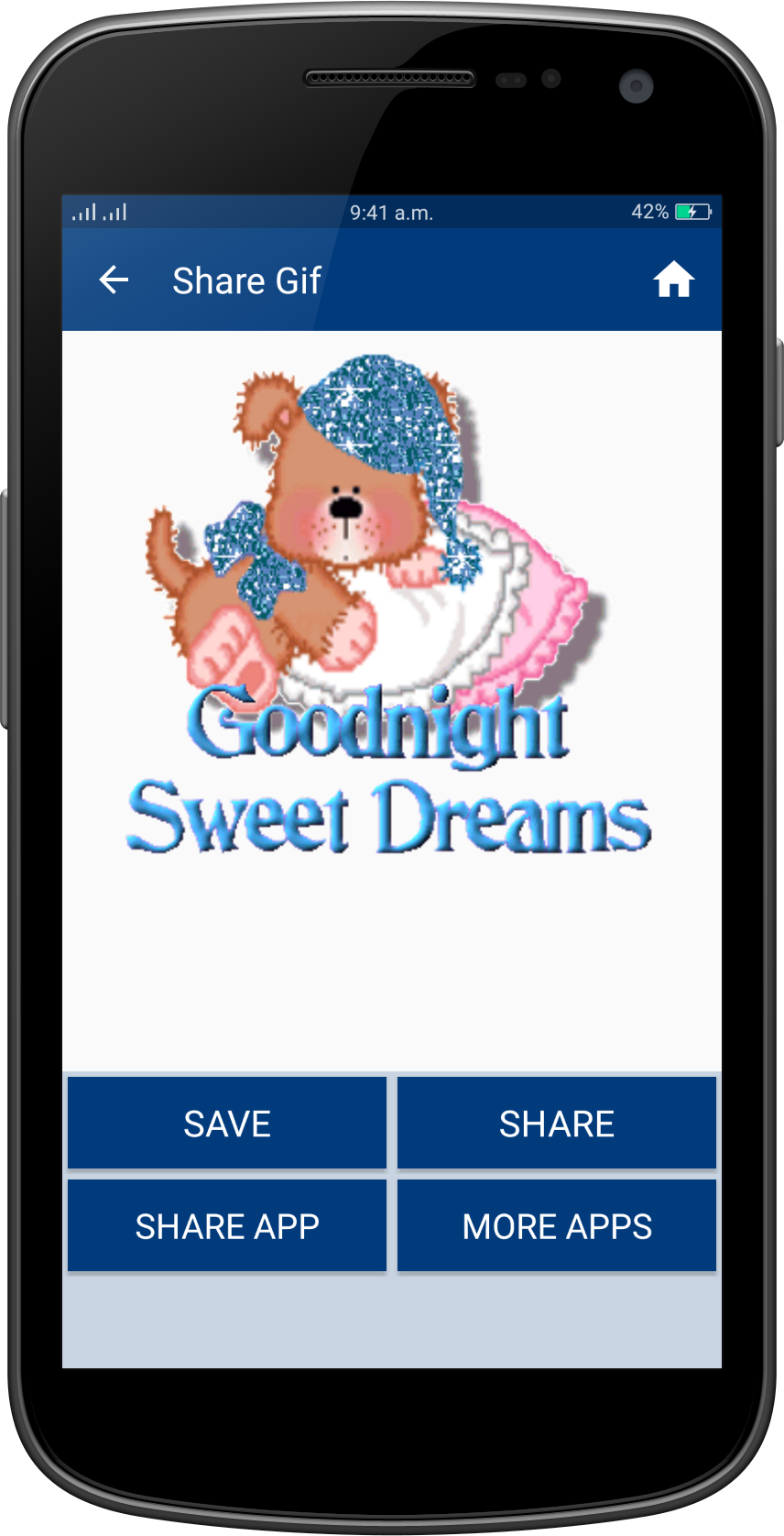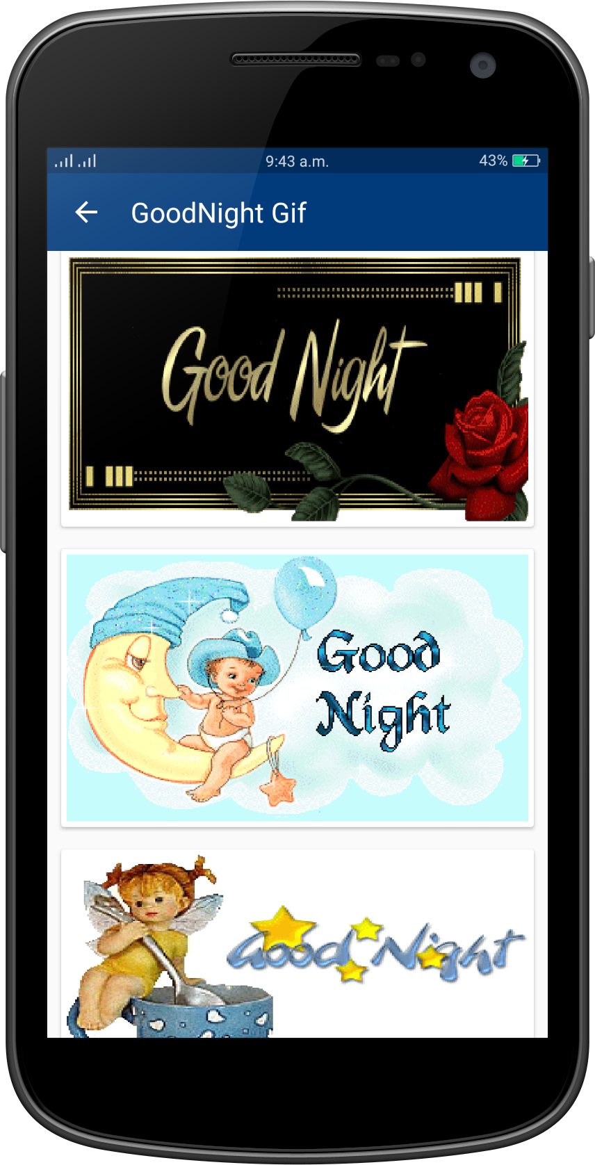 Good Night Gif Collection Wish you a Very Very Good Night to all my friends!!! "GoodNight Gifs" is a collection of the best GoodNight gif (animated Gifs) that are easy to save and share with friends in social networks. Gif GoodNight application help to wish happy GoodNight with your friends and other . this application help to best wishes of GoodNight wish. You can say happy GoodNight to your friends, your lover, or your family, relatives, colleagues, at night everyday by sending a greeting GoodNight Gif Or picture or message or quotes card. There are a lot of beautiful GoodNight Gif Images on this app. GoodNight Gif, GoodNight 2017 gif, GoodNight gif 2017, GoodNight gif, Happy Love GoodNight gif, GoodNight gif, Very Happy Love GoodNight day gif, GoodNight Wishes Gif, Wishes Gifs, Best GoodNight gif greetings, GoodNight love Gif Collection, New Gif, Latest Gif, animated gif, amazing Gifs. App Features: - Material design - Easy To Use - Nice collection of GoodNight Gif - Fast speed - Save GoodNight images to SD card - Save & share GoodNight Gif to your friends. - Totally free application - No limits in daily downloads - Easy user interface GoodNight gif easy to download, share and / or send to the person you want through Facebook, Instragram, Pinterest, Tuenti, Google+, Twitter,WhatsApp, Line, kype, Telegram, WeChat. .. or on your favorite social networks. Regular updates with new GoodNight gif, animated gif GoodNight forever, happy day GoodNight cards, messages ...