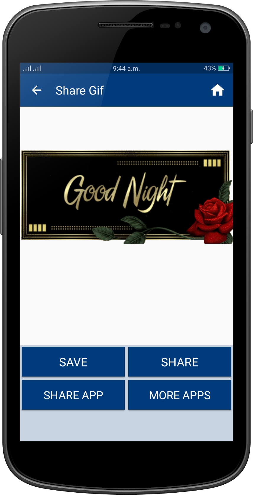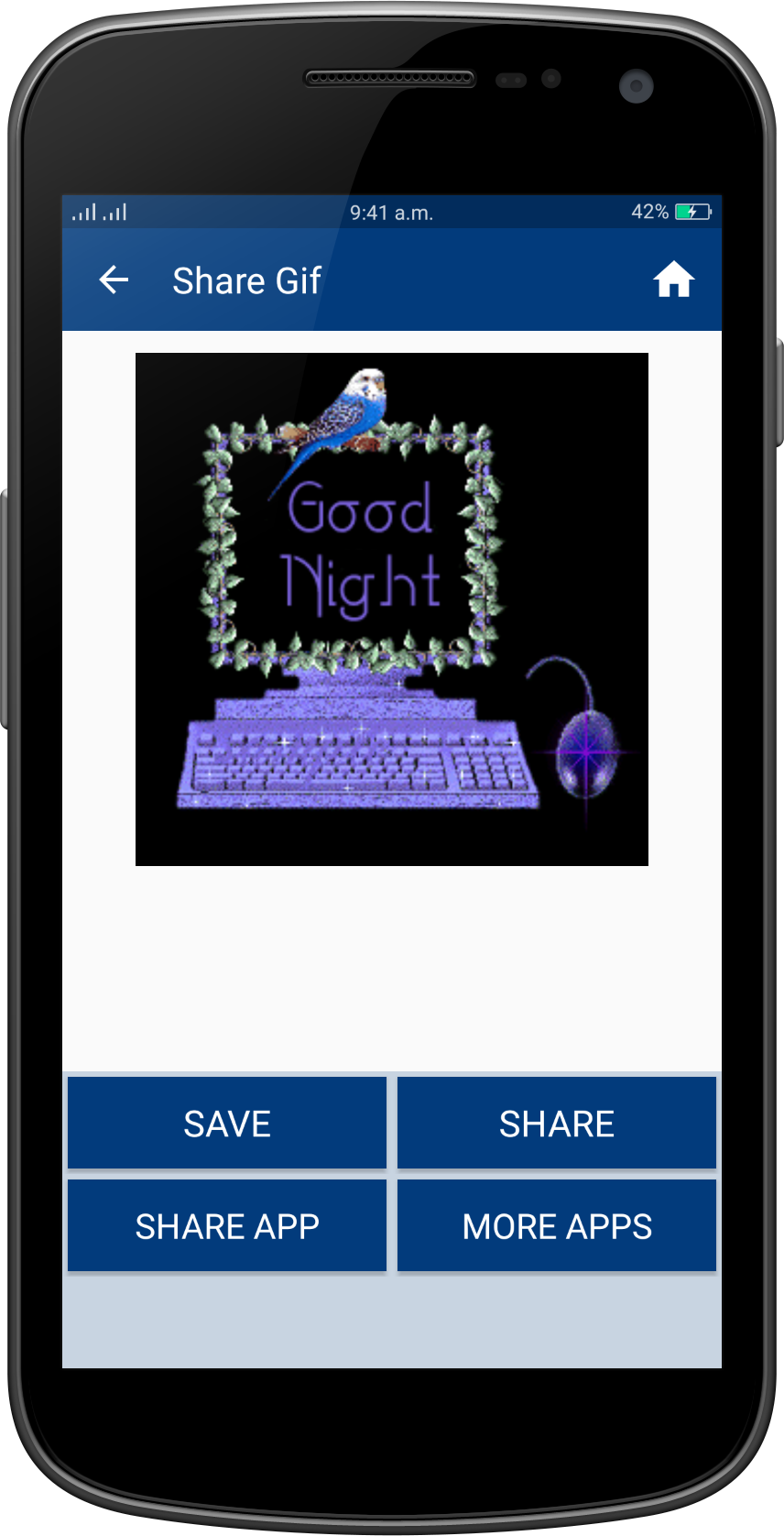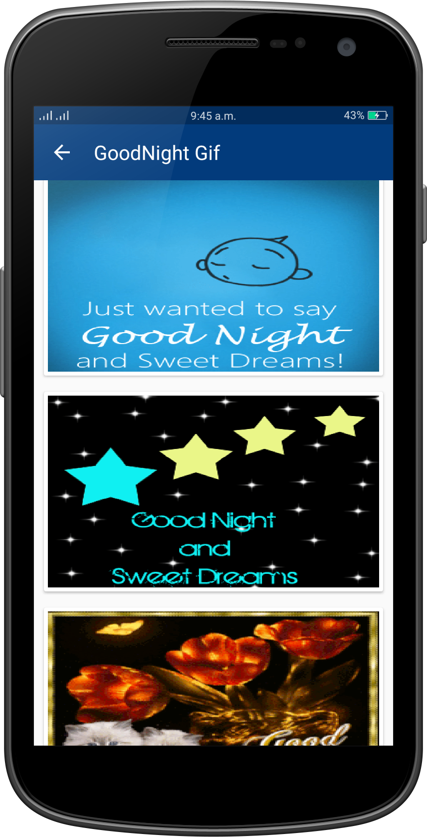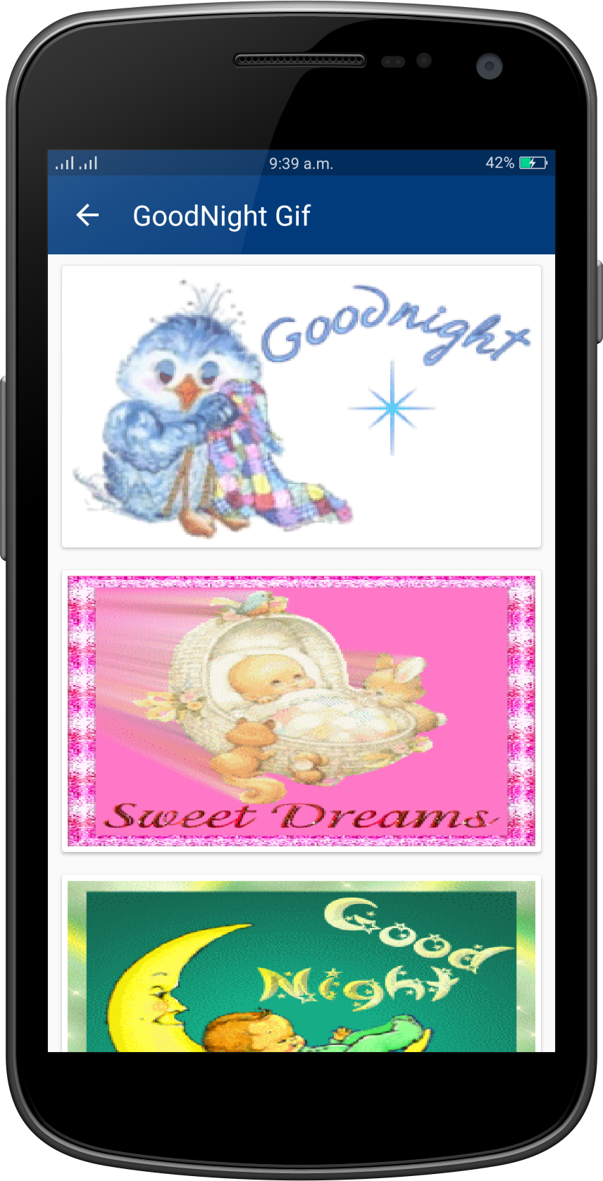 Good Night Gif Collection Wish you a Very Very Good Night to all my friends!!! "GoodNight Gifs" is a collection of the best GoodNight gif (animated Gifs) that are easy to save and share with friends in social networks. Gif GoodNight application help to wish happy GoodNight with your friends and other . this application help to best wishes of GoodNight wish. You can say happy GoodNight to your friends, your lover, or your family, relatives, colleagues, at night everyday by sending a greeting GoodNight Gif Or picture or message or quotes card. There are a lot of beautiful GoodNight Gif Images on this app. GoodNight Gif, GoodNight 2017 gif, GoodNight gif 2017, GoodNight gif, Happy Love GoodNight gif, GoodNight gif, Very Happy Love GoodNight day gif, GoodNight Wishes Gif, Wishes Gifs, Best GoodNight gif greetings, GoodNight love Gif Collection, New Gif, Latest Gif, animated gif, amazing Gifs. App Features: - Material design - Easy To Use - Nice collection of GoodNight Gif - Fast speed - Save GoodNight images to SD card - Save & share GoodNight Gif to your friends. - Totally free application - No limits in daily downloads - Easy user interface GoodNight gif easy to download, share and / or send to the person you want through Facebook, Instragram, Pinterest, Tuenti, Google+, Twitter,WhatsApp, Line, kype, Telegram, WeChat. .. or on your favorite social networks. Regular updates with new GoodNight gif, animated gif GoodNight forever, happy day GoodNight cards, messages ...