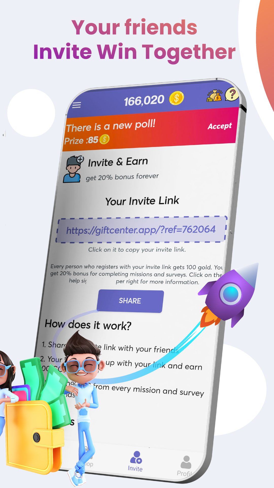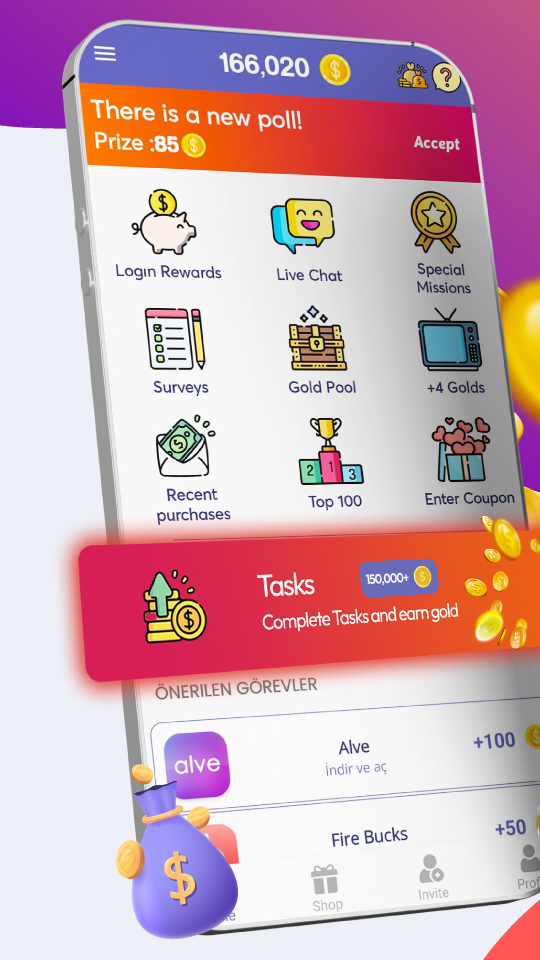 Would you like to earn gift cards for free? If so, Gift Center is perfect for you! With this diamond earning app, you can easily earn gift cards, random keys, credits, UC, RP or VP codes as you do tasks. It is one of the best gift card apps! Are you ready to win gift cards free with this task based earning app? With Gift Center, you can get any product you want without paying any fee. Choose one of the dozens of categories in the store; collect coins, earn game rewards & buy what you want! Nowadays, promo code apps are very popular. We thought of all the details when we developed this UC collect app to provide the best user experience for you! You can get game redeem codes and shopping vouchers for free. All you have to do is collect coin. To collect gold, you can watch quests, surveys and advertisements. They are simple and fun. Remember, as the Gift Center team, we work to provide free products to our users. With the Gift Center, you can buy the products you want by playing games without getting bored. FEATURES - Complete tasks to earn gold - Obtain E-pin codes with gold - Neptun, Jupiter, Saturn, Mars & Moon missions - Invite your friends to earn more gold - Get up to 40% gold from gold pool - Scratch to earn between 20 and 250 gold - Be among the first 100 people to receive Top 100 awards To use Gift Center, you must have a Google account. If you encounter any problems or errors, you can send us a ticket, talk to live support, or get information by reading the articles. To get help, you can enter the "Website" section from the "developer contact information" section. Or, you can click on the help icon in the upper right corner of the application. Our application is not finished yet, it is under development. We are working on more easy, simple and fast gold-earning features for you, our valued users. Don't just play games, earn game codes and shopping vouchers while playing with Gift Center! Download Gift Center now and start earning.