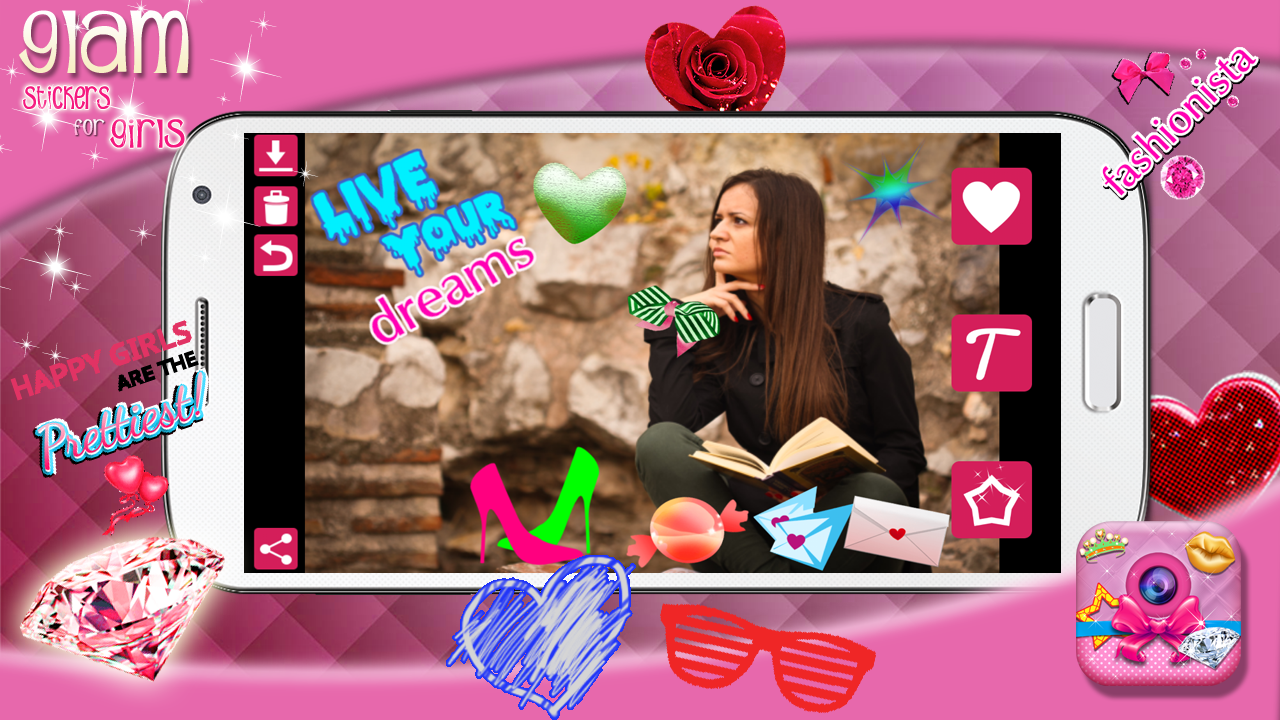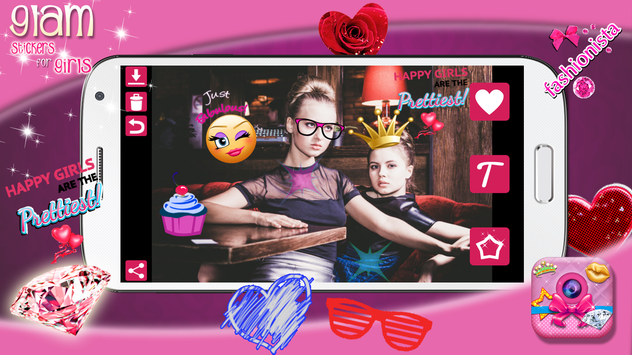 Hello, photography fans! Are you ready to edit pictures in the most glamorous manner? We offer you an amazing collection of photo stickers for your favorite pictures. Download Glam Photo Stickers for Girls and enjoy in the best “photo editing” experience! Features: A brush icon which lets you select categories of decorative stickers. A pen icon which lets you choose cute textual stickers. A wand icon which lets you choose effects and sparks. User – friendly interface - simple tap and swipe controls. Glam Photo Stickers for Girls contains a collection of picture stickers for all social networks. If you're a fan of photography and everything that's related to photo editing, this is an excellent “image editing app” for you. Upload your favorite selfie photographs, pictures of your friends and family, and add stickers, effects, and text to them. Add watermarks of your choice and stamps and let the fun begin. Prepare for the best photo editing adventure. Add cute stickers of all kinds: lips, hearts, stars, hats, and candies. Make your pictures look glamorous and sophisticated with glittering effects and shiny stars. Your fabulous selfies will become even more extravagant with cute text stickers that this amazing “photo editor” offers. Download Glam Photo Stickers for Girls today and start experimenting right now. Share your art on all social networks. Your followers will be thrilled to see your beautiful pictures edited in a lovely manner with cute photo stickers for girls and for boys. When you're finished with this amazing pic decorating activity, you can post your photo art on your wall and give your friends an opportunity to like your pictures. The options that free app Glam Photo Stickers for Girls offers are numerous and all you have to do is make a choice. Decorate pictures with this amazing collection and feel like a celebrity. Photo collage apps, picture frames, and other frame apps are very popular right now, so if you want to be in vogue, you should definitively have this photo app on your phone. Write some funny saying or a love quote, choose cute lips, candies, hats, and lollipops and create the best “photo collage” on all social networks. Selfie mania is on its peak, and craze goes hand in hand with it. Take a phenomenal selfie and add text to it, post in on your wall, and let all your friends see how creative you are. Add quotes to your family photographs and remind everybody how much family matters. Add watermarks to your “love pictures” and surprise your sweetheart for Valentine's Day. Choose all your favorite pictures and create a photo collection with stickers. Get Glam Photo Stickers for Girls now and enjoy in every minute of the best photo decorating experience.