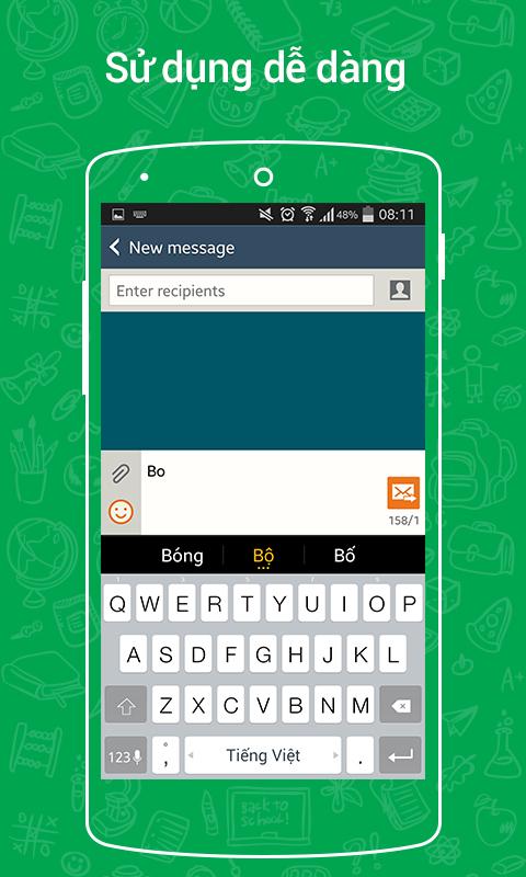 ban phim android tieng viet là ứng dụng viết tiếng Việt Unicode, ban phim dien thoai unikey đơn giản nhất cho điện thoại Android. Ứng dụng cung cấp 2 kiểu gõ phổ biến nhất là Telex và VNI, là ban phim unikey tieng viet. So với các bo go tieng viet khác thì Gõ Tiếng Việt ưu việt hơn với nhiều tính năng nâng cao như: đoán chữ và cụm từ thông minh, hỗ trợ gõ tắt, tự động thêm dấu...là go tieng viet co dau ưu việt. Gõ tiếng Việt tương tự như ban phim vietkey trên PC