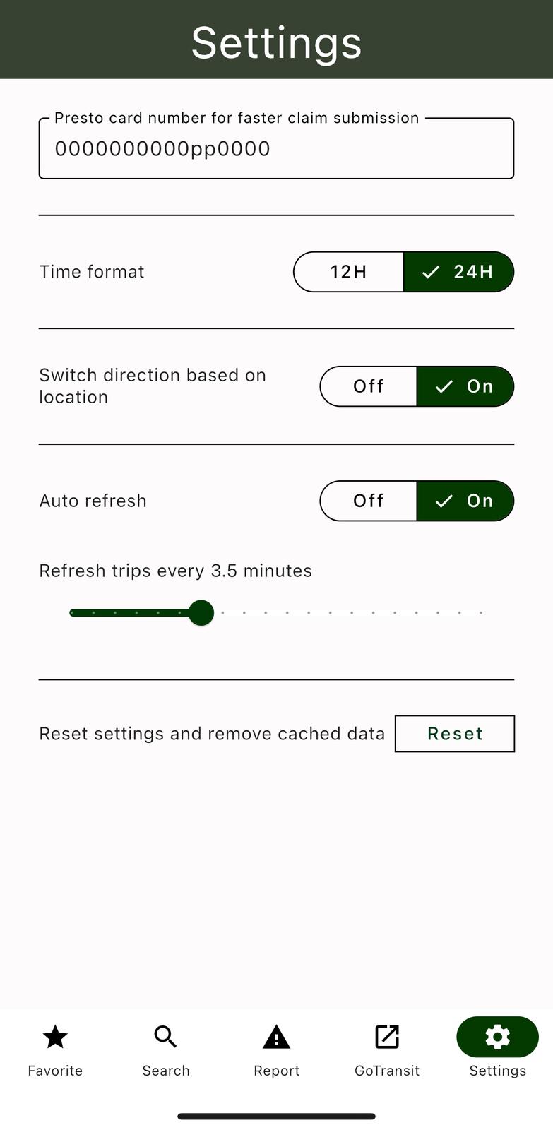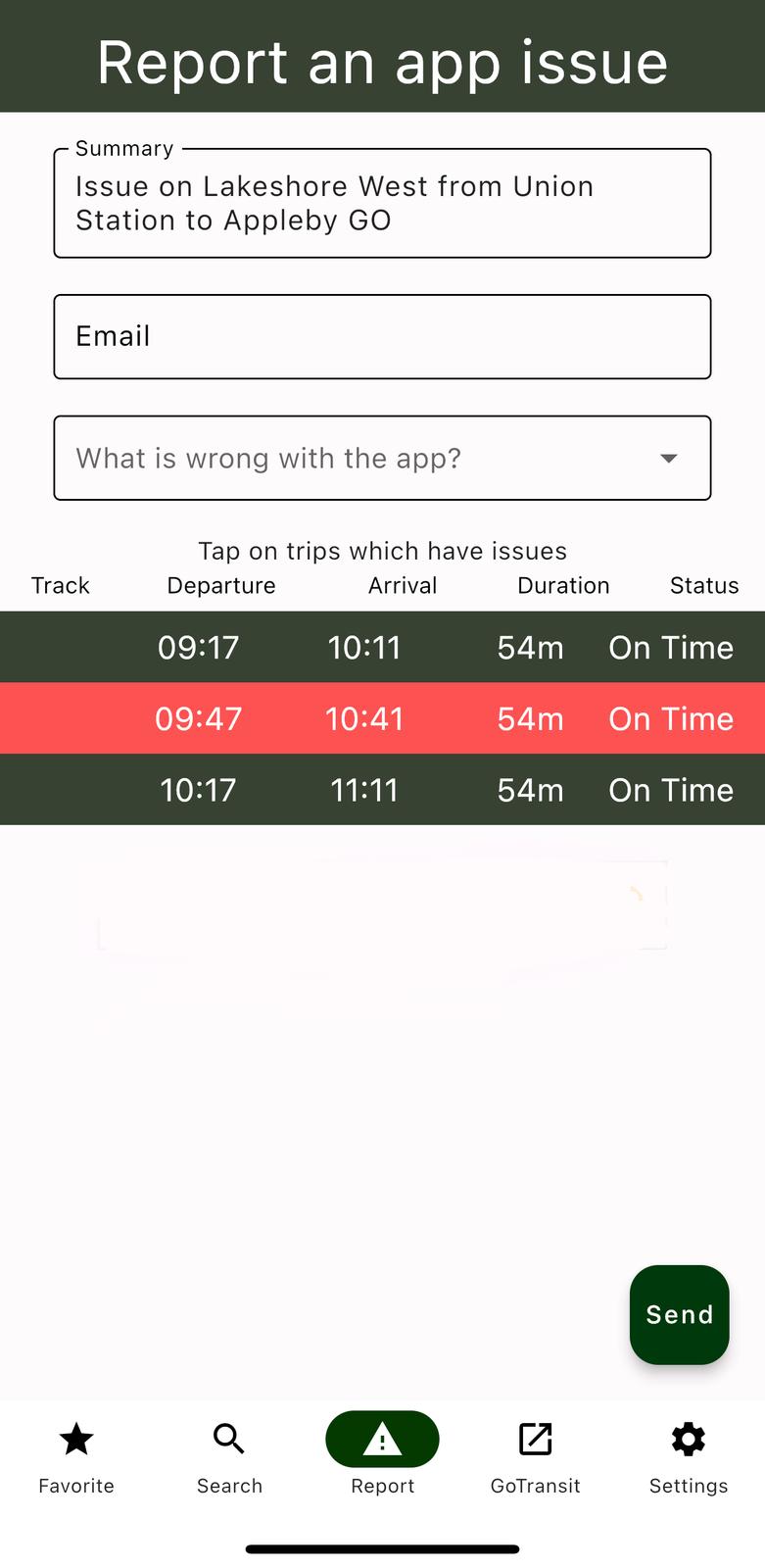 Features - GO train and buses schedule - One favorite/default trip - Delays and cancellations - Helps to find delayed trains and submit service guarantee form - Platform information - Direction of schedule screen switches based on your current location App discovers trips eligible for service guarantee and helps to fill up form on Metrolinx website. Application does not provide any guarantee or impact on final decision about your service guarantee claims. Sometimes it takes up to one day to update eligibility information for certain trips. Data used in this product or service is provided with the permission of Metrolinx. Metrolinx makes no representations or warranties of any kind, express or implied, with respect to the Data and assumes no responsibility for the accuracy or currency of the data used in this product or service.