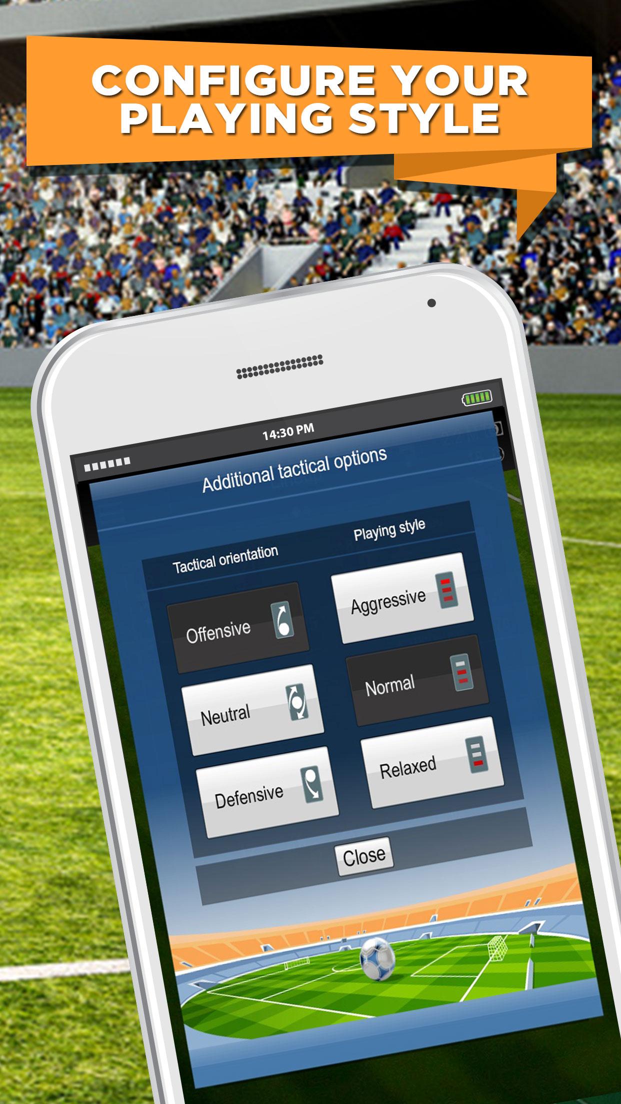 Choose the 11 kickers, your formation and your plan for the league and cup matches. Make investments in your stadium and expand it to make room for more fans and bring in more revenue. Choose your jersey design and your favourite colours!