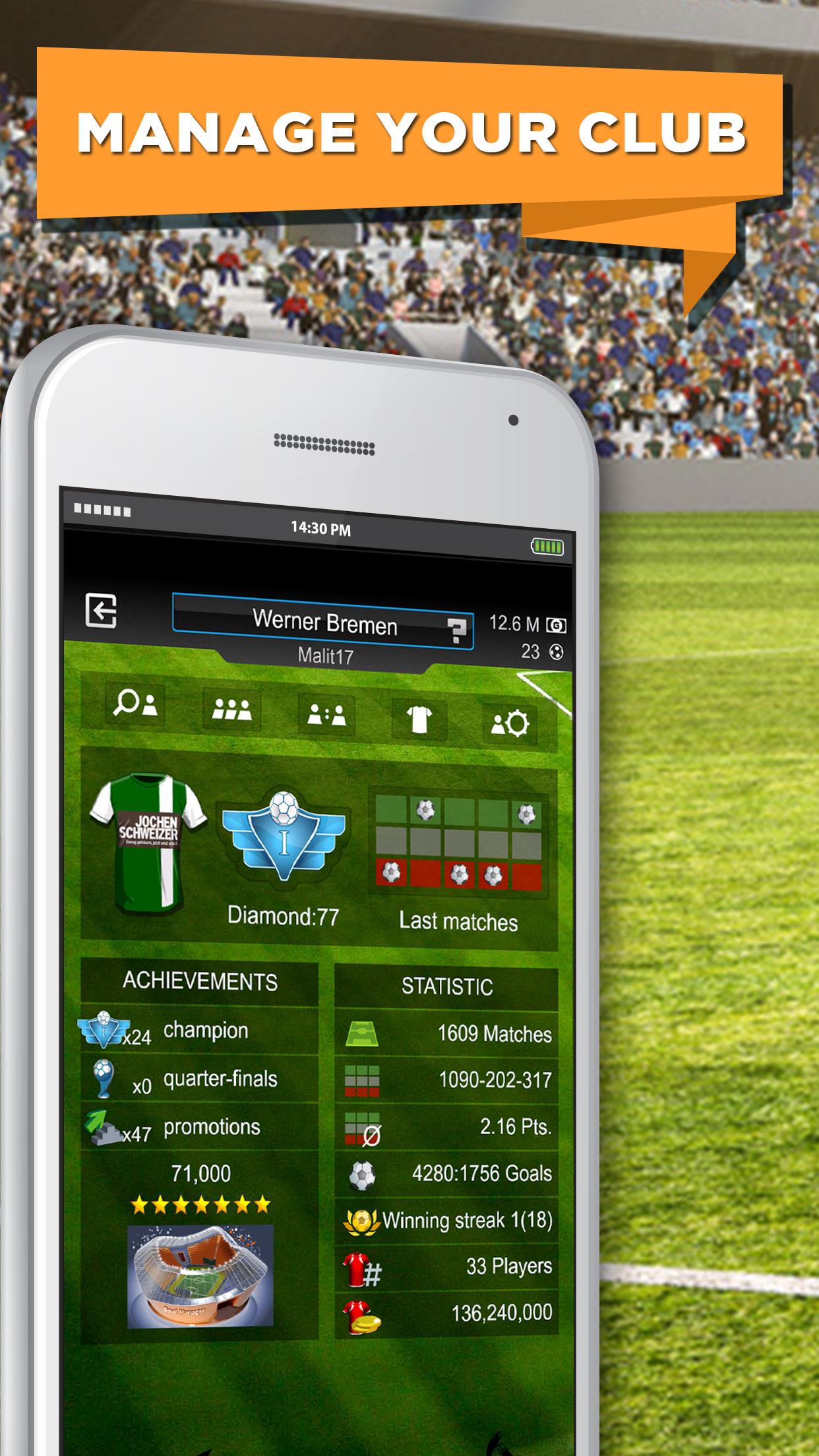 Take care of your finances. Choose your sponsor and define the tactics for your upcoming league matches. Analyse your squad, pay the salaries and extend contracts. Monitor your game plan, your results and the table in order to get your team ready for the next opponent. Construct your stadium in order to earn more money and win over more football fans for your team.