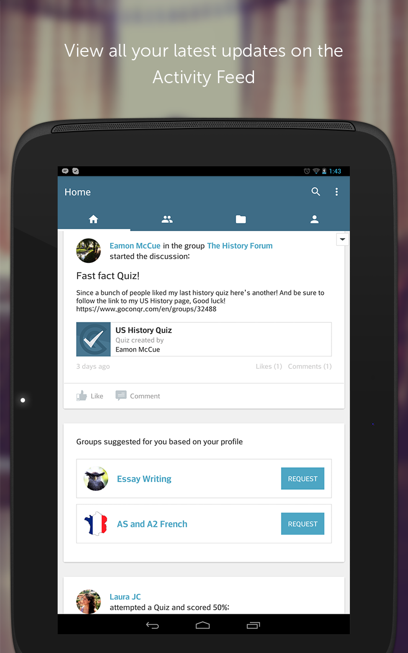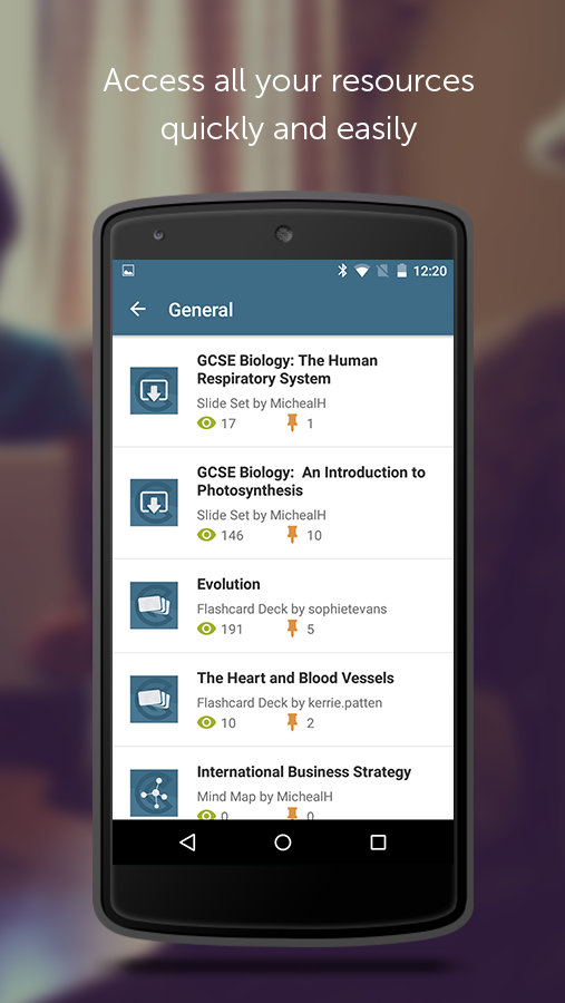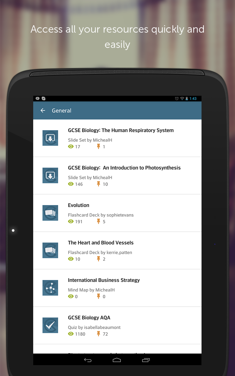 The GoConqr app helps make learning easier. Access great learning resources like Mind Maps, Flashcards, Quizzes, Slides and Notes, or use the GoConqr app for social learning and connect and collaborate with friends, classmates and learners in Groups. Say hello to: • A truly collaborative online learning experience • Easy access to millions of amazing learning resources • Tailored to your needs – receive suggested content on your personal Activity Feed • Learning on the go – take all you need on your mobile device • Access study resources that offer a far more visual learning experience • A powerful, intuitive and flexible study app for greater study success • Freedom to study online or off • Quick, free and easy to install, set up and get started The GoConqr app lets you discover and join countless Learning Groups so that you can connect with learners around the world at all exam levels and collaborate with them on any study topic. You can share, post, pin or rate other users’ learning resources; join Group discussions; post images; and get instant feedback, advice and support from learners just like you. And because the GoConqr app is fully integrated with your web account it means the learning resources you’ve created or saved are always close to hand so you can continue to discover, view and share a world of GoConqr learning resources anytime, anywhere! That’s why students, teachers and professionals around the world have been using GoConqr for training and study success. Join them today! Key Features & Benefits: Amazing Study Resources • Access a library of over 4 million learning resources covering just about everything • View, play and share Mind Maps, Notes, Slides, Flashcards and Quizzes • Arrange your learning resources or another users' by subject or topic • Get performance overviews in Flashcards and Quizzes • Rate, pin and share learning resources Social Learning • Connect and collaborate with friends, classmates or learners from around the world • Browse your Activity Feed to keep up to date on recent activities in your Study Groups • Easily share countless learning resources – Mind Maps, Flashcards, Slides, Quizzes and more • Get instant feedback, advice and support from other learners • Join discussions, post comments, create polls or share resources and images Personal Learning Platform • Receive suggested learning resources or Study Groups on your personal Activity Feed • Share resources via Facebook, Twitter, Google+ or email • Sign In to GoConqr using email, Facebook or Google+ • Synced with your GoConqr web account for instant access to your learning content • Seamlessly integrate learning into your daily lifestyle with GoConqr’s mobile learning app So there are no more excuses – fast-track your study success and download the GoConqr app today!