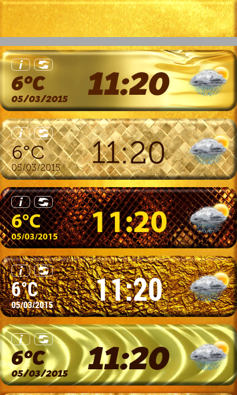 Gold Clock Weather Widget (Package Name: com.GoldClockWeatherWidget) is developed by Super Widgets and the latest version of Gold Clock Weather Widget 5.0 was updated on October 28, 2015. Gold Clock Weather Widget is in the category of Weather. You can check all apps from the developer of Gold Clock Weather Widget. Currently this app is for free. This app can be downloaded on Android 2.3.2+ on APKFab or Google Play. All APK/XAPK files on APKFab.com are original and 100% safe with fast download.