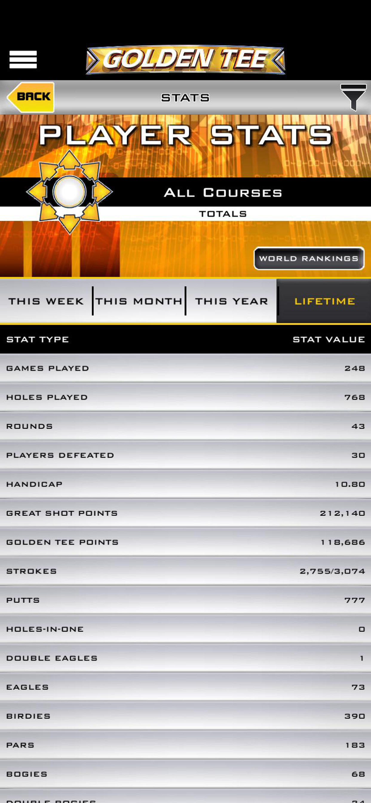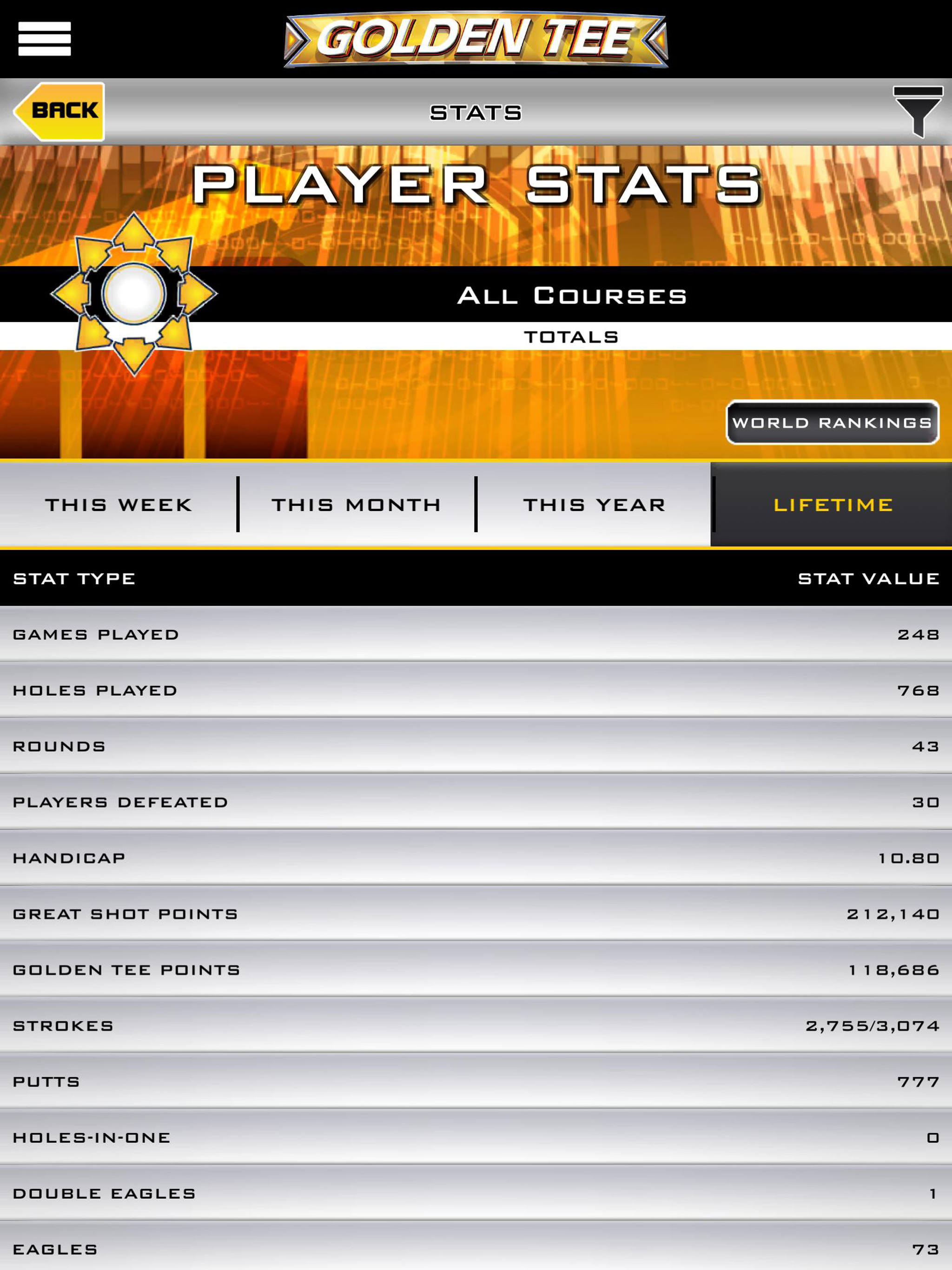In golf, a caddy can make a world of difference. In Golden Tee, your caddy won’t just be at your side when you’re spinning the trackball. It will be with you at all times, ready to enhance your GT experience. The Golden Tee Caddy is the app each and every Golden Tee fan has to own. Whether you’re a diehard trackball addict looking for detailed information for your latest contest, or you’re a casual player looking to track down a LIVE cabinet on the road, the GT Caddy is built for you. Just download the app and log in, and you’ll have access to your GT world. Golden Tee Caddy Features: • The Friends section allows you to invite and accept friendships with other players. • The Invitationals section allows you to setup private contests with just your friends. Once you create your contest, you can play your game at any Golden Tee cabinet in states that do not have restrictions. All players have the same game conditions no matter which physical location they play at. • Lots of additions to the ProShop including Build-A-Ball, custom putters, custom clubs and auto-rebuy so you don't have to waste game time at the cabinet buying more consumables. • Build-A-Bag: Create the dream club set you’ve always wanted. Name it, give it a description and then pick the 14 clubs that best suit your game or a given course! • In-depth stat-tracking: Want to see how you’ve played this week? This month? This year? Or perhaps you’re interested in some all-time numbers, averages and bests. Access your Golden Tee Web Account and enjoy stat overload! • All LIVE Contest Play: How much money did I win last night? Use the GT Caddy to find out how you placed in Money $hot, Daily Contest, Prize Play, Glory Play and Closest-to-the-Pin Contests! Just hit refresh and see how your scores hold up to the rest of the trackball world! • Find A Game: Whether you’re on the road or simply looking for a Golden Tee location in your area, Find A Game will help you track one down, and it will also provide directions to locations using GPS on your phone! • Instant YouTube™ Golden Tee Great Shot Access: See your latest and greatest Golden Tee Great Shot uploads, all in one place. Your buddy doesn’t believe you aced Hole 18 on Pelican Grove? Show him in seconds. • GT Notifications: Don’t just hit refresh for hours. We’ll send you all your latest Golden Tee happenings. Turn on notifications to find out when your contests closed, if money was added to your Player Account or when your YouTube™ Golden Tee Great Shot was uploaded and more! • Stay Current on News: Tournaments, contests, tips, videos, announcements and all the fun of Goldentee.com can be found in the Golden Tee Caddy. Find out what’s going on in the game you love. • Reorder a Card: In need of a new Golden Tee LIVE Player Card? Access your account on the GT Caddy and order a replacement free of charge! You’ll also be able to track the status of your card once an order has been requested. • Set your equipment just the way you like it—then start over and reset it again if you please. Dress your virtual golfer from the comfort of your couch or cubicle chair and then go access these changes at your local watering hole. The all-new Player Locker and Pro Shop sections of the GT Caddy make this possible. Use the Caddy and have your stuff—clothing and any piece of equipment ever made in Golden Tee LIVE—waiting and ready for use when you get to the game. • The caddy remains a completely free app with all features unlocked and available to everyone. Golden Tee items available for purchase through the app are for use on physical Golden Tee cabinets connected to ITNet only. There is no gameplay or item use within the app itself. Items are available through the app as a convenience so you no longer have to be “that guy” wasting valuable play time to get what you need.