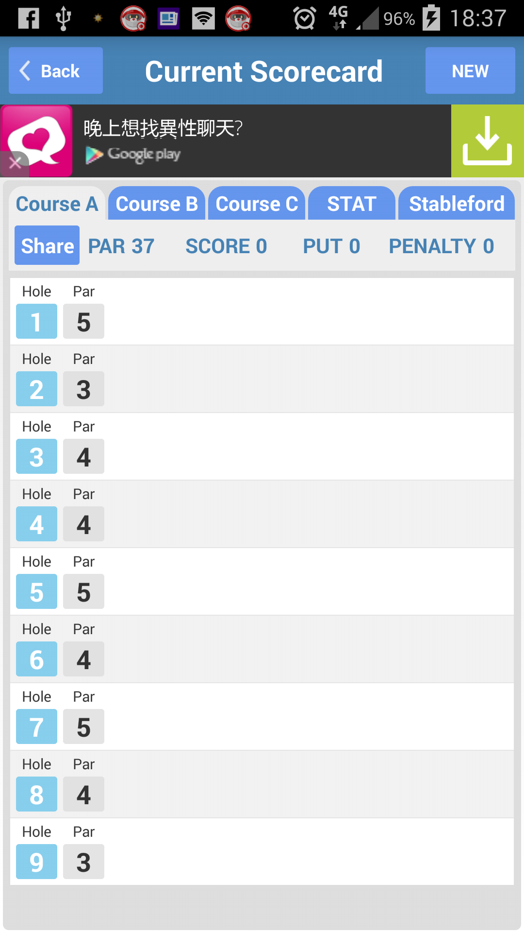 ★★★ NEW for Version 2.0 (2017/08/31) ★★★ Fix bug and enhance screen layout and user experience. ★★★ NEW for Version 1.5.1 (2015/06/16) ★★★ New caddie option suggested by Mudassar Malhi 1. My Bag screen, now can set up distance for every club. 2. Record Score screen, can show distance to Green and identify recommend club if both Green position and club distance are defined in advance. Please see the video below... http://andrewwang1.blogspot.tw/2015/06/golf-gps-scorecard-v151.html ★ Golf GPS Scorecard (GGS) ★ The main idea of Golf GPS Scorecard(GGS) is to record 1. how many shots and 2. what clubs you used 3. on every ball position. ★ Feature ★ 1. Record every shot with current GPS fix, clubs used and take pictures. 2. Measure distance between current GPS fix and where you tap on the map. 3. Search and review historical games ever created. 4. Show distance (with slope) between shots. 5. Track and review shot path from map. 6. Export and share Game Statistics with friends. 7. Export scorecard as CSV file. 8. Stableford points scoring. 9. My favorite Course, create your own course and share with friends. ★ Documentation link ★ [Version 1.5.0] http://andrewwang1.blogspot.com/2015/03/ggs-v150.html [Version 1.4.5] http://andrewwang1.blogspot.tw/2014/08/ggs-ver-145.html 1.Start a new game, http://andrewwang1.blogspot.tw/2014/03/golf-gps-scorecard-version-144-start.html 2.Record score, http://andrewwang1.blogspot.tw/2014/03/ggs-version-144-record-score-screen.html 3. Scorecard, http://andrewwang1.blogspot.tw/2014/03/ggs-version-144-current-scorecard-screen.html 4. Stableford points scoring, http://andrewwang1.blogspot.tw/2014/03/golf-gps-scorecard-version-144_9963.html 5. Statistics, http://andrewwang1.blogspot.tw/2014/03/golf-gps-scorecard-version-144-game_6615.html 6. Course list, http://andrewwang1.blogspot.tw/2014/03/golf-gps-scorecard-version-144-course.html 7. View courses, http://andrewwang1.blogspot.tw/2014/03/golf-gps-scorecard-version-144-view.html 8. Creata a course, http://andrewwang1.blogspot.tw/2014/03/golf-gps-scorecard-version-144-create.html 9. Identify TEE,Green position, http://andrewwang1.blogspot.tw/2014/03/golf-gps-scorecard-version-144-tee.html Version 1.4.3 http://andrewwang1.blogspot.tw/2014/02/golf-gps-scorecard-version-143.html Version 1.4 http://andrewwang1.blogspot.tw/2013/11/golf-gps-scorecard-version-14-draft.html ★ Beside that we also offer another Golf GPS Scorecard Lite (GGS Lite) app ★ A SIMPLY, EASY and USEFUL golf scorecard app for 4 players in the same time. With Golf GPS Scorecard Lite (GGS Lite), 1. Easy to record score. 2. Provide game STATS. 3. Create your own golf course by yourself (and marking your own tees and greens for ANY golf course in the world). 4. Export and Share golf course between friends. 5. Import Golf Course shared from friends. 6. Measure distance between golfer position and GREEN and TEE. 7. Clarify user interface. Here is it, Golf GPS Scorecard Lite (GGS Lite), https://play.google.com/store/apps/details?id=com.andrewwang.scorecard.bet