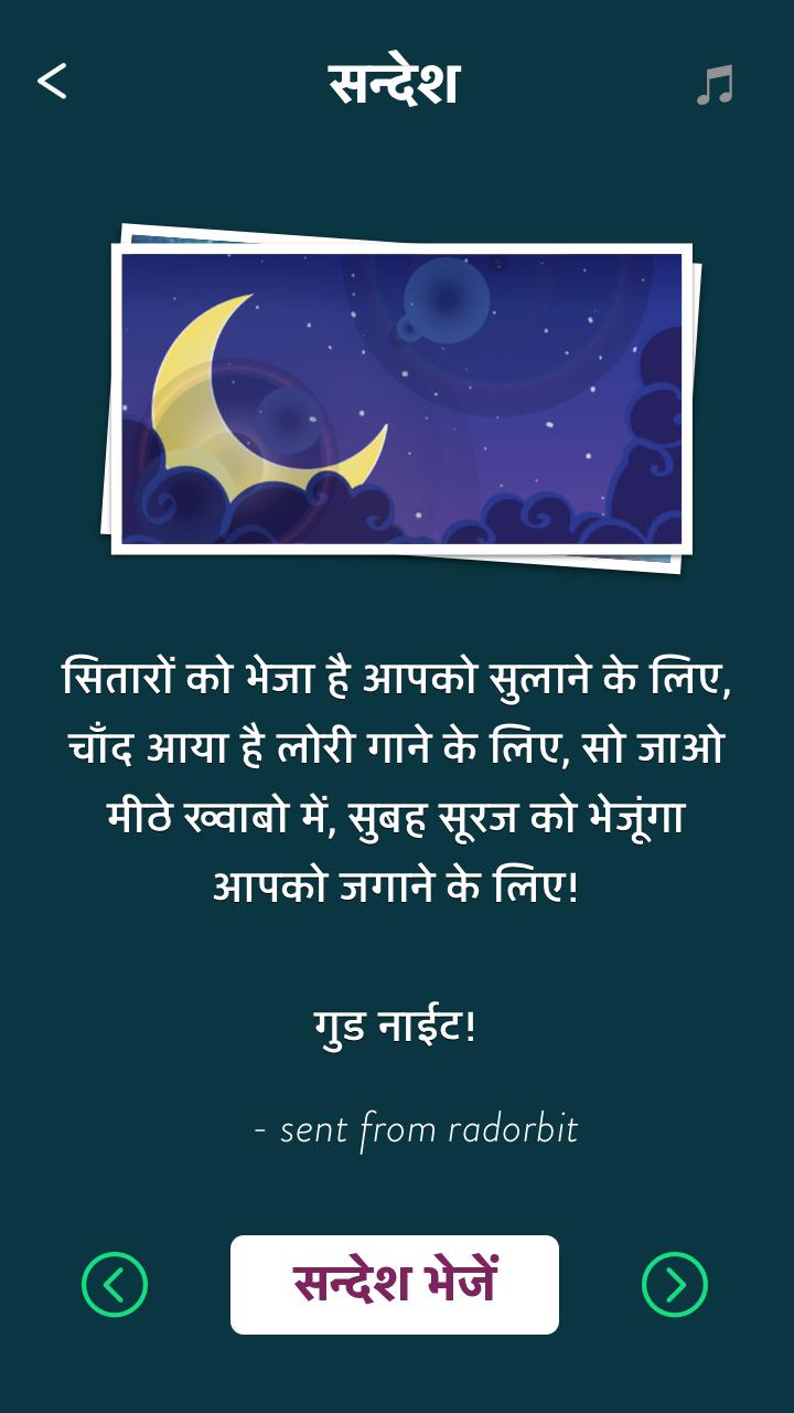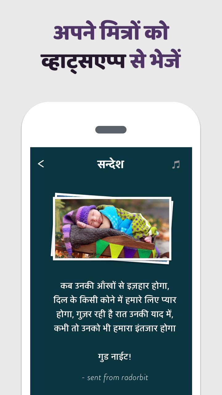 शुभरात्रि सन्देश (Package Name: com.radorbit.goodnightmessagesms) is developed by IndiaKiApps and the latest version of Good Night Photo Shayari 1.0 was updated on January 8, 2017. Good Night Photo Shayari is in the category of Entertainment. You can check all apps from the developer of Good Night Photo Shayari. Currently this app is for free. This app can be downloaded on Android 4.0+ on APKFab or Google Play. All APK/XAPK files on APKFab.com are original and 100% safe with fast download.