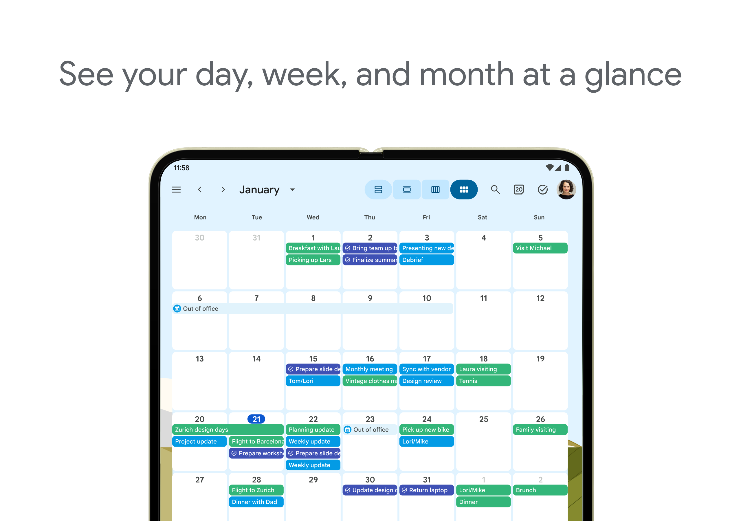 Get the official Google Calendar app, for your Android phone, tablet, or Wear OS device to stay organized and plan your day. Make the most of your day with easy event creation, multiple calendars, customizable views, widgets, tasks, and more With Google Calendar, you can: • Get events automatically added to your Calendar from Gmail, including flight, hotel, concert, and restaurant reservations. • Go from using Calendar on your Android phone, tablet, or Wear OS device to your computer without missing a beat when you’re logged into the same Google account. • Consolidate and view Google Calendar events side-by-side with other calendars on your device, including Exchange. • Keep family, friends, and colleagues in the loop with shared calendars, so they can view, add, or modify events. • Quickly switch between month, week, and day views. • Stay on top of to-dos by creating and managing tasks alongside your events in Calendar. • Personalize your Google Calendar with light or dark mode or by color-coding your events. • Access and organize your task lists in a full-screen view right from the Google Calendar app. • Keep track of events or tasks while on the go with Google Calendar on Wear OS devices, which supports tiles and complications. Google Calendar is part of Google Workspace, allowing you and your team to easily connect, create, and collaborate across all your favorite Google tools. You can: • Collaborate in a hybrid work environment by adding a Google Meet video call to an Calendar event • Get access to professional booking pages to easily book clients and customers*. • Schedule meetings with teammates by checking their availability or layering their calendars in a single view • Add your working location to your calendar to make it easier for your teammates to schedule meetings with you*. • Keep everyone on track for a meeting by attaching meeting notes, pre-read materials, and other documents directly to a calendar event. • Use Google Calendar with confidence knowing it’s supported by Google’s enterprise-level privacy, user safety and data security. Learn more about Google Workspace: https://workspace.google.com/products/calendar/ Follow us for more: X: https://x.com/googleworkspace LinkedIn: https://www.linkedin.com/showcase/googleworkspace Facebook: https://www.facebook.com/googleworkspace/