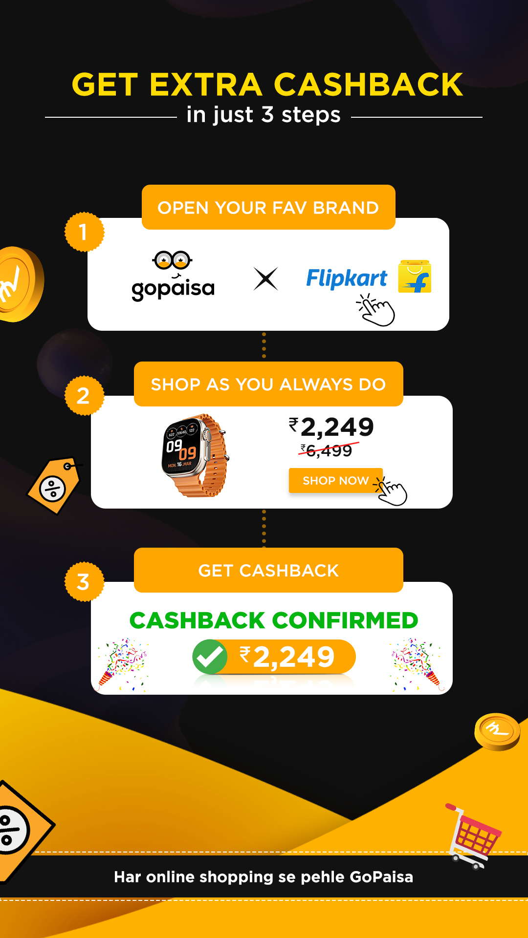 🛒 Shop & Earn Cashback: Get guaranteed cashback rewards and coupon discounts on Flipkart, Amazon, Myntra, Croma, Dell & 1500+ top retailers.
