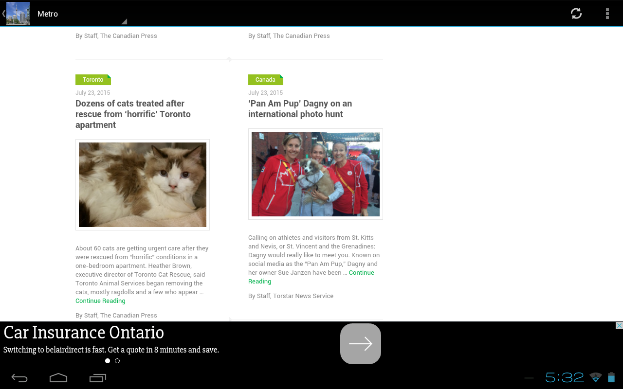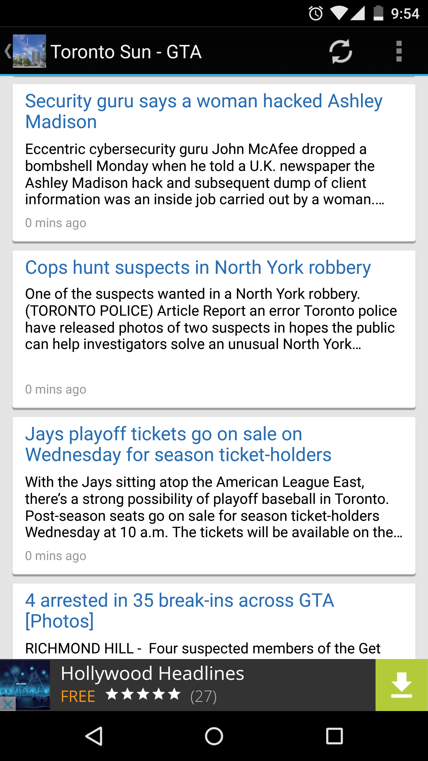 Local news, National news, weather, entertainment, sports and other news! Read the news for the entire Greater Toronto Area on your mobile device or tablet from the websites of these publications: - Toronto Star - Toronto Sun - CP24 - CBC - Toronto Radio Stations - The Globe and Mail - Metro News - Inside Halton - York Region - Global News - 680 News - Brampton Guardian - The Mississauga News - Ming Pao / 明報 - Durham Region - TripLinx - Z103 - Talk Radio AM640 - Newstalk 1010 - Inside Toronto - Can-India News - Sing Tao / 星島日報 - The Sports Section - NEW - National Post - NEW - Financial Post - NEW - Now Magazine - NEW Please note to determine the traffic in your area, you will need to enable the GPS/Location on your mobile device. Disclaimer: This app uses publicly available feeds from the aforementioned publications. We are not affiliated with any of the above publications except The Sports Section.