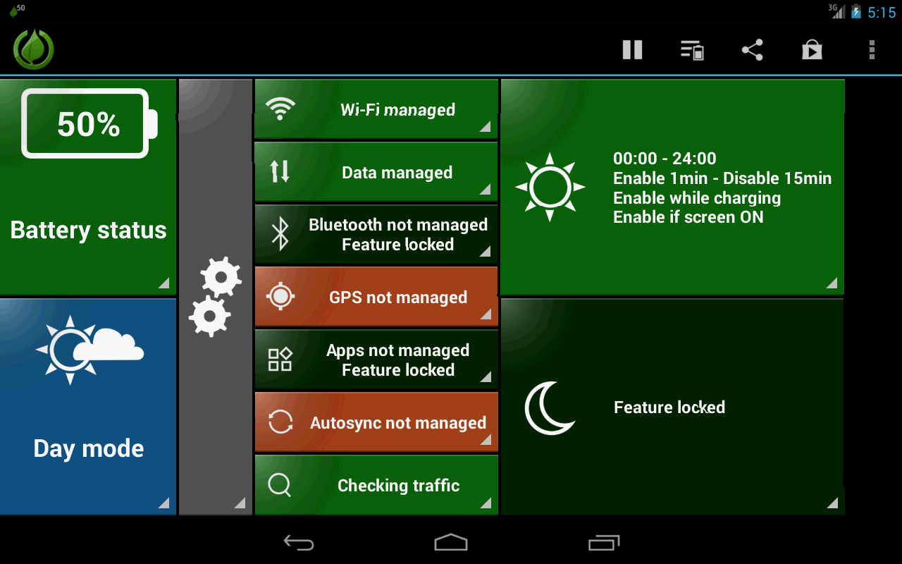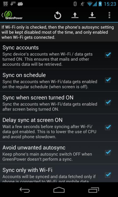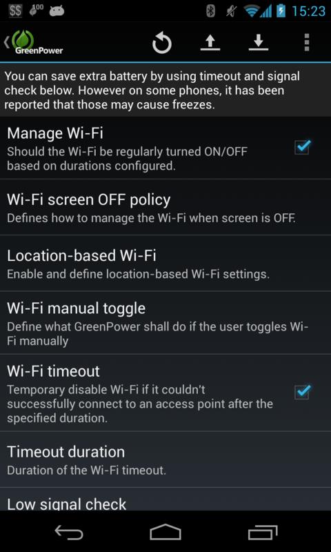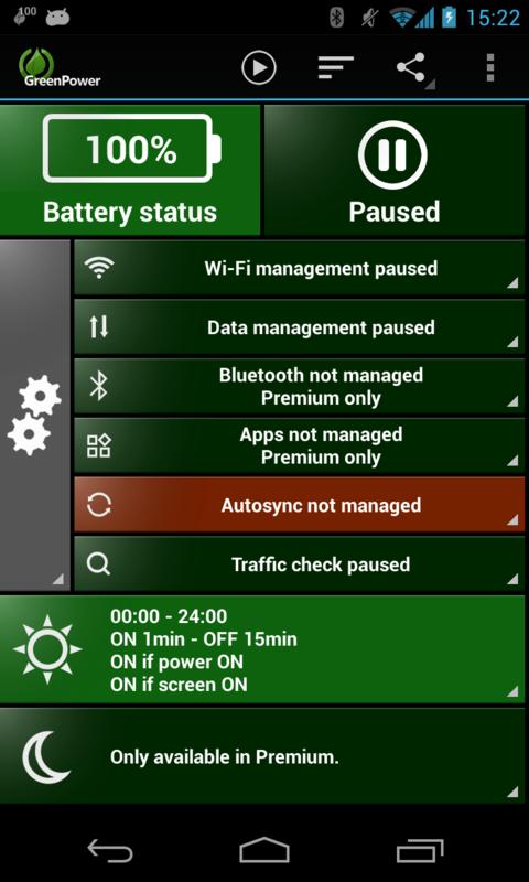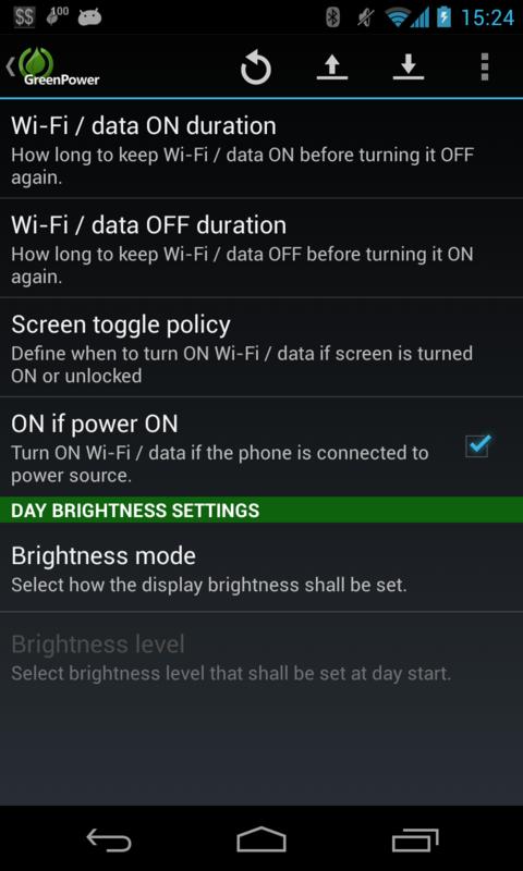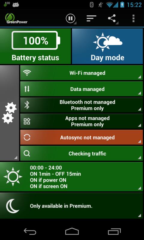 ★ GreenPower Battery Saver brings many extra hours to your battery life! ★ ★ Support for Mobile Data on Marshmallow (Android 6) & Lollipop (Android 5): Only for rooted phones. ★ Unlike other battery savers that require regular user manual actions, GreenPower is an easy battery saver that is fully automatic: Once configured, it runs and saves your battery by itself. It does so by smartly managing Wifi, Mobile data, Bluetooth and Screen Brightness: Turning them off when you don't need them, but ensure minimum disturbance: Automatic turned ON when needed by you or by other apps (e.g retrieving mails). Easier, cleaner and faster than competitors, 2x battery saver and easy battery saver! GreenPower battery saver: 1.5 million downloads & 2 years of experience in Android Battery Saving! HIGHLIGTS ★ Adds up to 100% battery life depending on usage ★ Automatically manages your Wi-Fi, Mobile Data (2G, 3G, 4G), Bluetooth, GPS, display brightness ★ Battery saving works with almost all devices and carriers ★ Supports all Android versions from Froyo to Marshmallow (6.0) ★ Easy yet powerful battery saver and battery booster INSTALL AND FORGET Or take time to configure the battery saving settings to get the most out of it and the best battery longevity! SATISFIED OR MONEY BACK GUARANTEE Try Premium version for 24H and get a refund if you didn't like it by just sending us a mail. FEATURES • Battery life indicator in notification area. • Wifi management: Based on schedule, screen state, location, power connected, signal level... • Mobile data management: Based on schedule, screen state, power connected... • BLUETOOTH (premium) management: Based on devices connected or in range, screen state, power etc • Traffic check: Configurable to prevent disturbing other apps • Apps Whitelist & Blacklist (premium): To keep data on when using specific apps (like music streaming) • Simple WIDGET (premium): To quickly pause or resume • Night / Sleep mode (premium) fully configurable, Airplane mode... • Tasker & Locale Plug-in (premium) • Compatible with Cerberus 2.0 • Very lightweight and fast app • Easy and clean interface • Fully configurable settings • Settings backup / restore • 30 Languages • And more coming all the time... PREMIUM ONLY • Widget • Night mode (sleep mode) • Tasker & Locale Plug-in • Location-based Wi-Fi • Apps whitelist & blacklist • No ads • The good feeling to support an independent developer