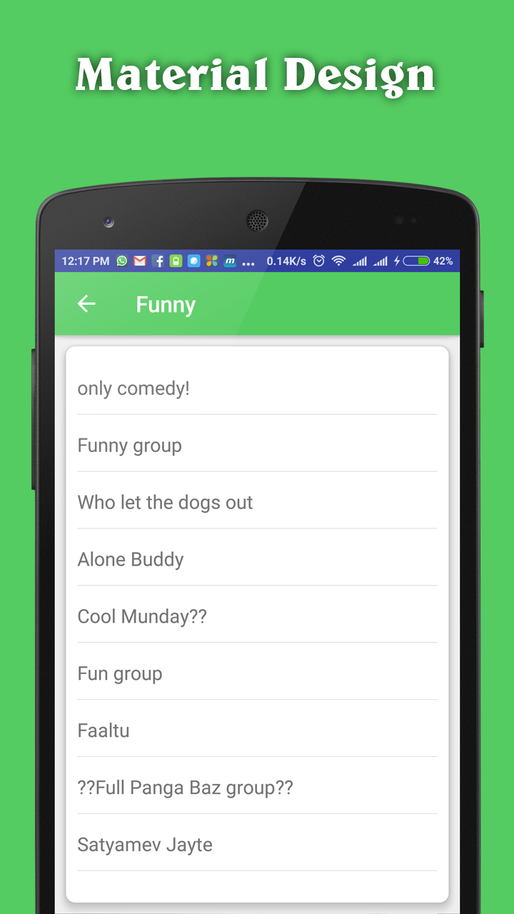 Groups for Whatsapp (Package Name: com.ngen.groupforwhatsapp) is developed by nGEN and the latest version of Groups for Whatsapp 1.21 was updated on July 17, 2017. Groups for Whatsapp is in the category of Social. You can check all apps from the developer of Groups for Whatsapp. Currently this app is for free. This app can be downloaded on Android 4.0.3+ on APKFab or Google Play. All APK/XAPK files on APKFab.com are original and 100% safe with fast download.
