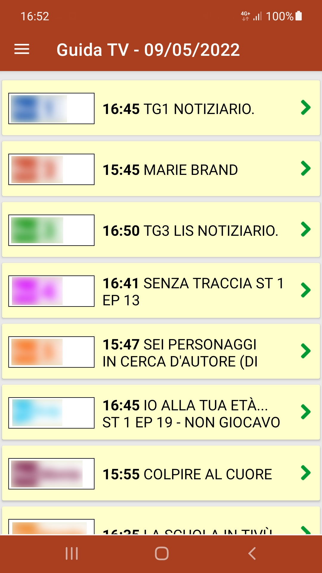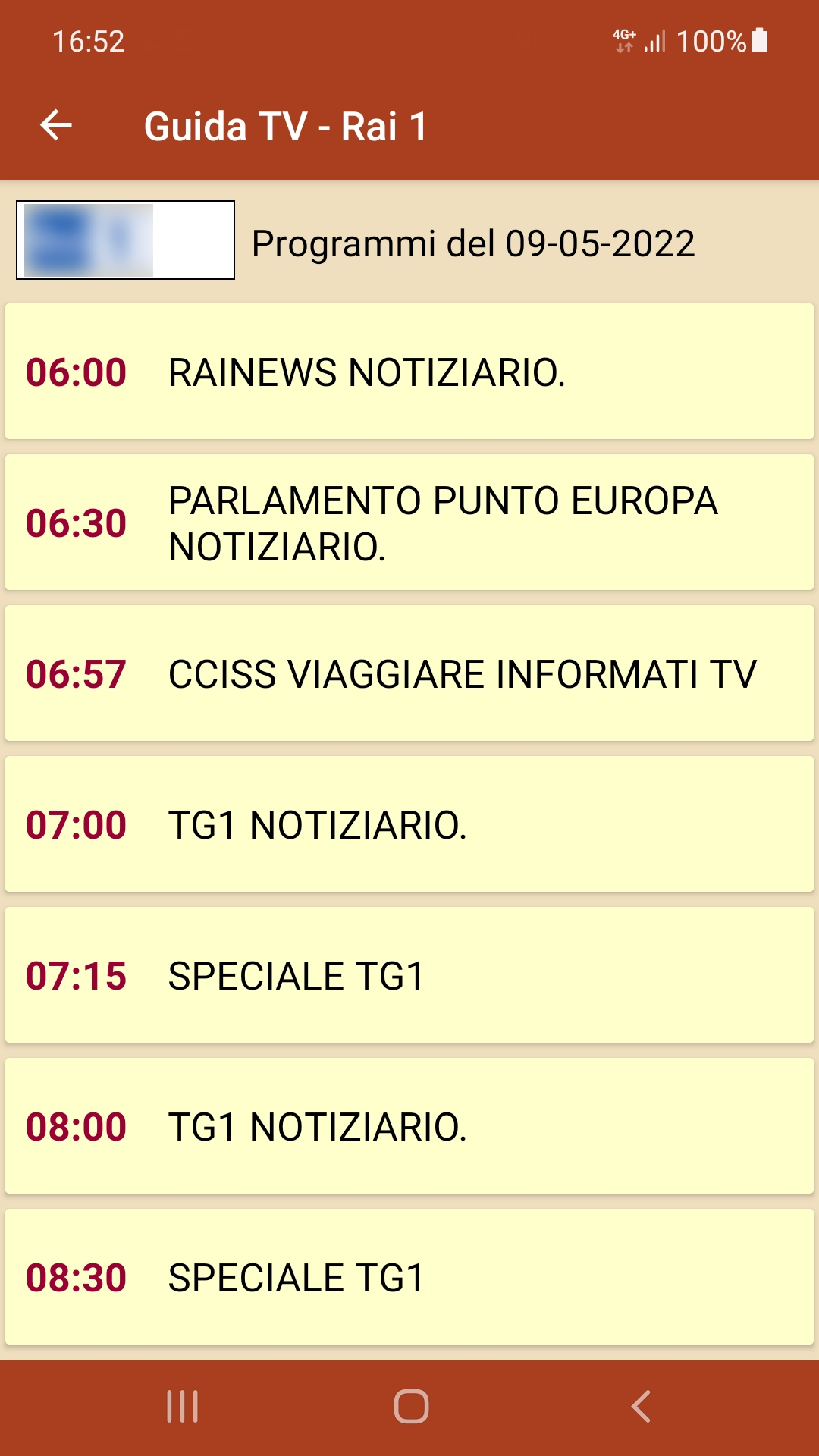 Con l'app Guida tv italiane puoi consultare i programmi del giorno trasmessi dai principali canali televisivi italiani comodamente sul tuo smartphone. Guida tv italiane è un'app indispensabile per essere sempre informati sul palinsesto delle principali emittenti italiane, tra cui i canali Rai, Mediaset, Discovery con la programmazione del momento e la possibilità di visualizzare i programmi tv dell'intera giornata. Nel dettaglio troverai i programmi tv di: Rai 1, Rai 2, Rai 3, Rai 4, Rete 4, Canale 5, Italia 1, La7, Cielo, Giallo, Rai Premium, La5, Real Time, La7d, Mediaset Extra, Top Crime, DMAX, TV2000 e altro ancora. Tutti i marchi qui esposti sono di proprietà dei rispettivi detentori dei copyright.