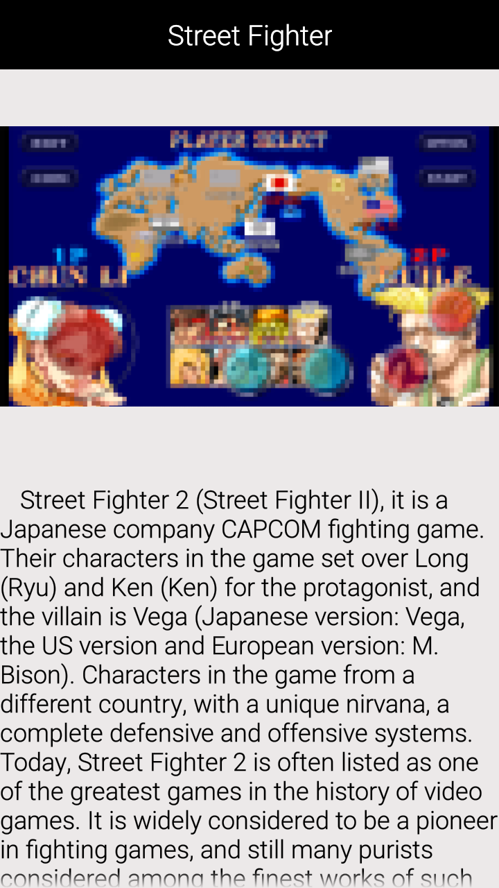 "Street Fighter" from Japan CAPCOM company in 1987 first introduced stand-alone fighting game series, the first generation of games released on August 30, 1987.