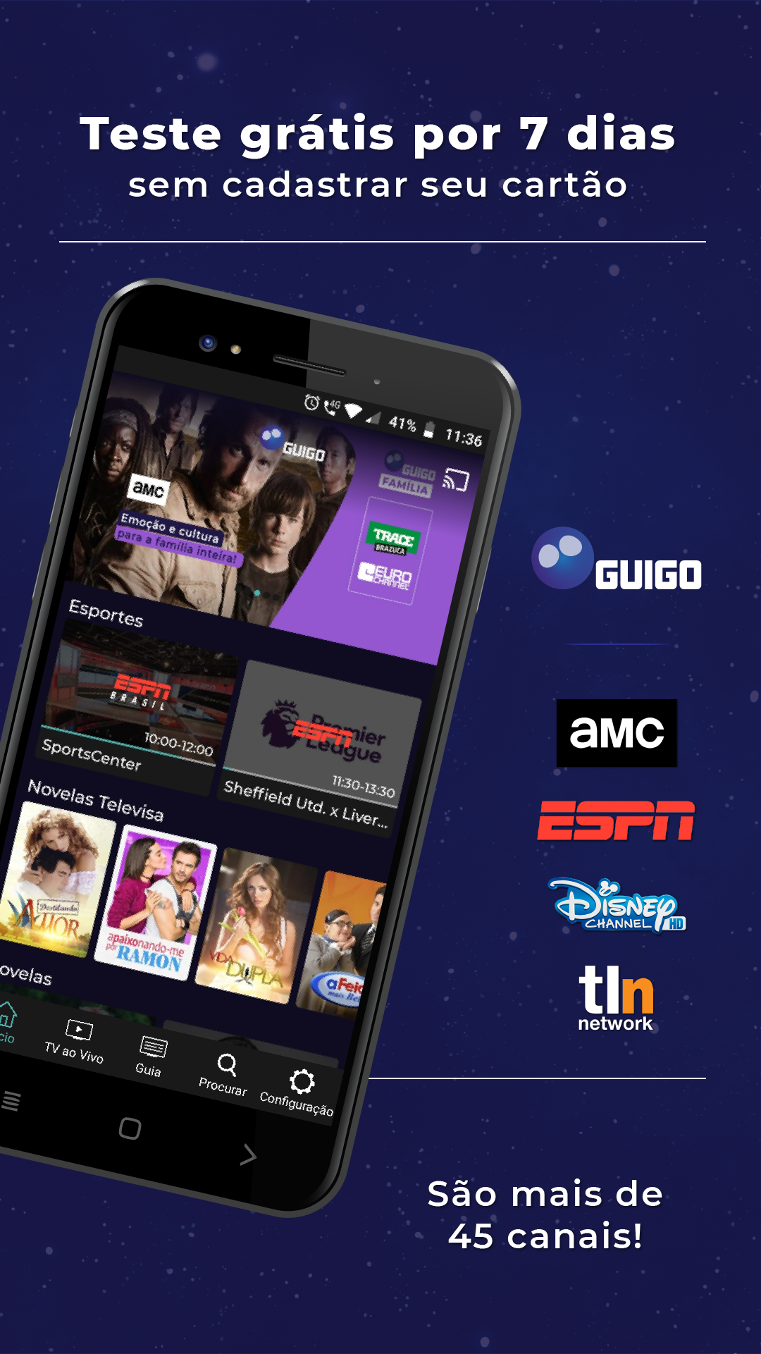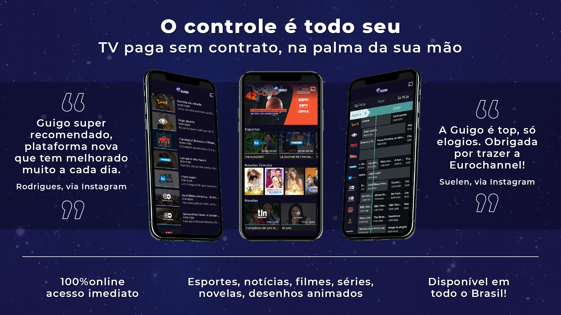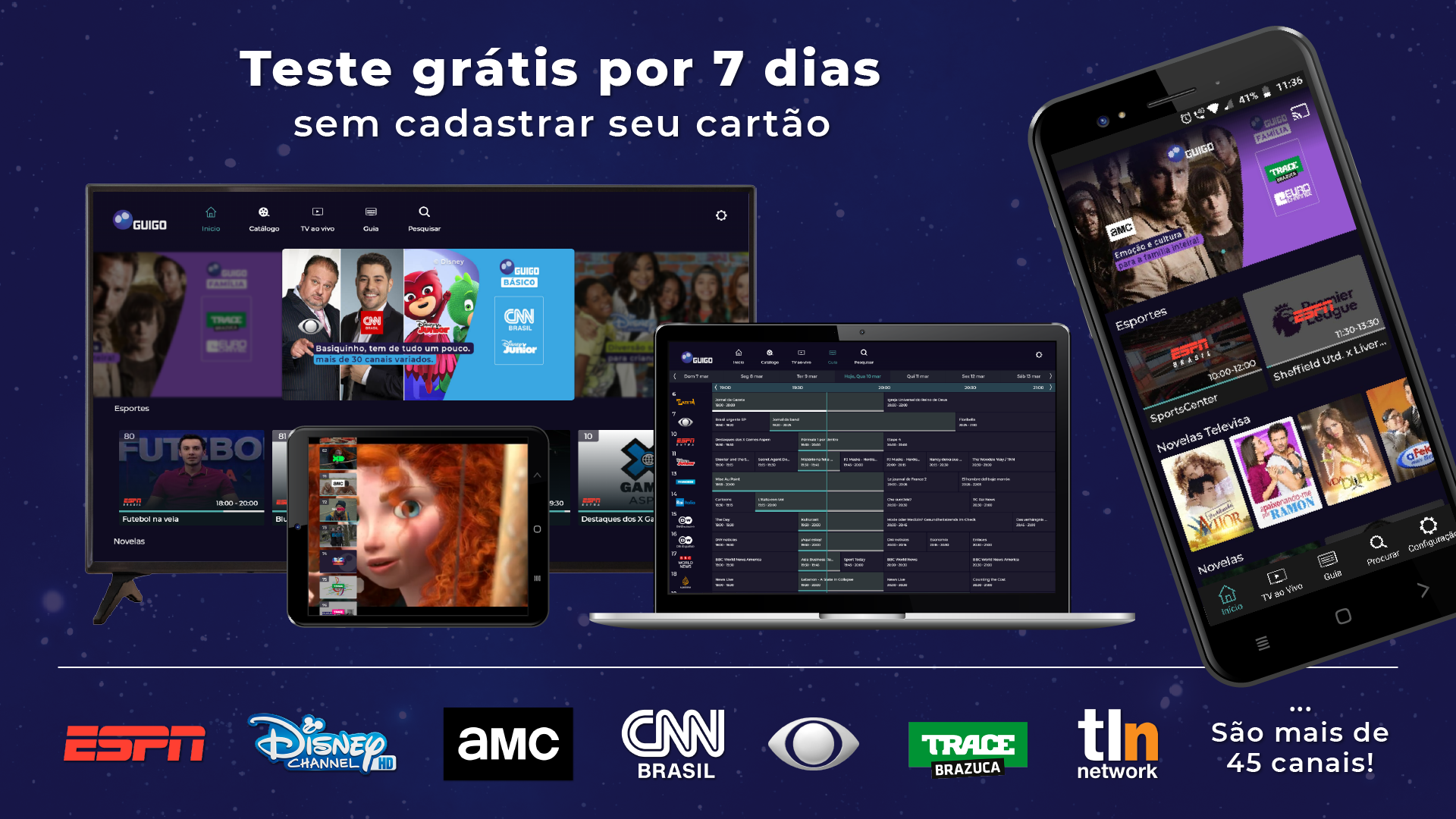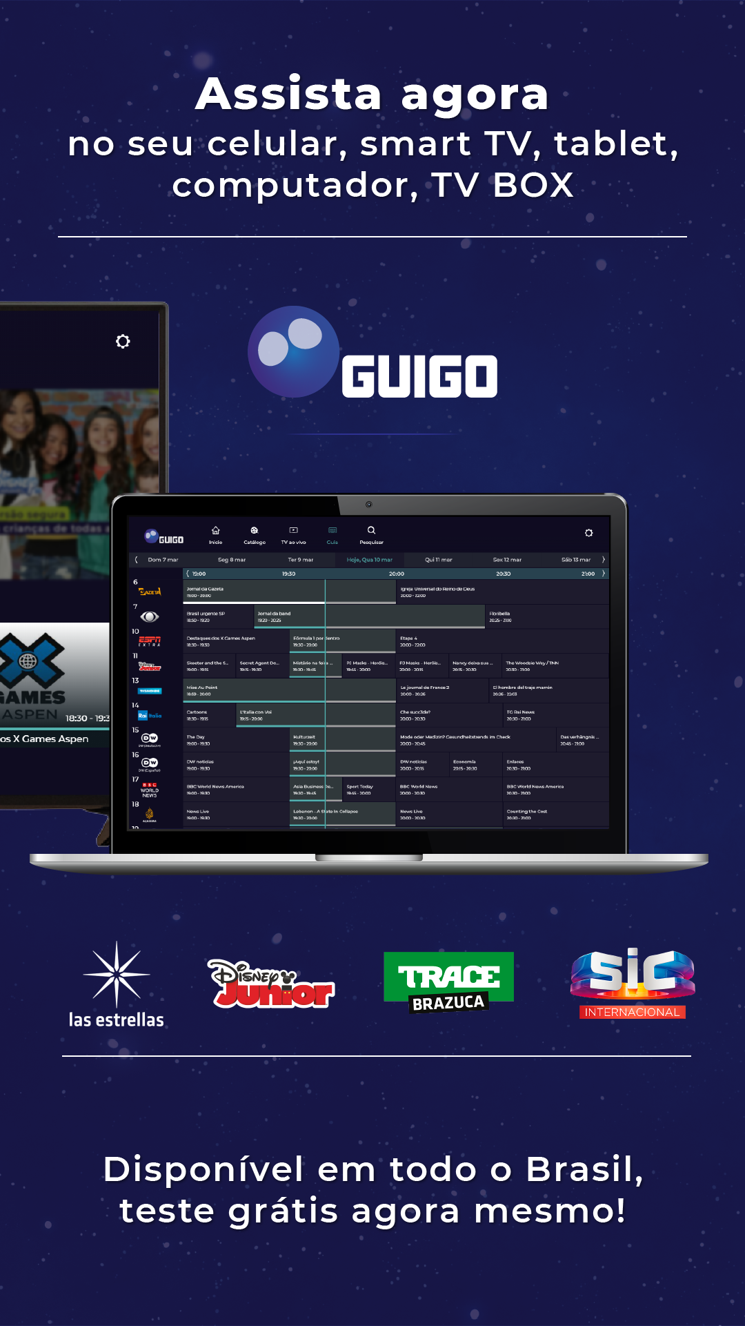 A Guigo TV é a primeira televisão por assinatura via internet do Brasil e 100% legalizada. Você pode assistir aos seus canais favoritos pelo app, no celular, tablet ou smart TV, ou pelo computador, acessando nosso site. Como é totalmente online, não precisa de instalação técnica. Após o pagamento, o acesso é imediato aos canais. Não temos contrato de fidelidade, você pode cancelar quando quiser, sem precisar pagar multa. Se é novo cliente, faça nosso teste grátis por 7 dias (não precisa cadastrar cartão)! A Guigo TV é a melhor alternativa para quem está cansado da TV a cabo. Além de poder ver seus canais em dispositivos diferentes, você também pode assistir de qualquer lugar do Brasil com sinal de internet - chega de ficar preso à TV da sua casa. Bem-vindo ao futuro da TV por assinatura! Com preços que cabem no bolso, a Guigo TV te dá a liberdade de assinar Pacotes com canais que realmente vai assistir. Veja as opções abaixo: Guigo Básico (33 canais) – R$7,90 Conteúdo: BAND, TV Gazeta, CNN Brasil, Disney Junior, ESPN Extra, Las Estrellas, BBC World News e outros 26 canais. Guigo Esportes (4 canais) – R$24,90 Conteúdo: ESPN Brasil, ESPN 2, ESPN e EI PLUS. Guigo Novelas (1 canal) – R$16,90 Conteúdo: TLN Network e o Catálogo de novelas mexicanas pra assistir quando quiser. Guigo Infantil (2 canais) – R$12,90 Conteúdo: Disney Channel, Disney XD e Disney Junior. Guigo Família (10 canais) – R$16,90 Conteúdo: AMC, Disney Channel, Disney XD, Film&Arts, Trace Brazuca, Trace Toca, Trace Urban, Trace Latina, SIC Internacional e Eurochannel. A Guigo TV é a única TV por assinatura do Brasil que tem contrato com a emissora Televisa, por isso você assiste com exclusividade os maiores clássicos e novidades das novelas mexicanas, dubladas e sem cortes, na TLN Network e também assiste ao Las Estrellas, um dos principais canais de entretenimento latino americano.