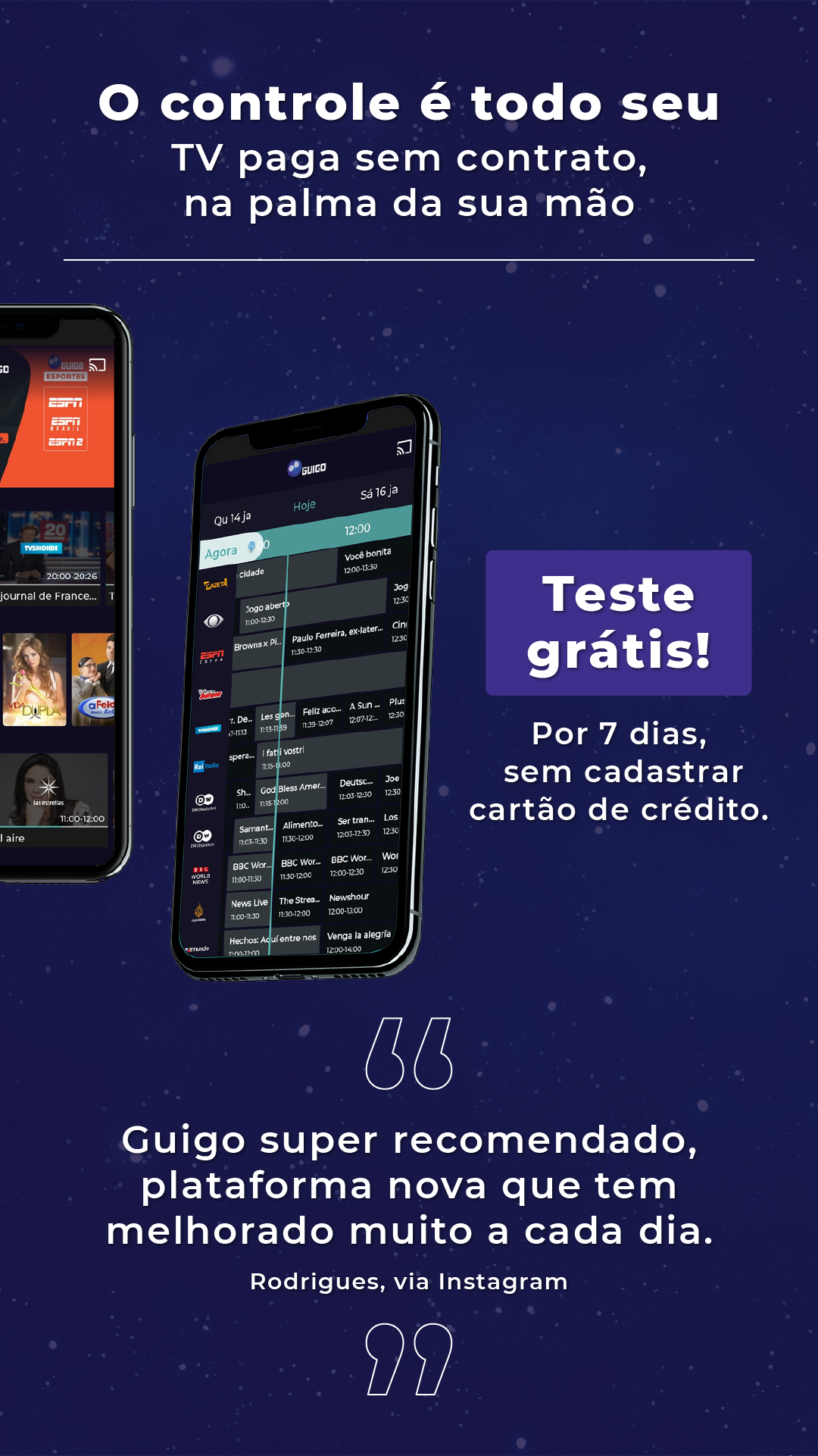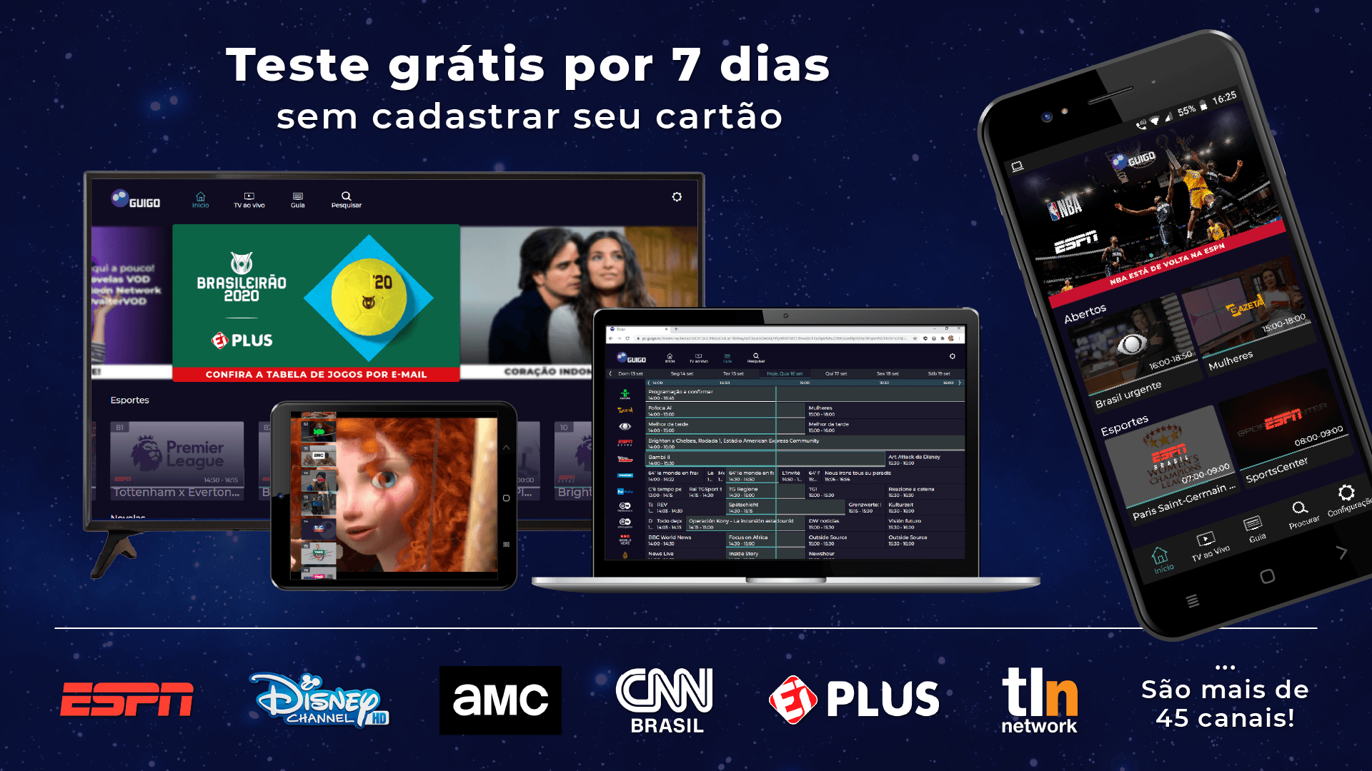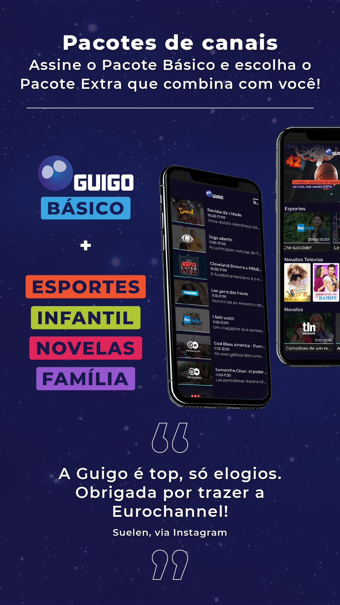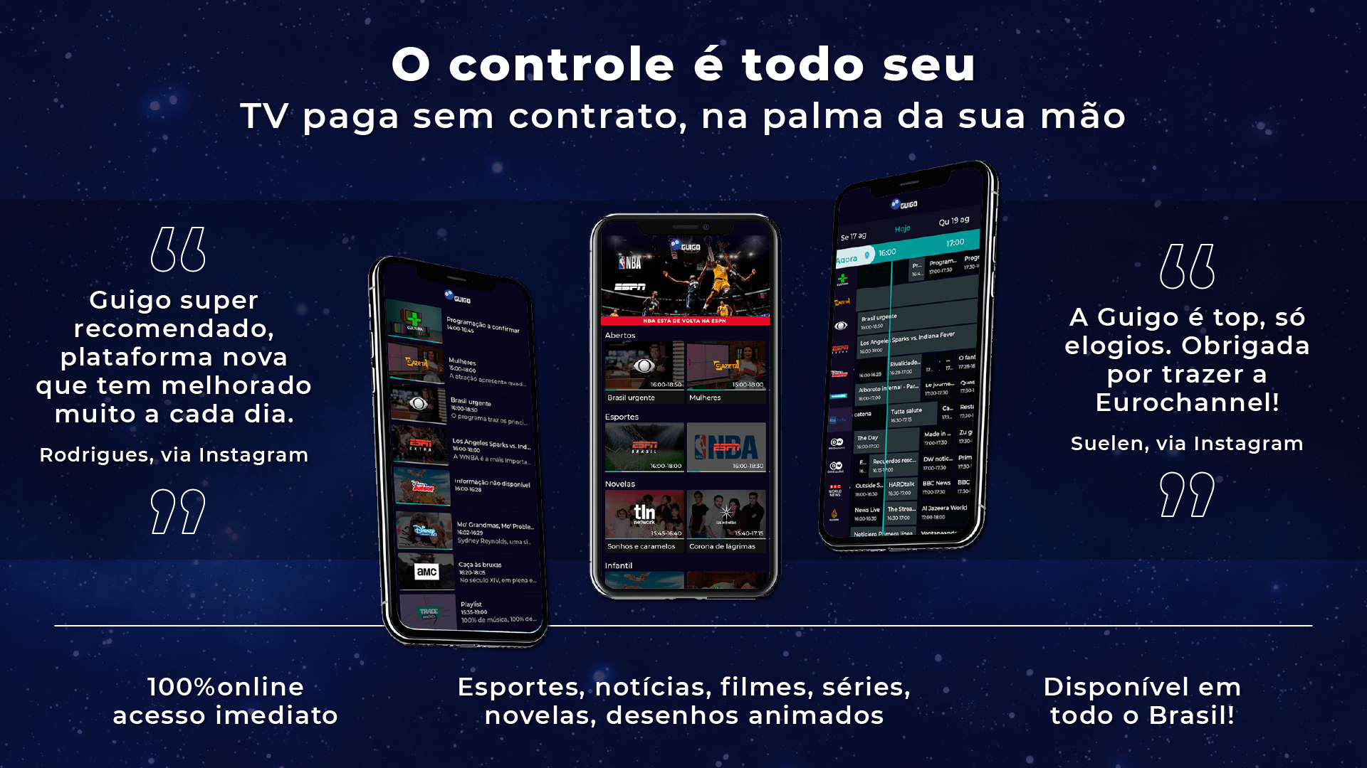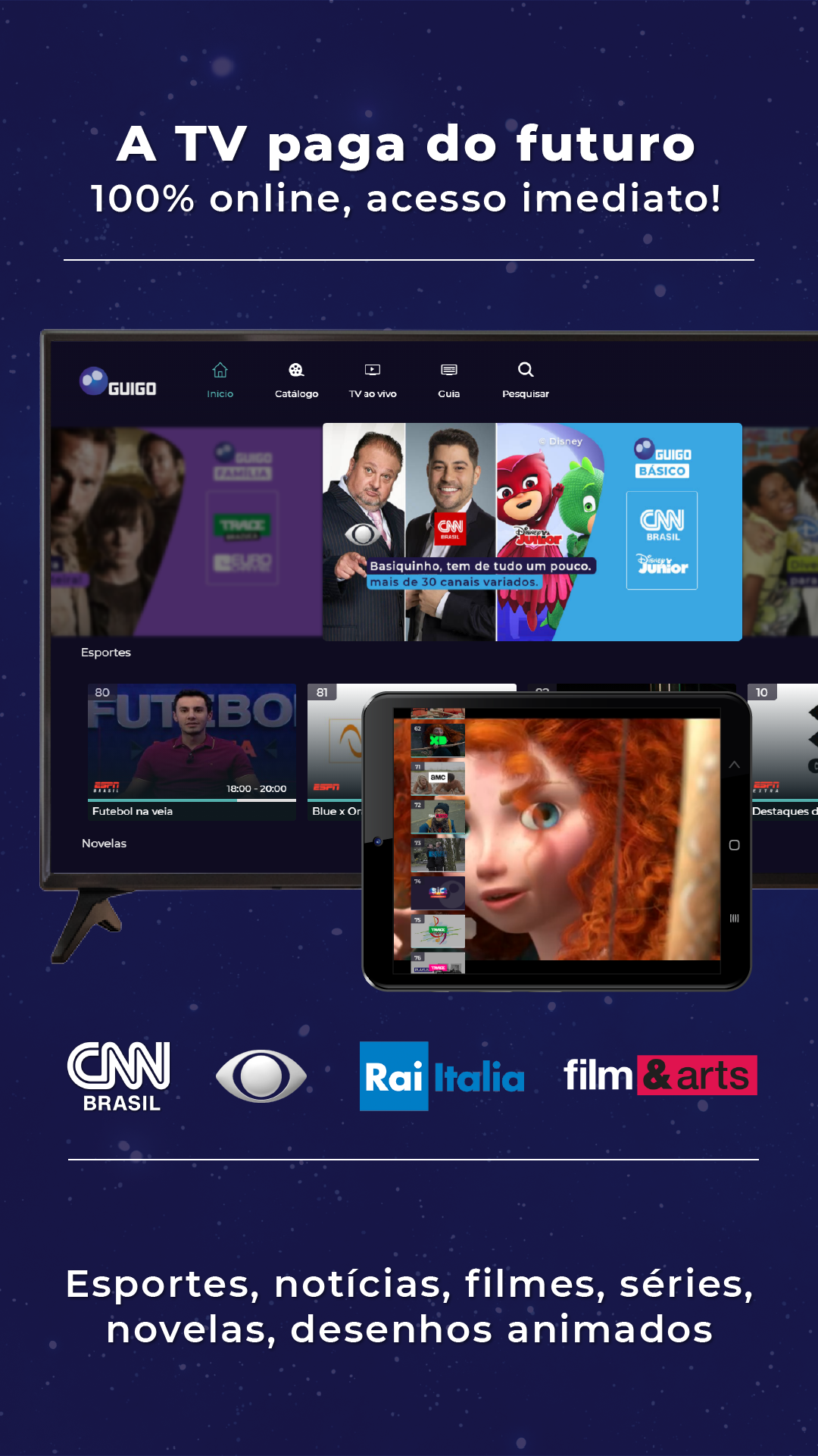 A Guigo TV é a primeira televisão por assinatura via internet do Brasil e 100% legalizada. Você pode assistir aos seus canais favoritos pelo app, no celular, tablet ou smart TV, ou pelo computador, acessando nosso site. Como é totalmente online, não precisa de instalação técnica. Após o pagamento, o acesso é imediato aos canais. Não temos contrato de fidelidade, você pode cancelar quando quiser, sem precisar pagar multa. Se é novo cliente, faça nosso teste grátis por 7 dias (não precisa cadastrar cartão)! A Guigo TV é a melhor alternativa para quem está cansado da TV a cabo. Além de poder ver seus canais em dispositivos diferentes, você também pode assistir de qualquer lugar do Brasil com sinal de internet - chega de ficar preso à TV da sua casa. Bem-vindo ao futuro da TV por assinatura! Com preços que cabem no bolso, a Guigo TV te dá a liberdade de assinar Pacotes com canais que realmente vai assistir. Veja as opções abaixo: Guigo Básico (33 canais) – R$7,90 Conteúdo: BAND, TV Gazeta, CNN Brasil, Disney Junior, ESPN Extra, Las Estrellas, BBC World News e outros 26 canais. Guigo Esportes (4 canais) – R$24,90 Conteúdo: ESPN Brasil, ESPN 2, ESPN e EI PLUS. Guigo Novelas (1 canal) – R$16,90 Conteúdo: TLN Network e o Catálogo de novelas mexicanas pra assistir quando quiser. Guigo Infantil (2 canais) – R$12,90 Conteúdo: Disney Channel, Disney XD e Disney Junior. Guigo Família (10 canais) – R$16,90 Conteúdo: AMC, Disney Channel, Disney XD, Film&Arts, Trace Brazuca, Trace Toca, Trace Urban, Trace Latina, SIC Internacional e Eurochannel. A Guigo TV é a única TV por assinatura do Brasil que tem contrato com a emissora Televisa, por isso você assiste com exclusividade os maiores clássicos e novidades das novelas mexicanas, dubladas e sem cortes, na TLN Network e também assiste ao Las Estrellas, um dos principais canais de entretenimento latino americano.