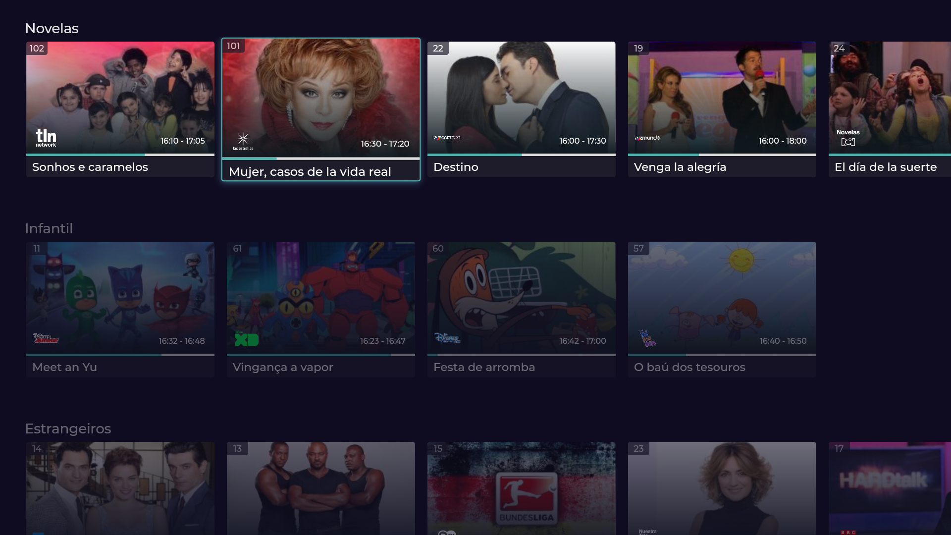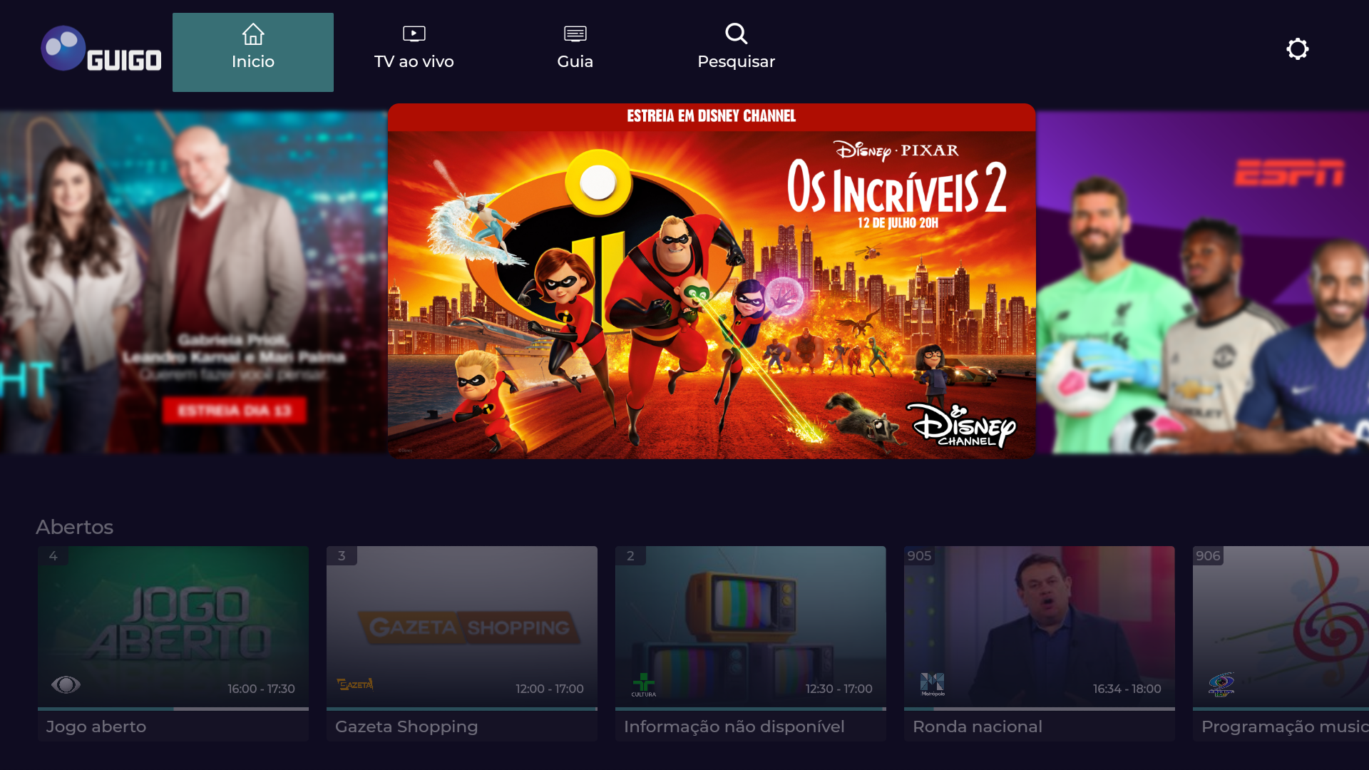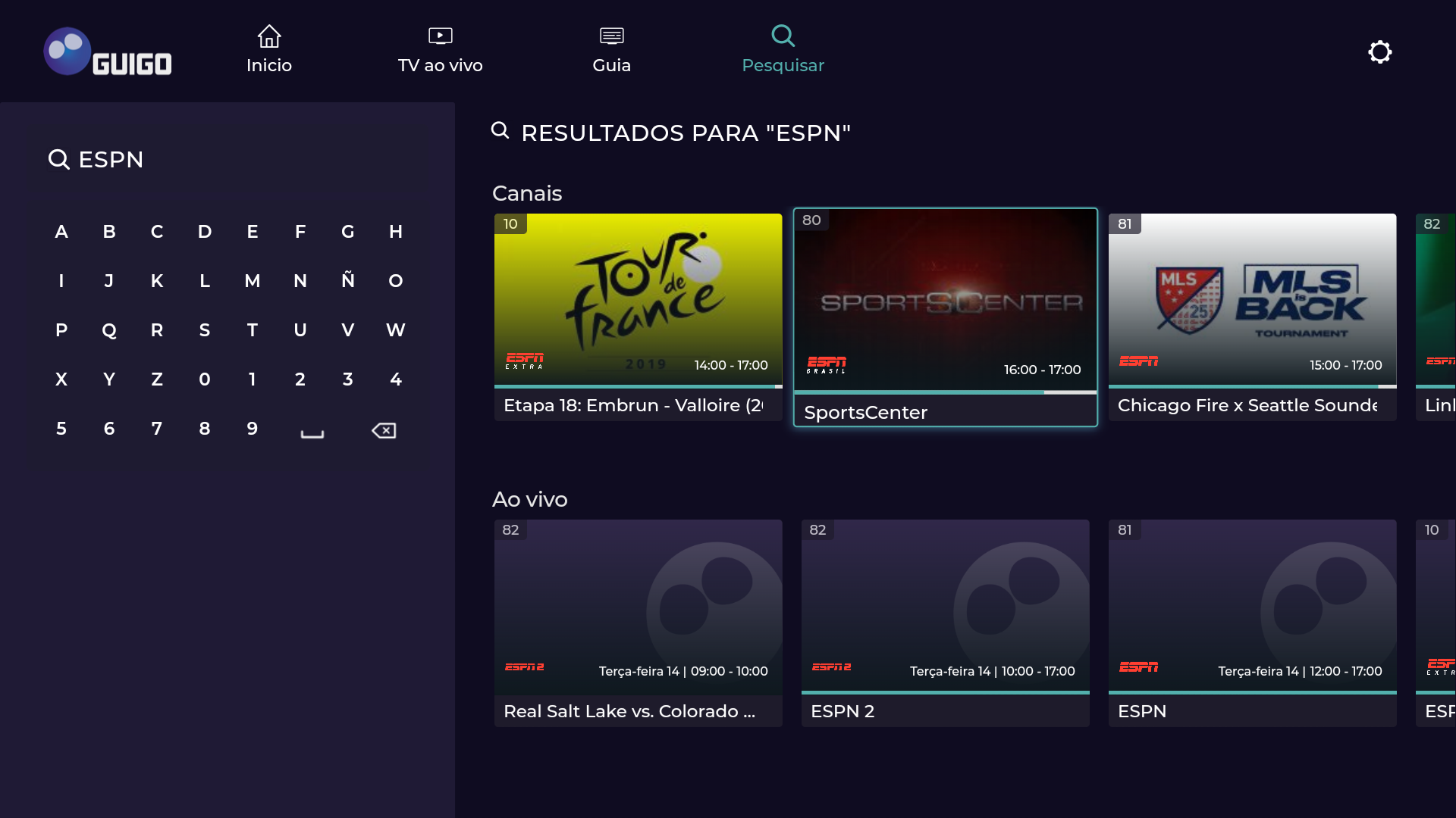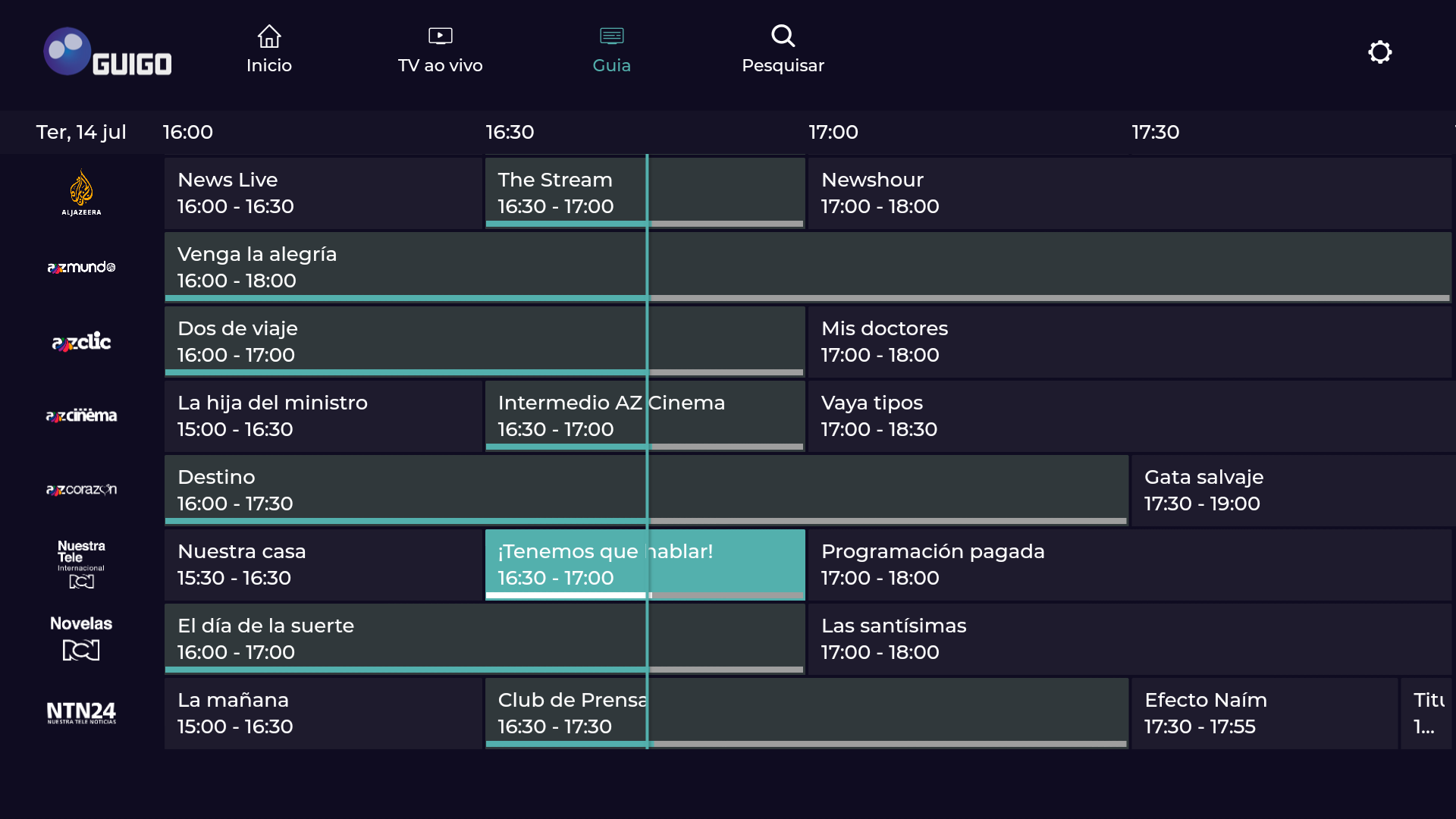 A Guigo TV é a primeira televisão por assinatura via internet do Brasil e 100% legalizada. Você pode assistir aos seus canais favoritos pelo app, no celular, tablet ou smart TV, ou pelo computador, acessando nosso site. Como é totalmente online, não precisa de instalação técnica. Após o pagamento, o acesso é imediato aos canais. Não temos contrato de fidelidade, você pode cancelar quando quiser, sem precisar pagar multa. Se é novo cliente, faça nosso teste grátis por 7 dias (não precisa cadastrar cartão)! A Guigo TV é a melhor alternativa para quem está cansado da TV a cabo. Além de poder ver seus canais em dispositivos diferentes, você também pode assistir de qualquer lugar do Brasil com sinal de internet - chega de ficar preso à TV da sua casa. Bem-vindo ao futuro da TV por assinatura! Com preços que cabem no bolso, a Guigo TV te dá a liberdade de assinar Pacotes com canais que realmente vai assistir. Veja as opções abaixo: Guigo Básico (33 canais) – R$7,90 Conteúdo: BAND, TV Gazeta, CNN Brasil, Disney Junior, ESPN Extra, Las Estrellas, BBC World News e outros 26 canais. Guigo Esportes (4 canais) – R$24,90 Conteúdo: ESPN Brasil, ESPN 2, ESPN e EI PLUS. Guigo Novelas (1 canal) – R$16,90 Conteúdo: TLN Network e o Catálogo de novelas mexicanas pra assistir quando quiser. Guigo Infantil (2 canais) – R$12,90 Conteúdo: Disney Channel, Disney XD e Disney Junior. Guigo Família (10 canais) – R$16,90 Conteúdo: AMC, Disney Channel, Disney XD, Film&Arts, Trace Brazuca, Trace Toca, Trace Urban, Trace Latina, SIC Internacional e Eurochannel. A Guigo TV é a única TV por assinatura do Brasil que tem contrato com a emissora Televisa, por isso você assiste com exclusividade os maiores clássicos e novidades das novelas mexicanas, dubladas e sem cortes, na TLN Network e também assiste ao Las Estrellas, um dos principais canais de entretenimento latino americano.