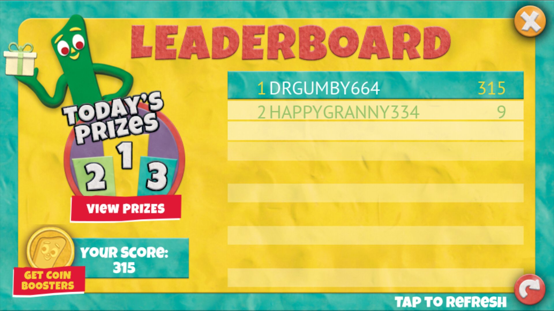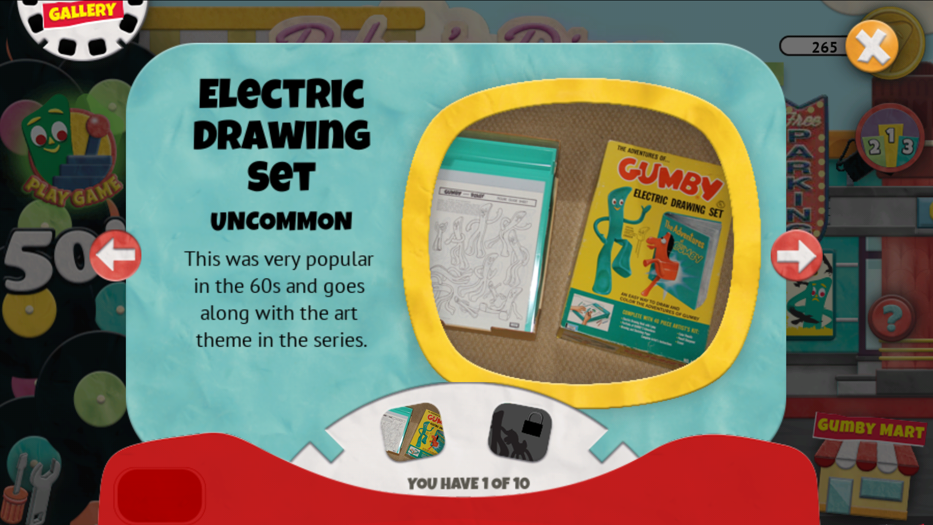 Since 1955, when the green clay boy named Gumby was born, millions of fans of all ages have followed his adventures through 234 episodes and a movie. Now, in Gumby’s World, fans can wander through a beautiful, fun, rendition of over 5 decades of Gumby, playing games, watching videos, finding collectibles and WINNING REAL GUMBY PRIZES in the only app where dozens of real prizes are awarded every day and shipped to winners COMPLETELY FREE!** There are 3 exciting ways you might get a prize mailed to you for free! If you’re very lucky, a randomly hidden prize notice may just pop-up while your playing! Find the prize in 1-minute and it's yours! Another way to win is to hit the Treasure Rooms and fill your viewmaster with collectibles and win the exclusive Trading Cards not found anywhere else on Earth! Finally is the Grand Prize Leaderboard where finishing in 1st, 2nd or 3rd place by earning the mostGumby Coins in a day awards prizes so big or so rare, Gumby can only give them away once a day! Along the way, you can enjoy the sites and pad your pockets with Gumby Coins watching video episodes including rare footage and behind the scenes clips! Gumby's World prizes’ include exclusive Trading Card series, Wall Graphics, LenticularPostcards, Sticker Sheets, and other unique prizes you can’t get anywhere else as well as traditional Gumby Bendables, Comic Books, DVD’s, Ceramic Pins, and other cool and amazing prizes. Remember, they are MAILED TO YOU FOR FREE! ** Play with Gumby, Pokey, the Blockheads, Professor Kapp and your favorite Gumby characters in the Gumby's World app and get some REAL GUMBY SWAG sent to your house** today! ** Mailed to addresses in the US only