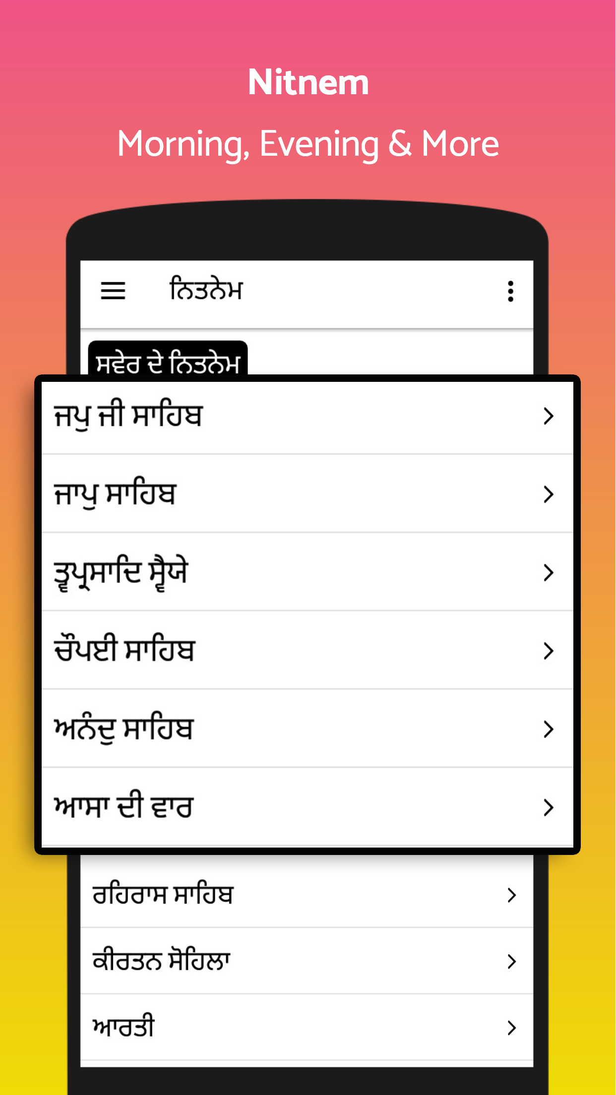 Japji Sahib, Jaap Sahib, Tav Prasad Svayye, Chaupai Sahib, Anand Sahib, Asa Di Var, Rehras Sahib, Kirtan Sohila, Aarti, Ardas, Barah Mahaa, Basant Ki Vaar, Dukh Bhajani Sahib, Laavan, Raag Maala, Ramkali Sadh, Salok Mahalla 9, Shabad Hazare and Sukhmani Sahib. You can listen nitnem audio too side by side when you are doing path.