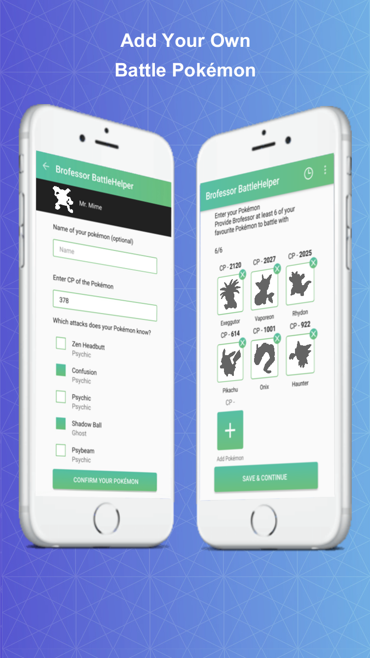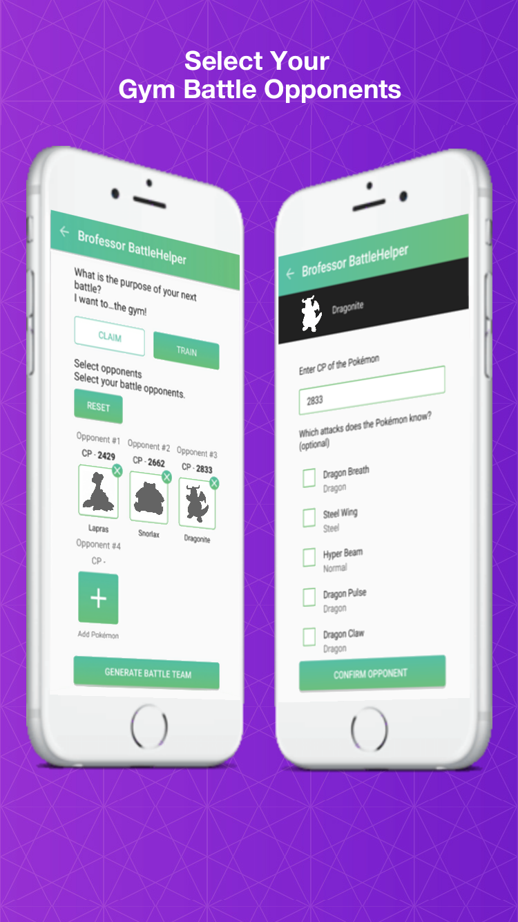 The Brofessor is your personal Pokemon GO Bro for you to become "the very best"! Create your perfect Pokemon Go gym battle team based on your own Pokemon! The Brofessor App is a gym team builder, gym battle helper and guide for Pokemon GO. The Brofessor will generate your perfect gym battle team for you, both for claiming or training a Pokemon Gym! This all-in-one app will help you to win 93% more gym battles & battle more gyms in a significantly shorter timeframe! Just add your own battle Pokemon and select your gym battle opponents for the Brofessor to generate your perfect gym battle team! Pokemon Go Gym Battle Team Builder Become “the very best” & the most dominant gym battler! The Brofessor App will always generate your perfect gym battle team for both claiming & training a gym. Easily add your own battle Pokemon, indicate what the purpose is of your next gym battle and select your gym battle opponents. The Brofessor will do the rest. In that way, you will always make the best picks for your gym battle team, no matter if it is for claiming or training a gym. Add Your Own Gym Battle Pokemon Search your Pokemon by name with ease. Just type in one letter and the app will show a list of all Pokemon containing that letter. Fill in the mandatory Combat Power (CP) and their assigned attacks for the Brofessor to generate your perfect gym battle team. You can even give your Pokemon a nickname! Select your Gym Battle Opponents Here too you can search your opponents in a totally intuitive way! Fill in their mandatory Combat Power (CP) and you are ready to go! The Brofessor App features • Gym Battle Team Builder • Gym Trainer & Gym Battle Helper • Great for Gym Battles • Your Are 93% More Likely to Win a Gym Battle! • You Win Gym Battles Up to 49% Faster! • All Pokemon are present! The app is updated to Include All Gen 2 Pokemon • Ability to Add Your Own Pokémon & Information • Helps you to become “the very best” in Pokemon GO -------------------------------------------------------------- If you are a Pokemon GO fan, we are sure that you will find our app EXTREMELY useful. We worked really hard to make this Pokemon gym battle guide and informatory fast, versatile and handy to all Pokemon GO players. -------------------------------------------------------------- Visit the Brofessor app website: www.BrofessorApp.com -------------------------------------------------------------- *Disclaimer* Legal Notices: The Brofessor App is an unofficial Pokemon Go tool app. It is not authorized or created by the creator of the Pokemon Go app or Pokemon games. Brofessor is NOT affiliated, approved, associated, endorsed, supported or sponsored by Nintendo, GAME FREAK, The Pokemon Company, The Pokemon Company International, Niantic and Creatures Inc. in any way. All rights reserved the Pokemon company and Ken Sugimori. All cartoon, manga and anime characters including but not limited to all respective names and images featured on this app are the property of their respective owners. If there is any concern please contact us directly and we will take immediate action.