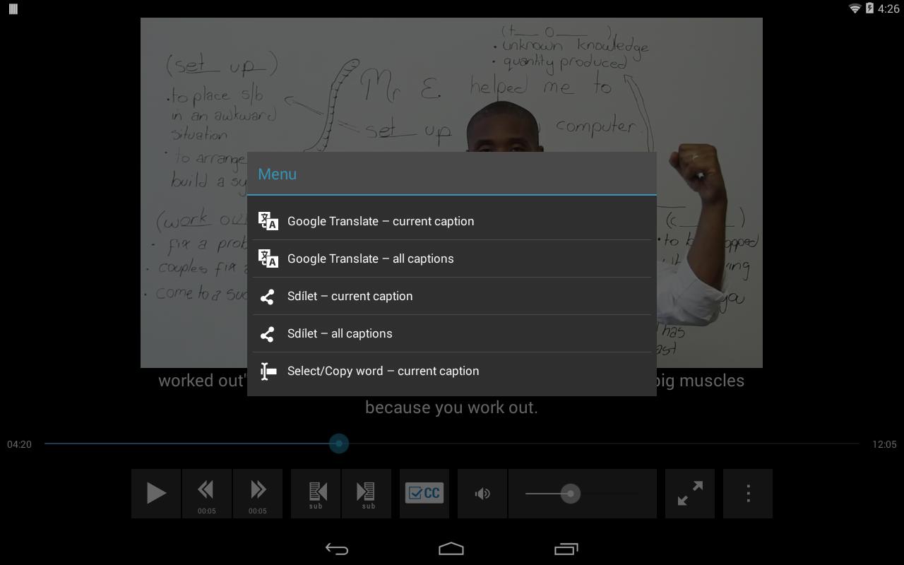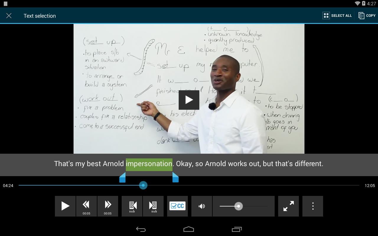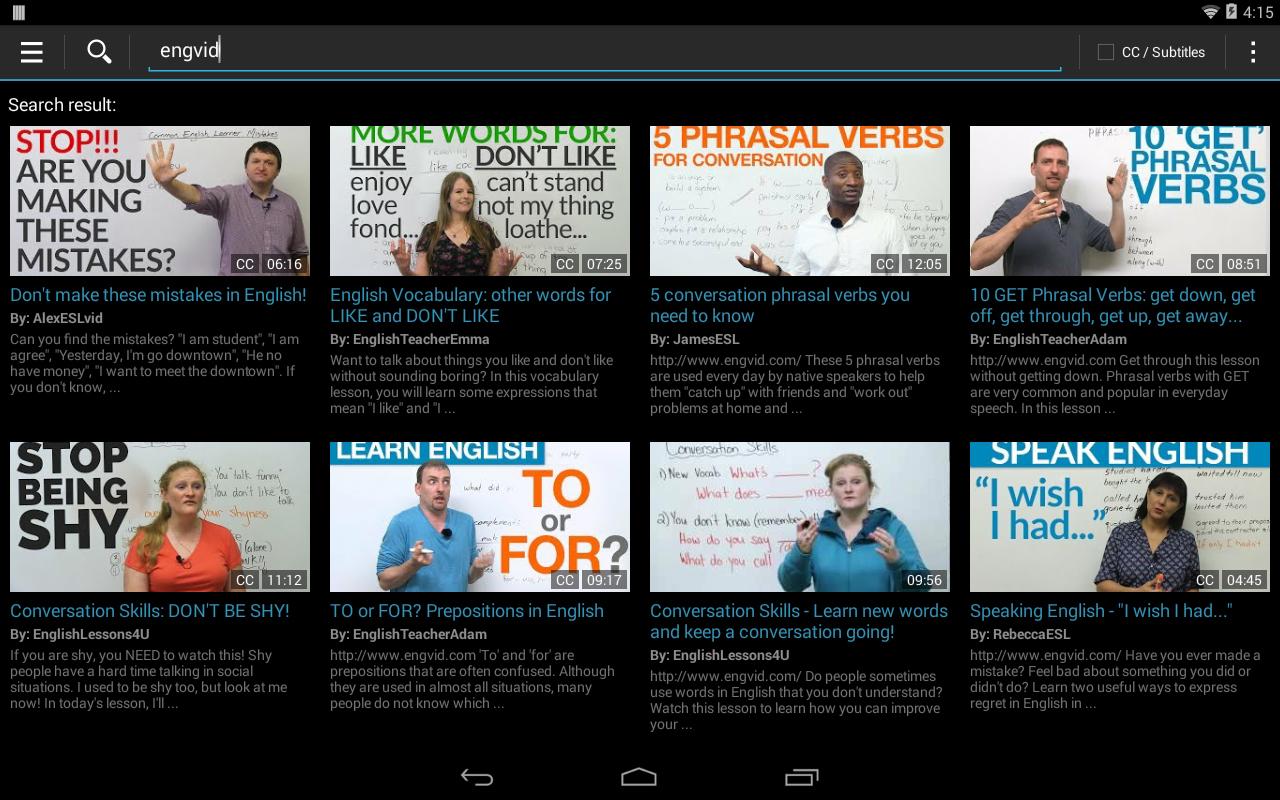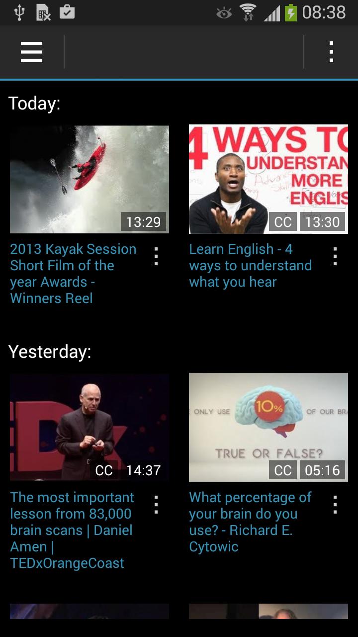 A player designed for absorbing information. The HandyTube Player enables comfortable playing of instructional and educational videos, lectures or language courses in an user-friendly environment. Save your time and nerves. 1) Jump in the video backwards and forwards by a interval. 2) Jump in the video backwards and forwards by a caption length. 3) Video jump functions available as gestures. 4) Play/Stop function by just one tap in all video view. 5) Work with captions the same as with usual text - selection of words, expressions and their copying or sharing. 6) Captions translation in Google Translate. 7) The caption is displayed outside the video view. 8) Position Marker - continues playing where the video stopped the last time. (For all videos in History) 9) Volume control directly in the application. 10) Rotation lock and prevent the screen from automatically rotation. 11) Video sharing with a link to current playing time. 12) Search results to only show videos with captions available. 13) Well ordered history. Known bugs: Double captions In some videos, standard YouTube captions can be displayed right in the video view. These captions cannot be turned off by the application HandyTube „CC“ button. Solution: 1) Running the video in YouTube player. (It can be launched right from the HandyTube application.) 2) Turning the captions off in YouTube player. 3) Switching back to HandyTube. 4) Ending the running YouTube application with the help of task Manager. This step is important! That means that leaving YouTube won’t do. 5) The video in HandyTube is without captions.