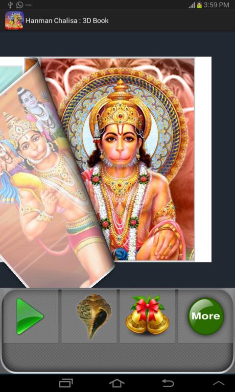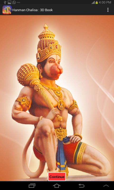 Hanuman Chalisa Audio & 3D Book. Personalize your mobile with Spectacular Divinity of Hindu Gods. Through this app, get a beautiful sparkling and shining image of Shree Hanuman. Enjoy 3D animated Hanuman Chalisa App for the android device for Hanuman. It is a must have app who believes in the power of Gods. Get devotional through this Hanuman Chalisa App. Hanuman is a Hindu deity, who was an ardent devotee of Rama according to Hindus legends. He is a central character in the Indian epic Ramayana, and also finds mentions in several other texts, including Mahabharata, the various Puranas and some Jain texts. A vanara, Hanuman participated in Rama's war against the demon king Ravana. Several texts also present him as an incarnation of the Lord Shiva. Worship Lord Hanuman the destroyer of all obstacles, right on your Android device. Install this 3D animated Hanuman Chalisa App. With Hanuman Chalisa & 3D Book App you can listen to Hanuman Chalisa and chant it. Jai Sai Hanuman!!!