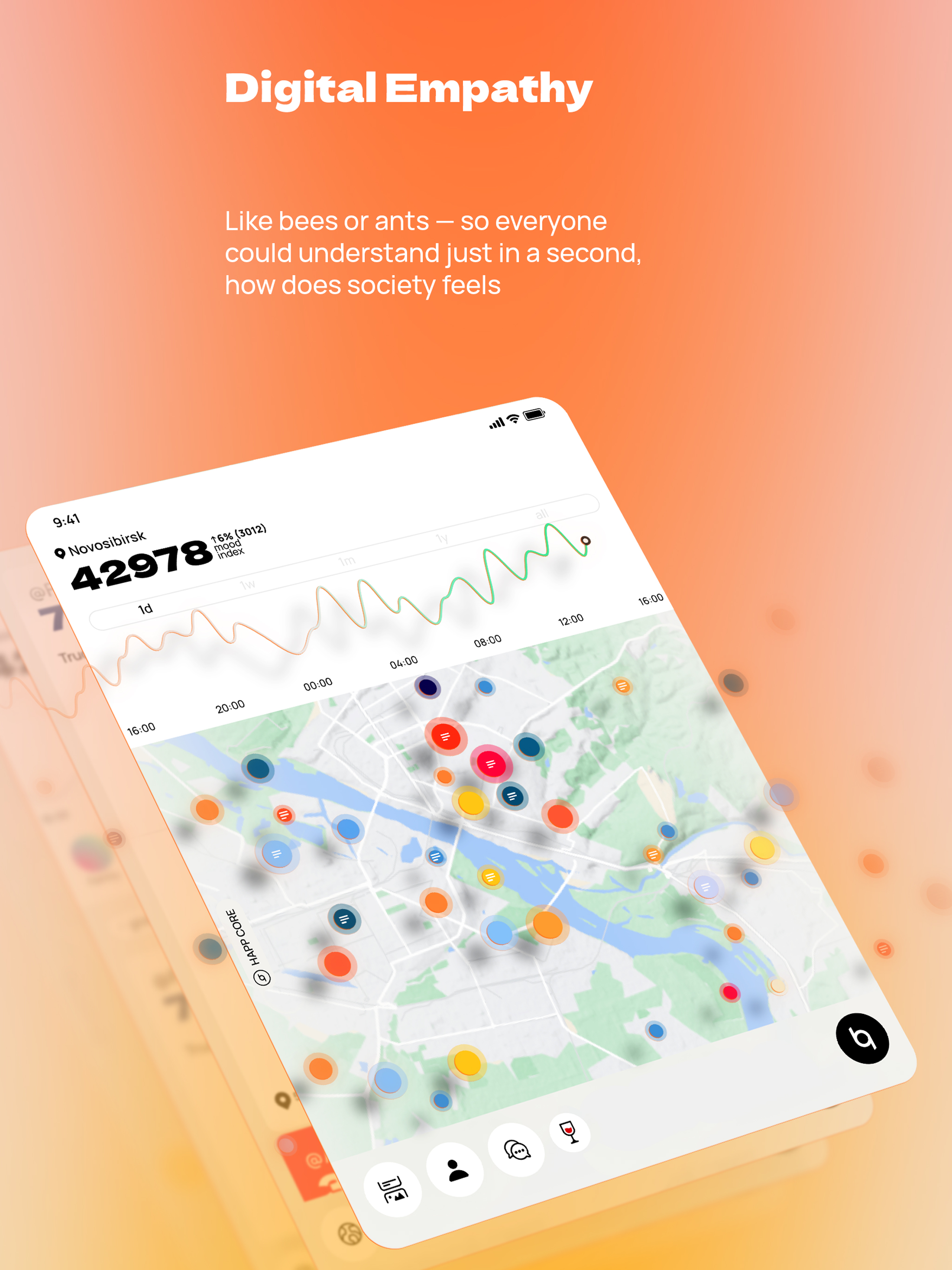 We believe that in days of new computerized and distant ways of communications, emotional connection between people deserves a special treatment. Especially between friends and family. Nothing can make your family more happy as a simple knowledge of you being happy, and vice versa. We represent a simple feature to stay emotional connected with those who matters the most: family, friends, may be colleagues, teammates.. Custom and collective happiness graph is the way to go. Take a minute for global look in geolocation happiness index terms: “Happ Core” — the ultimate social integrity and analytical tool to save the world — Pleasure to meet you! Social happiness graph. And we believe that happiness really matters. So we unite people around the world, to collectively reflect on the information, placing it on the happiness curve of the society. Remember recent annexation of Crimea by Russia, how did locals really fill about it? How do we know? Elsewhere from news media? Which is hell of reliability. Real-time happiness index being put on a graph and map, representing distributed information collected from local citizens and unchained of any government, could show us a real picture. Or US presidential elections? Could we have any substantial information but endless twitts and tv arguing, which will fall into oblivion not later than tomorrow. Is there any genuine tools made by history of humankind, that can sum up the chaos of words and video reels, may it be a numeral and a graph? Meet Happ Core. Needless to say of any ecological issues. Are rebellions and protests bringing fire and blood really look like innovative concepts? How far have we came from those that took place thousands of years ago. Petitions are better, right. Still may be its time for some social and cultural innovation in this fields. Map representation of social mood and happiness index curve itself grants people an opportunity to be heard — to show and fix, how specific political or ecological events makes them feel. Disputes and arguing are destructive and leed nowhere or worth with no analytical base. When the whole world is talking of building of a sustainable future, really how can we build anything sustainable for human beings, if we can measure how our decisions effect our lives — live of the society? Hell of a rhetorical question. All in all, what an opportunity to create a history attributed by a happiness parameter. To send a message, tell a story, warn of mistakes. Will it be really important for our descendants, how big a gdp of our countries once were? Won’t they once laugh on us? We truly believe the mood of a man plays an essential role in his life. As the collective mood of people plays a crucial role in the whole world, we are inspired by the idea to graphically present it in real-time on the map, similar to weather - so we create the geolocation mood index and its history. With all the gratitude for internet itself, making endless people closer to each other online, we feel, how at the same time internet is enlarging the distance between those, who appears to be nearby in fact. In this case we suggest our geolocation chat as a tool to get in touch with those who matters the most - people surrounding you. Imagine air filled with thoughts, attributed with a mood? - Here we go! - absolutely anonymous. Share your mood with the world! - Get a feedback or support someone in time of need! - share your thoughts and get to know the most relevant information around or on the other side of the planet. It is so much fun! - Take time and discover! Real-time dynamic heat maps of mood emissions, waiting for you, filled with users' messages and emotions. Think and analyze it! - Geolocation mood index is a very significant and aggregated indicator for any type of correlation from politics to weather. Check on how many people are at a place and how do they really feel. Watch on your neighborhood happiness index changes, plan your day and have fun!