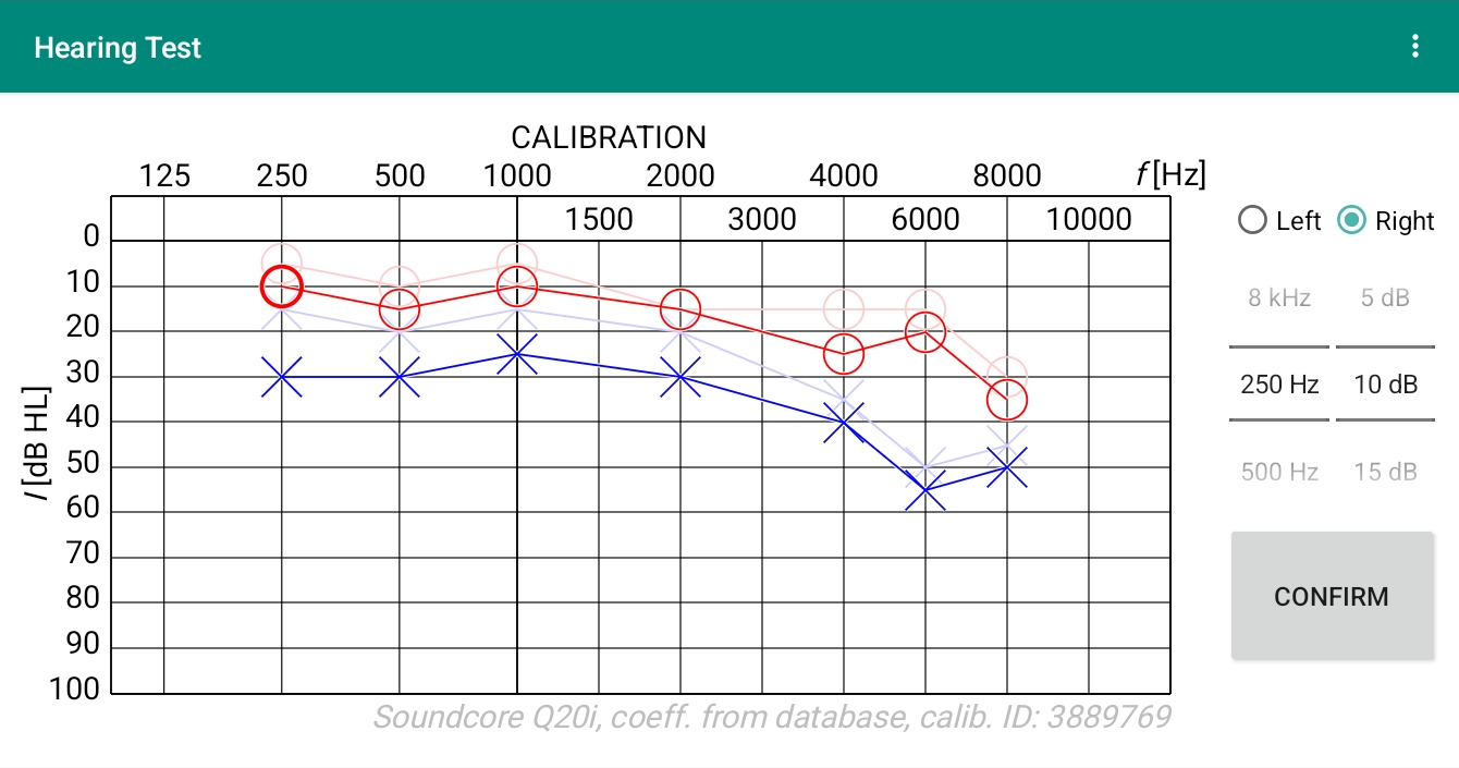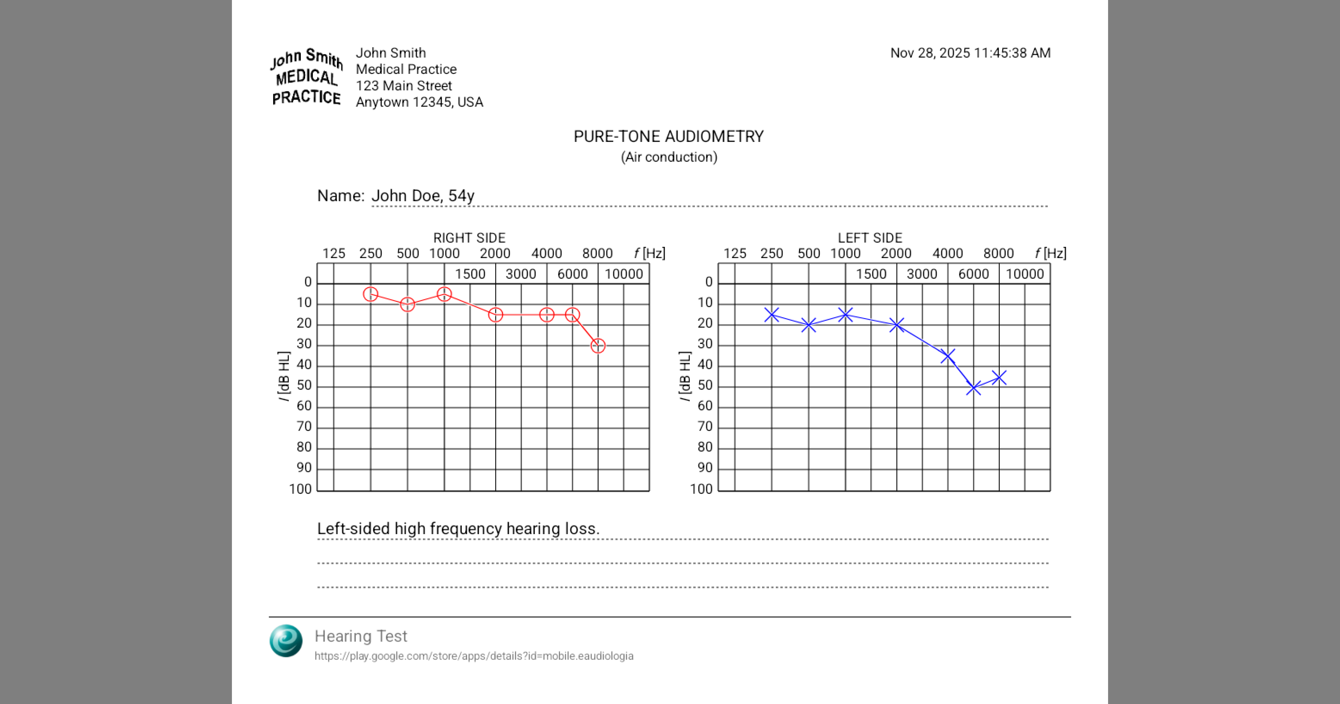 The app offers two basic hearing tests: pure-tone audiometry and the digits-in-noise test (digit triplet test) for assessing speech intelligibility. Pure-tone audiometry determines the degree of hearing loss as a function of sound frequency. The test consists of determining the quietest sound you are able to hear, thereby establishing your hearing threshold. The digits-in-noise test evaluates speech intelligibility and consists of recognizing digits presented in background noise. Features of the Hearing Test app: * pure-tone audiometry (using predefined calibration coefficients for manufacturer-supplied wired headphones or Bluetooth headphones), * digits-in-noise test for measuring speech intelligibility, * a noise meter for measuring background noise during the test, * device calibration (when no predefined calibration is available or when using headphones other than the manufacturer-supplied ones). Additional features: * high-frequency audiometry, * classification of hearing loss, * comparison with age-related norms, * printing of test results, * adding notes, * calibration adjustment (calibration coefficients can be adjusted based on your results obtained using a clinical audiometer), * verification of calibration coefficients. Pro version features: * local database (offline access to test results without connecting to the server), * synchronization (your test results can be stored in the cloud; the data are easy to recover, can be transferred between devices, and accessed on different devices), * manual stimulus control in pure-tone audiometry (you can turn the stimulus on and off manually during the test).