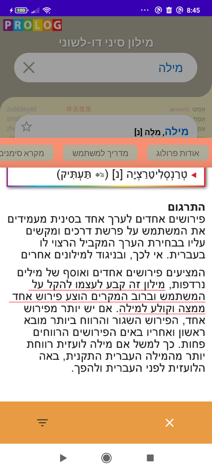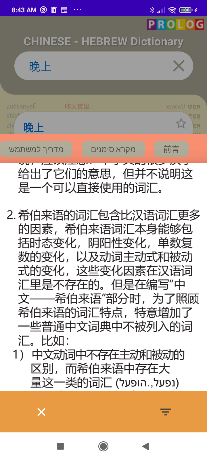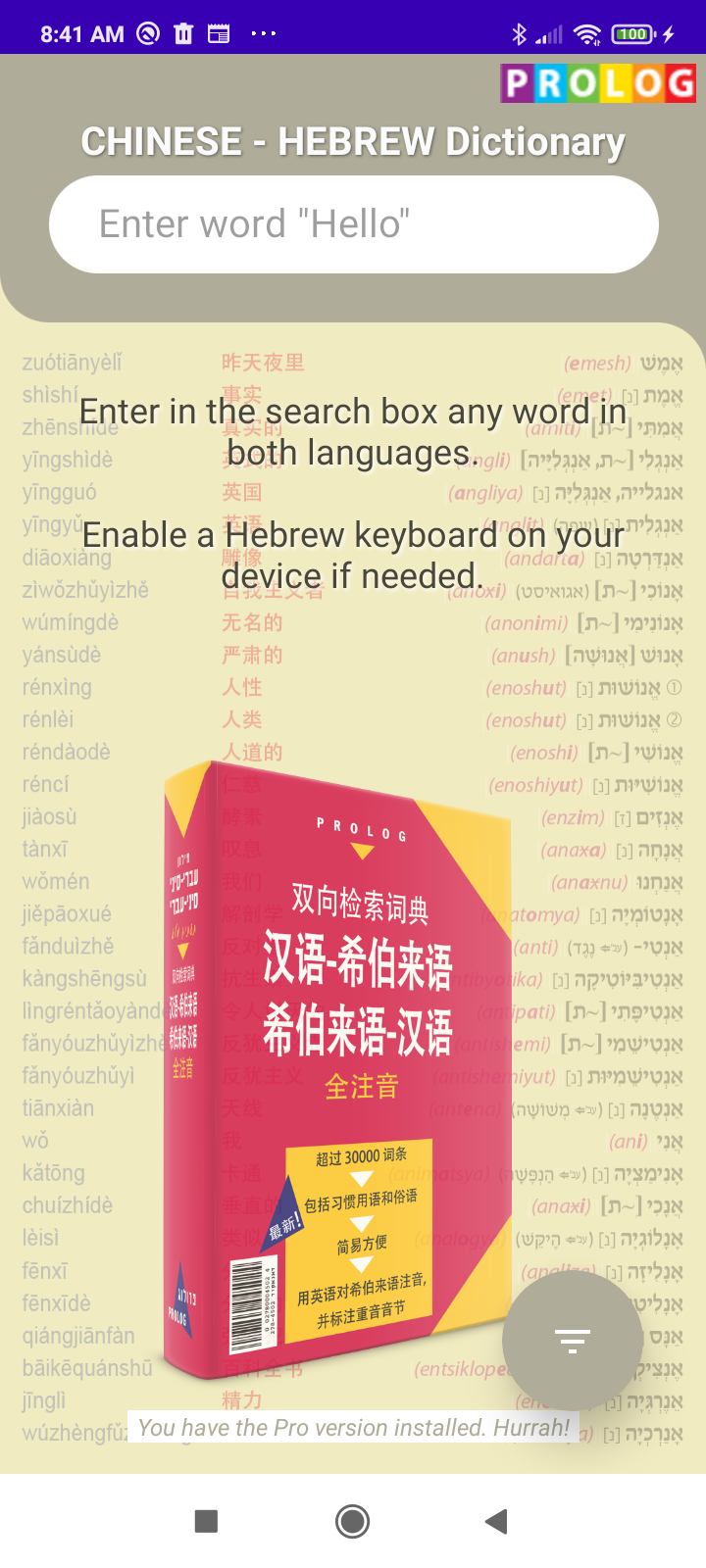 This comprehensive Hebrew Dictionary aims to give you the perfect translation match on every one of your search queries. It offers over 50000 headwords, phrases, and translations - ideal for everyday use, Hebrew students, language lovers... Main unique features: - Fully transliterated! (The translated word is written in the user's language); - Stressed syllables marked for precise and proper pronunciation; - Explanations are provided for choosing the desired translation; - Feminine form indicated; - Favorite searches can be tagged and quickly reviewed; (NEW!) - Completely offline. Prolog specializes in producing and developing dictionaries and language courses, and Hebrew teaching materials, for self-study and class learning, for over 33 years. Visit us prolog.co.il