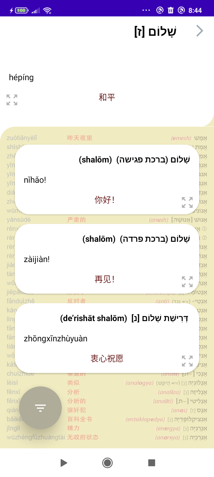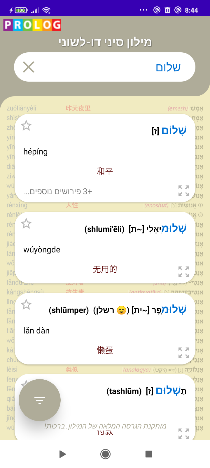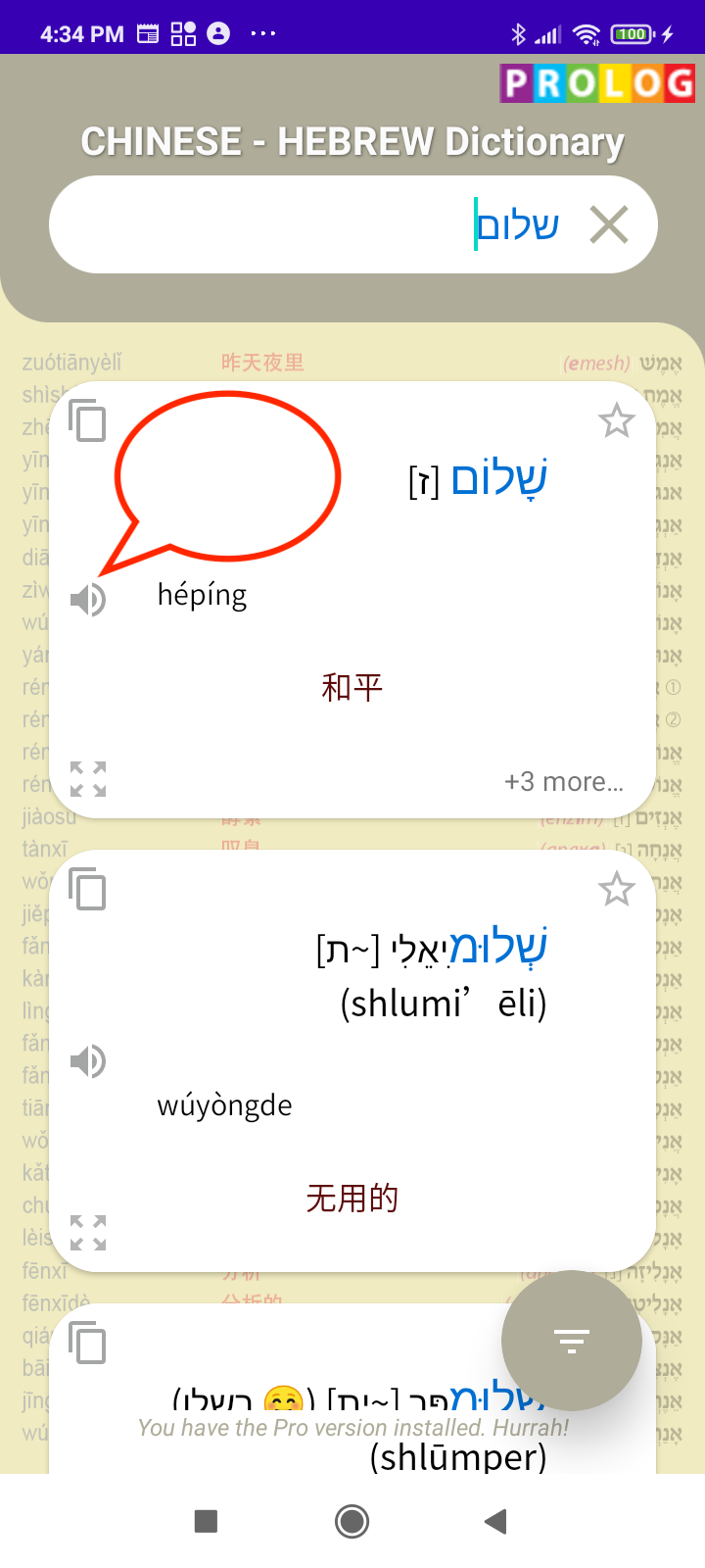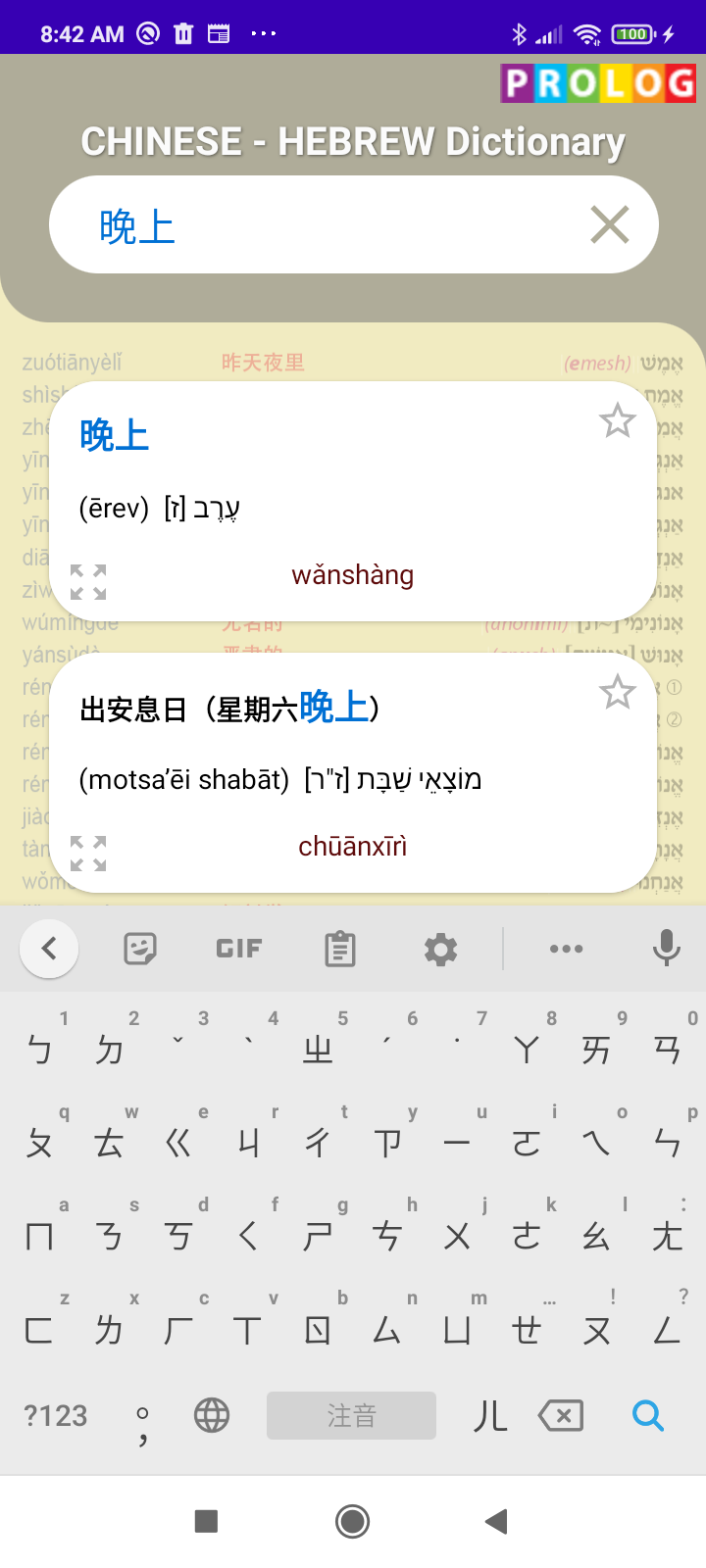 This comprehensive Hebrew Dictionary aims to give you the perfect translation match on every one of your search queries. It offers over 50000 headwords, phrases, and translations - ideal for everyday use, Hebrew students, language lovers... Main unique features: - Fully transliterated! (The translated word is written in the user's language); - Stressed syllables marked for precise and proper pronunciation; - Explanations are provided for choosing the desired translation; - Feminine form indicated; - Favorite searches can be tagged and quickly reviewed; (NEW!) - Completely offline. Prolog specializes in producing and developing dictionaries and language courses, and Hebrew teaching materials, for self-study and class learning, for over 33 years. Visit us prolog.co.il