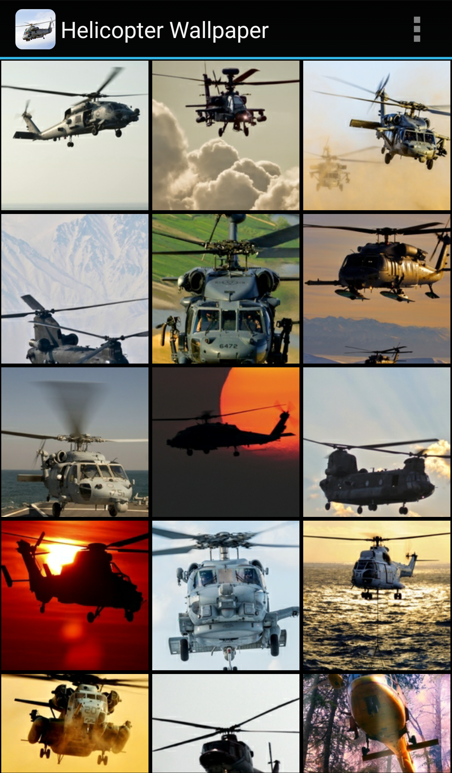 Helicopter wallpapers make the perfect new background for your phone or tablet! Helicopter enthusiasts will love these stunning chopper images! Powerful military choppers clearly demonstrate the strength and ingenuity of modern machinery. You’ll find awesome images of helicopters in flight as well as close ups of these beautiful aircraft on the ground. From civilian copters to the infamous Black Hawk military choppers and more, this app has them all! Aircraft are some of the most impressive machines built by man, and helicopters top the list for cool abilities! Using the amazing principles of aerodynamics, helicopters can not only soar through the air forwards, but also fly backwards and sideways, hover in mid-air, and land on a tiny spaces in the middle of a city! Helicopters are an incredible asset for military missions as well as medical rescue, police work, and backcountry wilderness access. See helicopters doing all of these things and more! Set your wallpaper to a remarkable helicopter image that shows the world your interest in these incredible aircraft! Whether you are a helicopter pilot for the Air Force or simply someone who aspires to experience the thrill of a helicopter ride, these wallpapers were made for you!