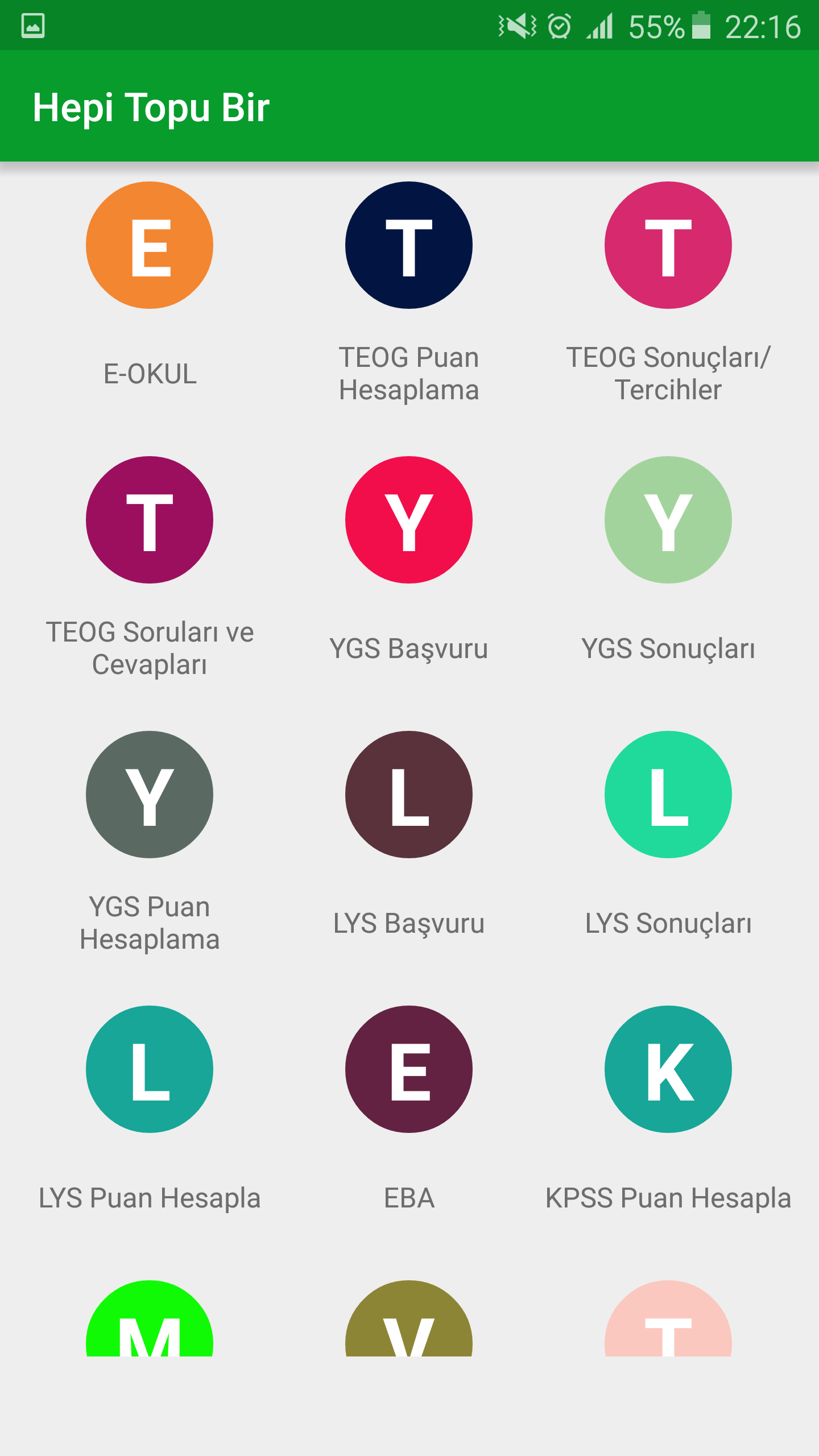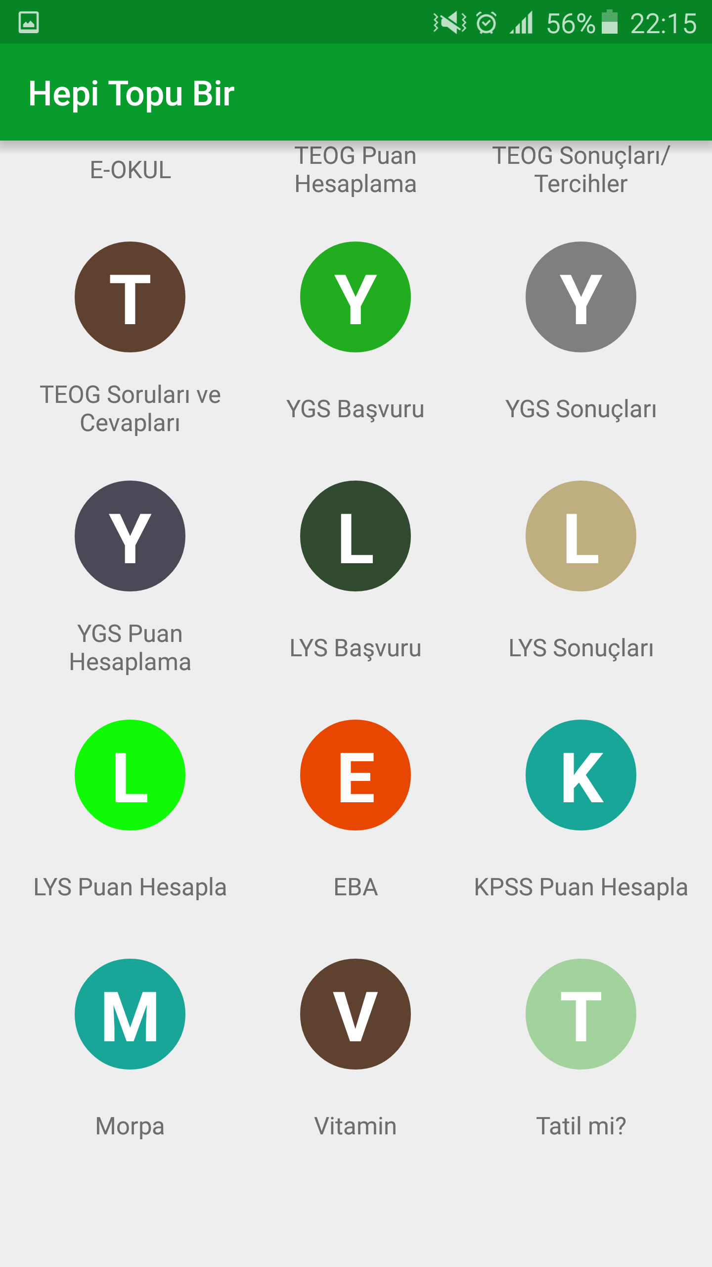 TEOG başvuruları mı var? TEOG sonuçları mı açıklandı? YGS sonuçları ne zaman açıklanacak? Yarın okullar tatil mi? gibi bir sürü sorusu olanlara tek tıklamayla istediklerine erişim imkanı sağlar. Telefonunuzda tek tuşla ilgili sayfalara hızlıca ulaştırarak zaman kazandıracak. Bir sürü gereksiz siteyle uğraşmadan anında cevabını görebileceksiniz. Unutmadan; bu uygulama sadece size kısa yollar sunar. Hayatınızın en kıymetli anlarını ve zamanınızı daha değerli kullanmanız için... E-OKUL Milli Eğitim Bakanlığı tarafından Milli Eğitim Bakanlığı Bilişim Sistemleri (MEBBİS) projesi kapsamında 2007 yılının Ocak ayında kullanıma açılmış olan bir okul yönetim bilgi sistemi web yazılımıdır. Bir öğrencinin okula kaydından başlayıp, mezuniyetine kadar olan tüm süreci içeren bir sistemdir. Eğitim Teknolojileri Genel Müdürlüğü tarafından geliştirilmektedir. Devlet ve özel ilköğretim okulları, anaokulları, özel eğitim kurumları, ortaöğretim kurumları e-okul sisteminde işlem yapmaktadır. Buradan karne notlarına, teog sonuçlarınıza erişebilirsiniz. Öğretmen, öğrenci ve veliler için... TEOG TEOG ortaokul 8.sınıf öğrencilerine yılda iki kere (Kasım 2015 ve Nisan 2016) uygulanan merkezi bir sınavdır. Bu sınavda Matematik, Türkçe, Fen Bilimleri, Yabancı Dil, Din Kültürü ve Ahlak Bilgisi, T.C. İnkılap Tarihi ve Atatürkçülük derslerinden ilgili konulardan sorular gelir. Bu soruların cevapları her yıl www.eba.gov.tr sitesinden yayınlanır. Sınav sonuçları ve okul tercihleri için bu uygulamayı kullanabilirsiniz. Ayrıca TEOG puan hesaplama, TEOG Yerleştirme Puanı hesaplama, 500’lük ve 700’lük puan hesaplama işlemlerini de yapabilirsiniz. YGS-LYS Üniversiteye hazırlıkta derslerine iyi çalışan, konu anlatımlarıyla, deneme sınavlarıyla ve ilgili soru bankası-kitapları çalışarak bitiren lise ve mezun öğrencilerin girdikleri en önemli sınav YGS ve LYS’dir. TM, MF ve TS alanlarında ÖSYM tarafından sorular sorulmaktadır. Her yıl üniversitelerin taban puanları değişebilmekte ve öğrenciler tercihlerini yaparken bunlara mutlaka dikkat etmelidir. YGS LYS sorularının tamamı açıklanmadığı için geçmiş yıllarda çıkmış sorulara erişebilirsiniz. YGS LYS puan hesaplama robotuyla da kendinize hedefler koyabilirsiniz. EBA - Öğrenci Girişi, Öğretmen Veli Bilgilendirme Sistemi ( VBS ) MEB tarafından geliştirilen Fatih projesinin resmi portalidir. E-içerik, görsel, video, ses, animasyon, sınavlar, dokümanlar, materyaller ve EBA ders içerikleri sunar. İlkokul, ortaokul ve lise öğrencileri, öğretmenleri kendi şifreleri ile sistemden ücretsiz faydalanabilmektedir. Kendi sınıfınıza uygun konu anlatımlarına ve soru çözümlerine erişebildiğiniz gibi dünyaca ünlü eğitim materyalleri (Khan akademi, Vitamin, Morpa, Okulistik) gibi ürünlere de erişebilirsiniz. Tatil mi? En güzel şey tatil değil miJ. Bu linkle okulların tatil olup olmadığını, kar tatili var mı, sömestre tatili ne zaman, bayram tatili kaç gün gibi tüm sorularınıza cevap bulabileceksiniz.