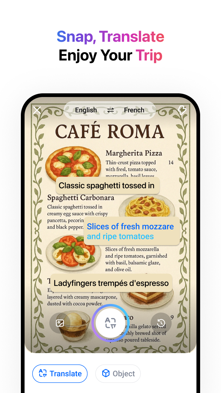 Translate PDF, Word, Excel files while keeping formatting. Translate menus, signs, manuals, and images instantly.