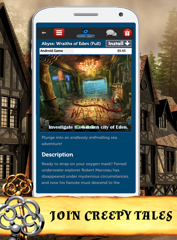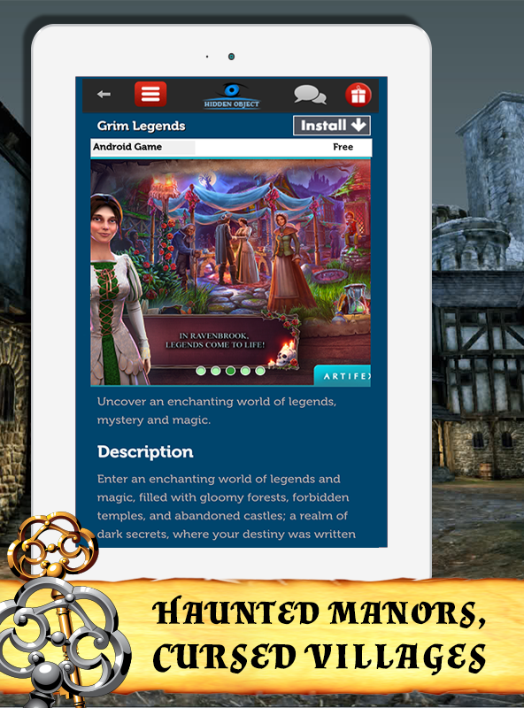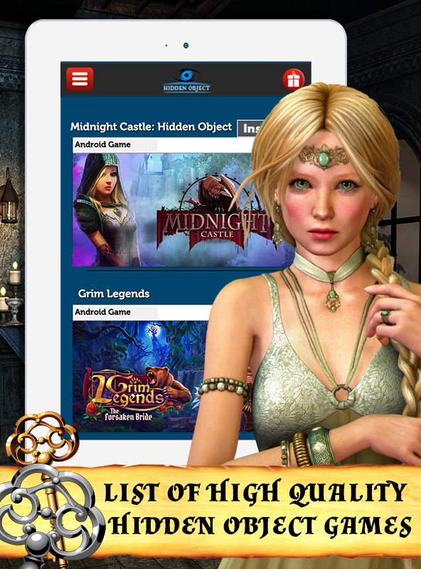Among thousands of hidden object games, we have found the high quality ones and listed in this app. Thanks to this list, you don't need to search games in the Android Market™. Besides the most popular hidden object games, we've selected the well-designed games. With 'install' button, you can get the games from the Android Market™ but you can't play them on the list. By the way, don't forget that you can view the list only when you have internet connection. We've picked the hidden object games offering you creepy gameplay with haunted manor, mysterious places. The list includes some of the mystery games and detective games. Adventure lovers and puzzle game lovers will admire this list. Creepy tales about ghosts, haunted places, mysterious gothic castles make these games more exciting. In some of them, just like you do in escape games, you try to escape from a dungeon by clicking everything to find keys and useful items. In some games, you are the role of a detective who investigate inhabitants and venue to solve the crime or the murder. Features: - The list of the well-selected hidden object games where you investigate haunted places and solve mysteries - Some kinds of detective games, escape games, and mystery games - File size under 1 MB - Scrolling terminal - Daily update to show you the new released games - Free and paid categories - Game trailers to indicate how to play - Star category including the best hidden object games selected by the editor - Friendly user interface design - Similar games recommended - Fast installing - Compatible with nearly all android versions of phones and tablets