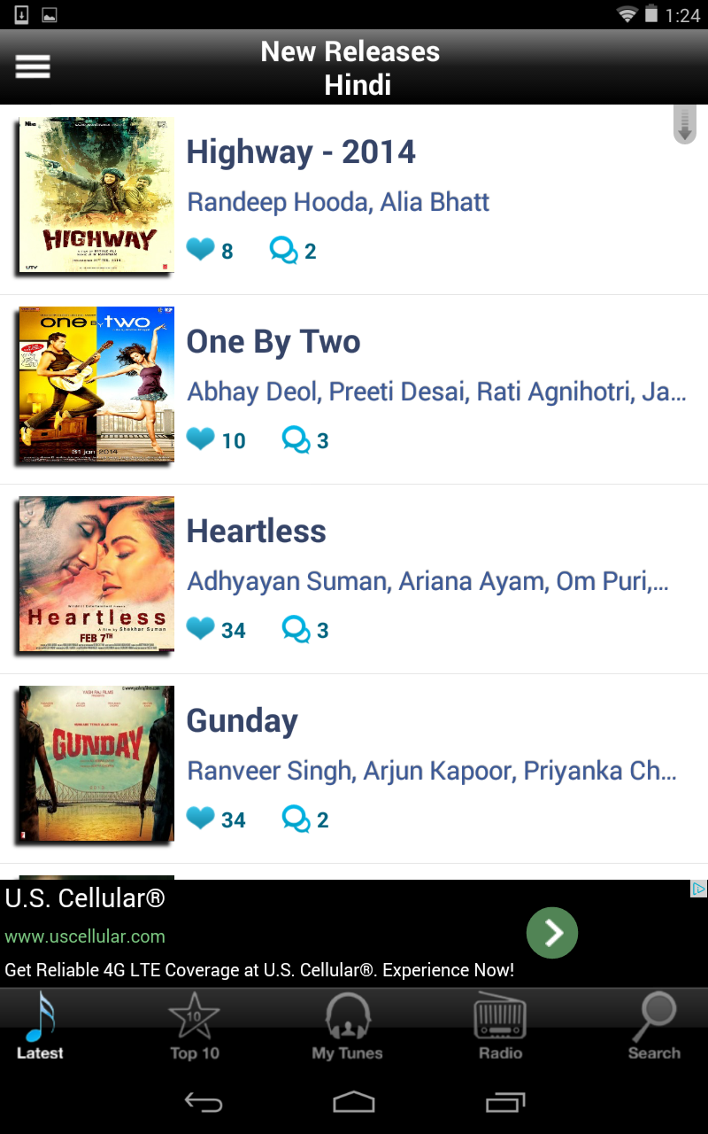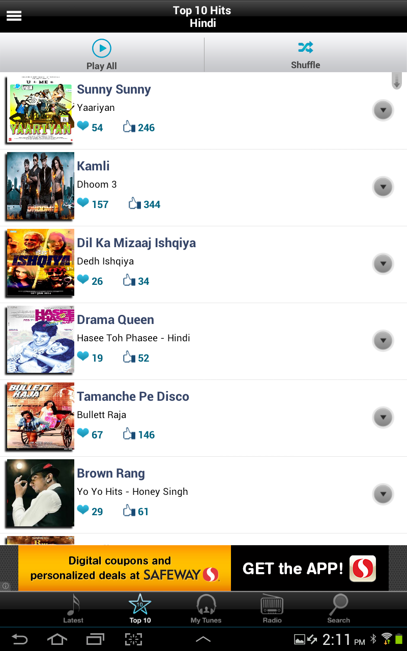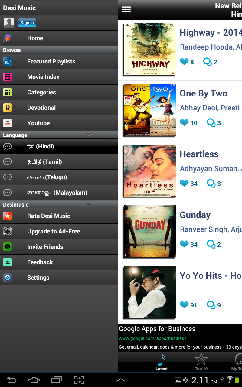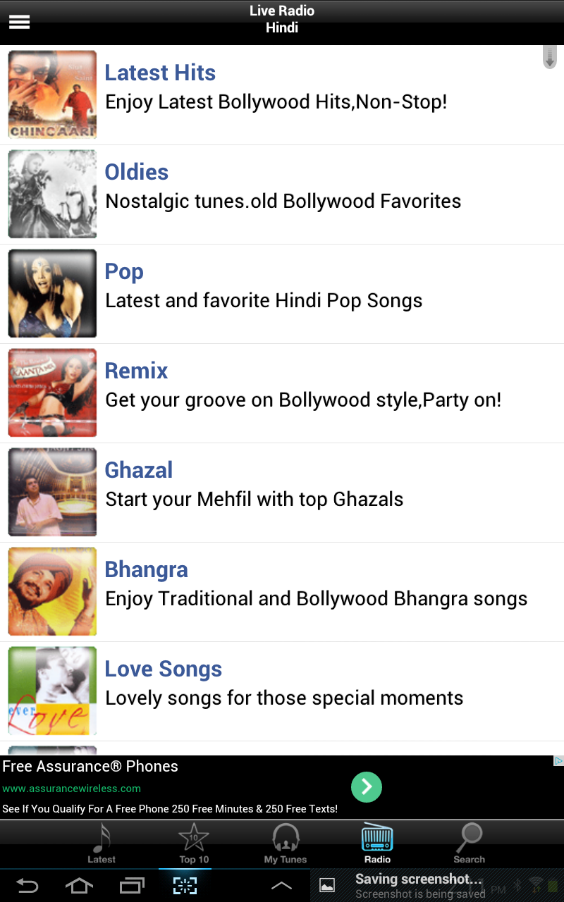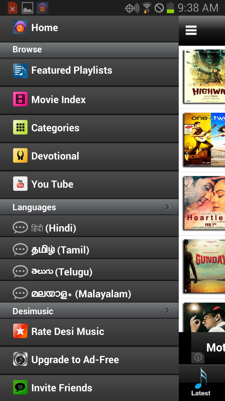A feature packed Indian music app featuring Hindi, Tamil, Telugu & Malayalam music selections! Indian, Bollywood music featuring language specific New Releases, Top 10 songs, Live Radios and Devotional albums. User comments and ratings are at your fingertips. Click on Facebook Connect and instantly share your joy with friends. Here is the mega list of features included: ♪ Hindi, Tamil, Telugu & Malayalam - choose your language to display language specific New Releases, Top 10 songs, Live Radios and Devotional albums ♪ Instantly view full song lyrics from player ♪ Create playlists of your favorite songs ♪ Add albums, songs and playlists as favorites ♪ View and submit song ratings and comments ♪ Most popular Top 40 songs are now at your fingertips ♪ Browse through numerous categories including compilations, pop, remix, ghazals, love songs, oldies, karaoke, Bengali, Gujarati, Marathi, Kannada, Carnatic, Bhangra ♪ Awesome Devotional section categorized by Deity and language ♪ Search for songs by Album Title, Song Title or Playlists ♪ Facebook Connect. Share your listening enjoyment with all your Facebook friends. Tell them how much you love the song and your Desi Music App If you're not convinced yet, read our reviews! * Reviews * * This application is just Amazing. Even the clarity of the songs are great. I just love this application a lot. I'm able to keep myself updated abt the new releases on 4 languages though I'm in Singapore. 5 stars........ - Rajashekar (Singapore) * I don't normally write apps reviews, but I had to give it for this one, very nice clean app, brilliant sound quality, music available in 4 different languages!! Simply great for FREE app!! Get it guys! - Sam Karwal (UK) * Love the collection. I have tried some other apps. But this app is mind blowing. Great collection, great streaming, great sound. - Animusic (USA)