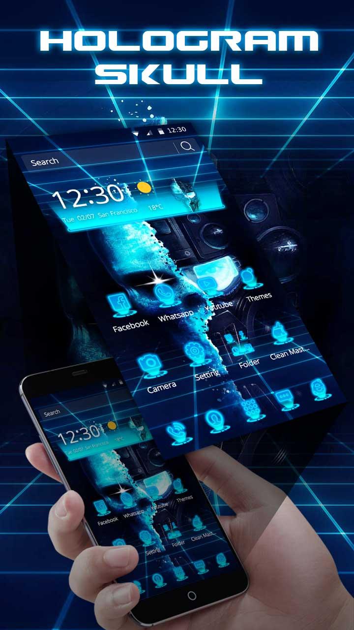 You can get Hologram Skull phone theme with holographic technology skeleton live wallpaper and blue neon skull lock screen and hologram space icons pack! Hologram Skull is an Android mobile theme with 3D effects, 3D weather, delicate app icon packs and neon blue space wallpaper. Hologram Skull Theme is supported on most Android devices. Install the theme for a 3D home screen and to make your phone look coolest!