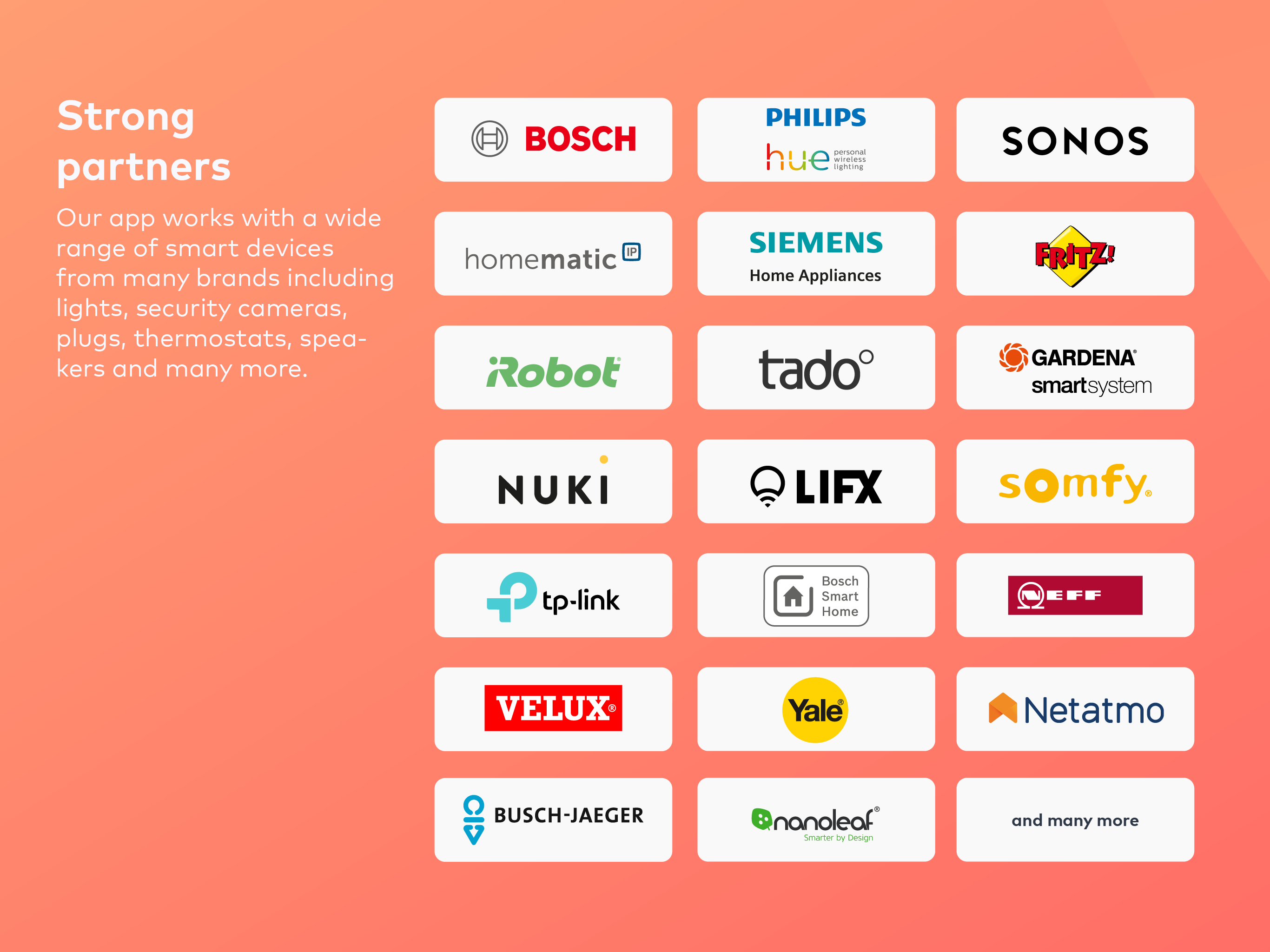 MORE CONVENIENCE, COMFORT, AND EFFICIENCY FOR YOUR SMART HOME Dive into the world of Home Connect Plus. No matter what smart home device, no matter what brand – with the Home Connect Plus app you can quickly and easily design your personal smart home. And you don’t have to be a technology expert. With a user-friendly interface, you can connect all your devices and systems, even those from different brands, to create your own individual smart home. SMART HOME – MADE EASY Simple, intuitive, and free: no subscriptions, no in-app purchases. Download, connect compatible devices, and get started. The Home Connect Plus app serves as a single control unit and notification center for your smart home. Simply your app for all smart home devices EASILY CONNECT DEVICES Whether it’s smart shutters, heating thermostats, plugs, security cameras, or simply a smart entertainment system with smart speakers, and corresponding lighting – Home Connect Plus offers you a simple solution to centrally control your entire smart home system. In the future, all your smart devices from different brands will converge into a single smart home solution under a uniform and easy-to-use interface. At the heart of the app are customizable automations that allow you to better adapt your smart home devices to your habits. MAKE YOUR LIFE SMARTER Customize the app and the interaction of your smart devices to your personal needs and everyday situations. By automating your devices, you gain time for the things that are really important to you. APP FEATURES: BOARDS Home Connect Plus gives you maximum creative freedom. Create individual boards according to your taste: choose your favorite color, find an illustration you like, or invent your own names for your personal home automation. Sort your smart devices by function or time, and choose your favorites. CREATE AUTOMATIONS With the app you can create automations very easily and intuitively. Try it out – it’s really fun! The result is an ideally coordinated interaction of your smart devices: everything is controlled with just one click or automatically at a certain time. CONNECT DEVICES With Home Connect Plus, you can keep an eye on the most important functions of your devices at all times and control them conveniently from a single app. MORE TO DISCOVER Find out how Home Connect Plus can make your home even more comfortable, secure, and efficient. In the “Discover” section, you can always stay up to date on the topic of smart homes and find new smart home ideas. SMART POSSIBILITIES: • Central operation: control smart devices and home automation with just one app. • Connect and automate smart lights, shutters and blinds, or the entertainment system • Smart heating and thermostats: be clever, use smart temperature control – and save money in the process • Smart alarm systems and surveillance cameras: always have everything under control • Important push messages directly to your smartphone • More garden comfort with smart garden tools • Smart home doorbell and garage: keep an eye on your smart home via livestream • Smart household appliances: vacuum cleaner robots, along with ovens and stoves, support you in everyday life • Support: Home Connect Plus provides competent assistance if you have questions A SELECTION OF OUR PARTNERS: • Bosch Smart Home (Outdoor siren and water alarm not supported) • Bosch Home Appliances • Bosch Lawnmowers • Bosch Thermotechnology • Bose • Buderus • Busch-Jaeger • DoorBird • Easee • FIBARO • Flic • FRITZ! • Gaggenau • hansgrohe • Home Connect • Homematic IP (CCU3 not supported) • iRobot • Ledvance • LIFX • Liebherr • myStrom • Nanoleaf • Netatmo • NEFF • Nuki • Philips Hue (motion sensor not as trigger supported) • Samsung Home Appliances (Smart TVs not supported) • Siemens Home Appliances • Somfy • Sonos • TP-Link • Vaillant • VELUX • Yale • Yeelight See the full list of our partners: www.home-connect-plus.com
